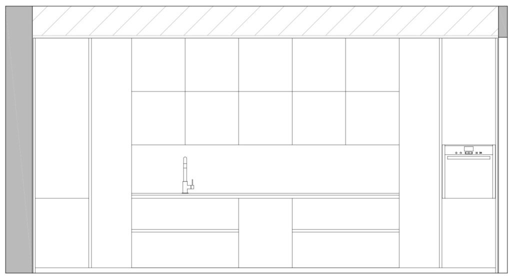 Come prima, la cucina si completa tramite l’uso di quattro colonne, disposte in modo simmetrico: da un lato dedicate a dispensa e forno, dall’altro dedicate al freddo, quindi congelatore e frigo.