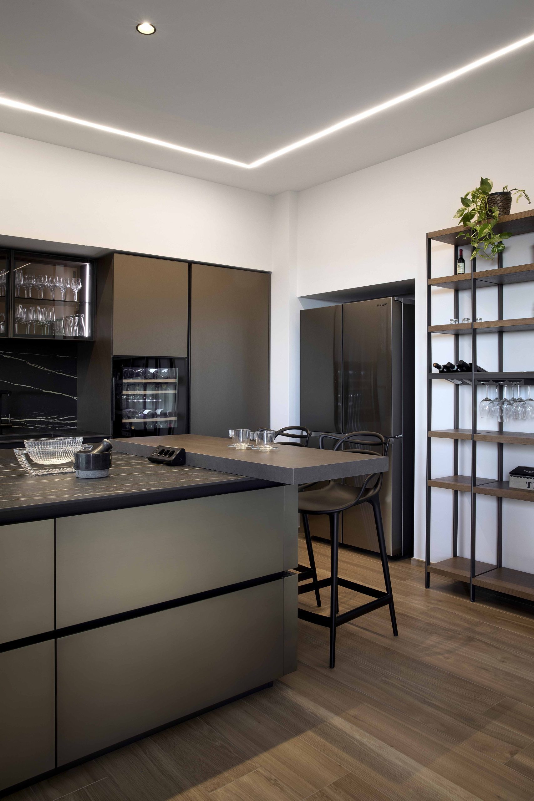 Le gole di luce e le nicchie retroilluminate contribuiscono a disegnare un’atmosfera calda e sofisticata.