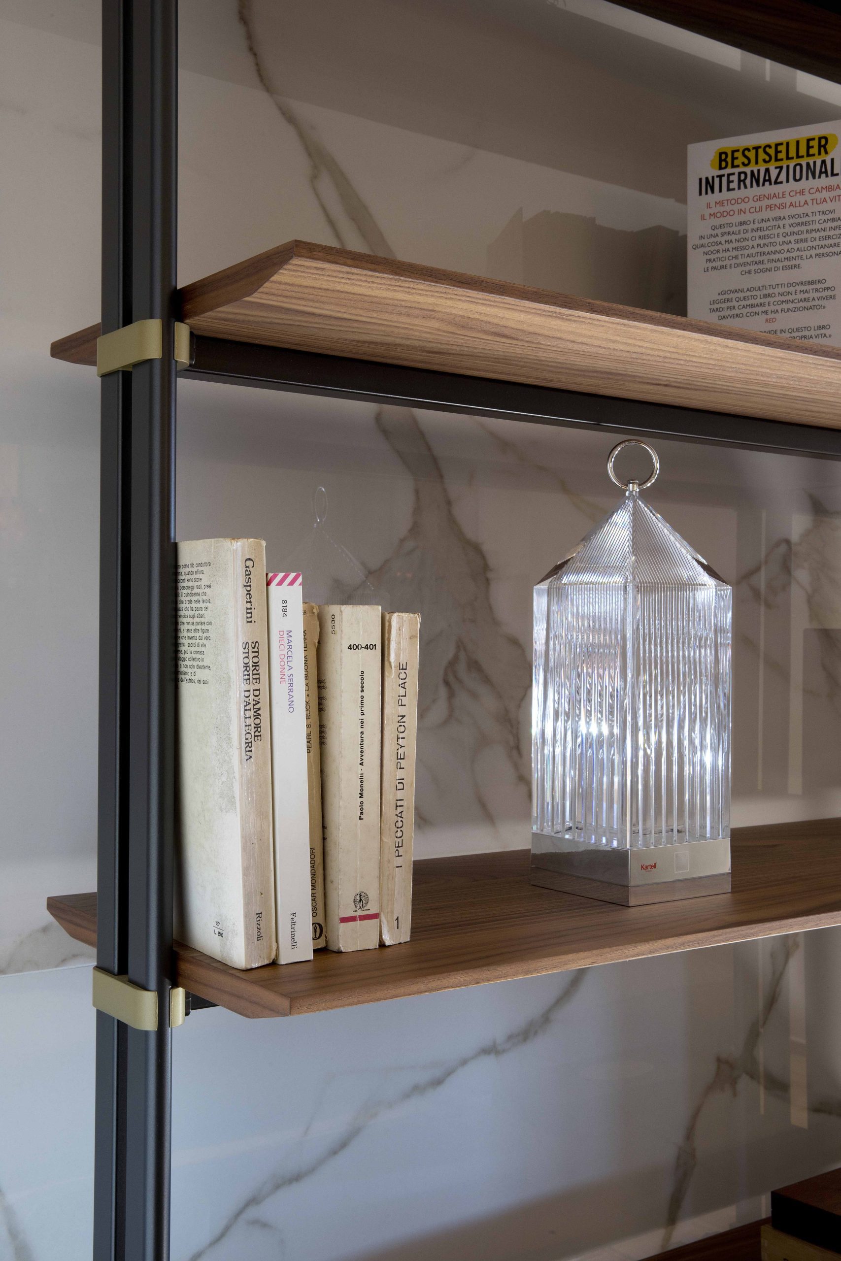 Elemento protagonista è la libreria Roll di Bonaldo, un sistema modulare sospeso e flessibile, che arreda con eleganza senza appesantire.