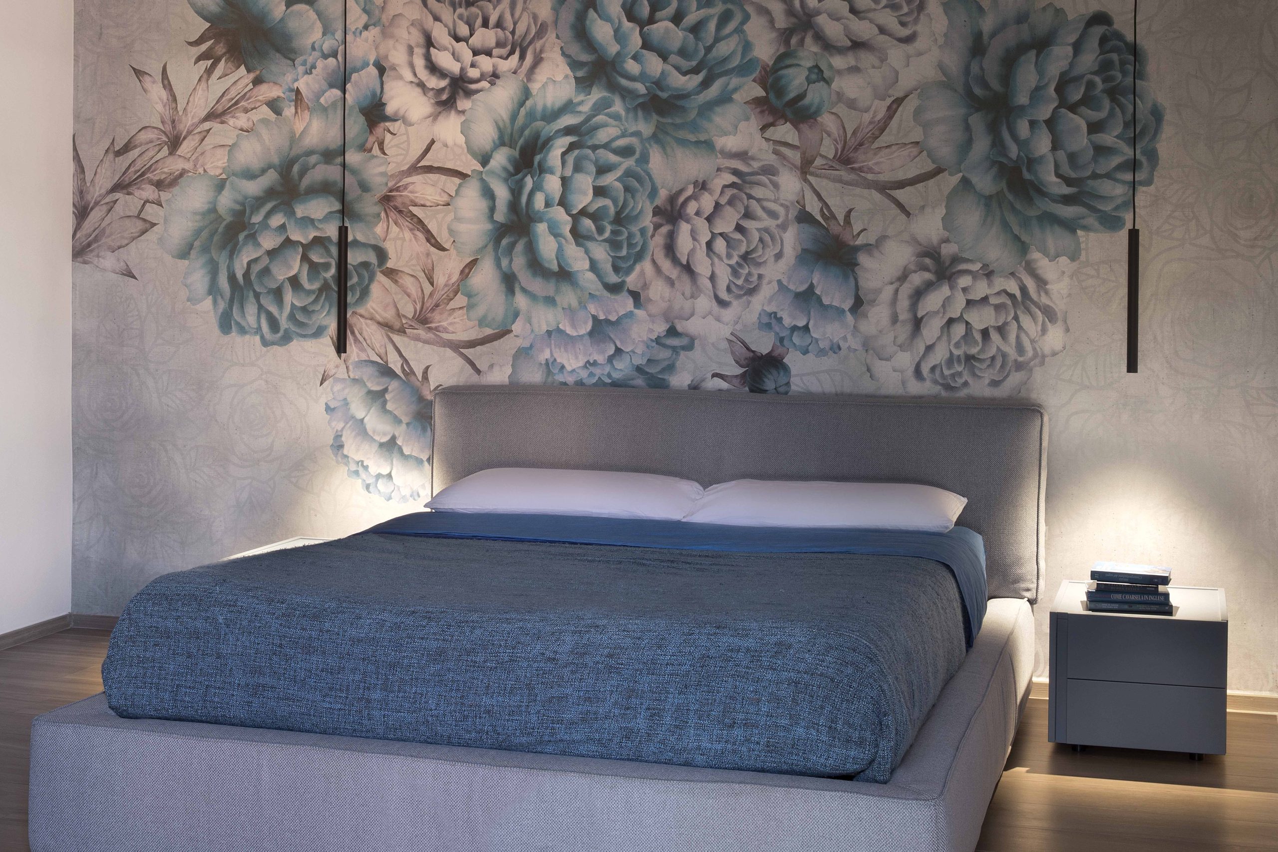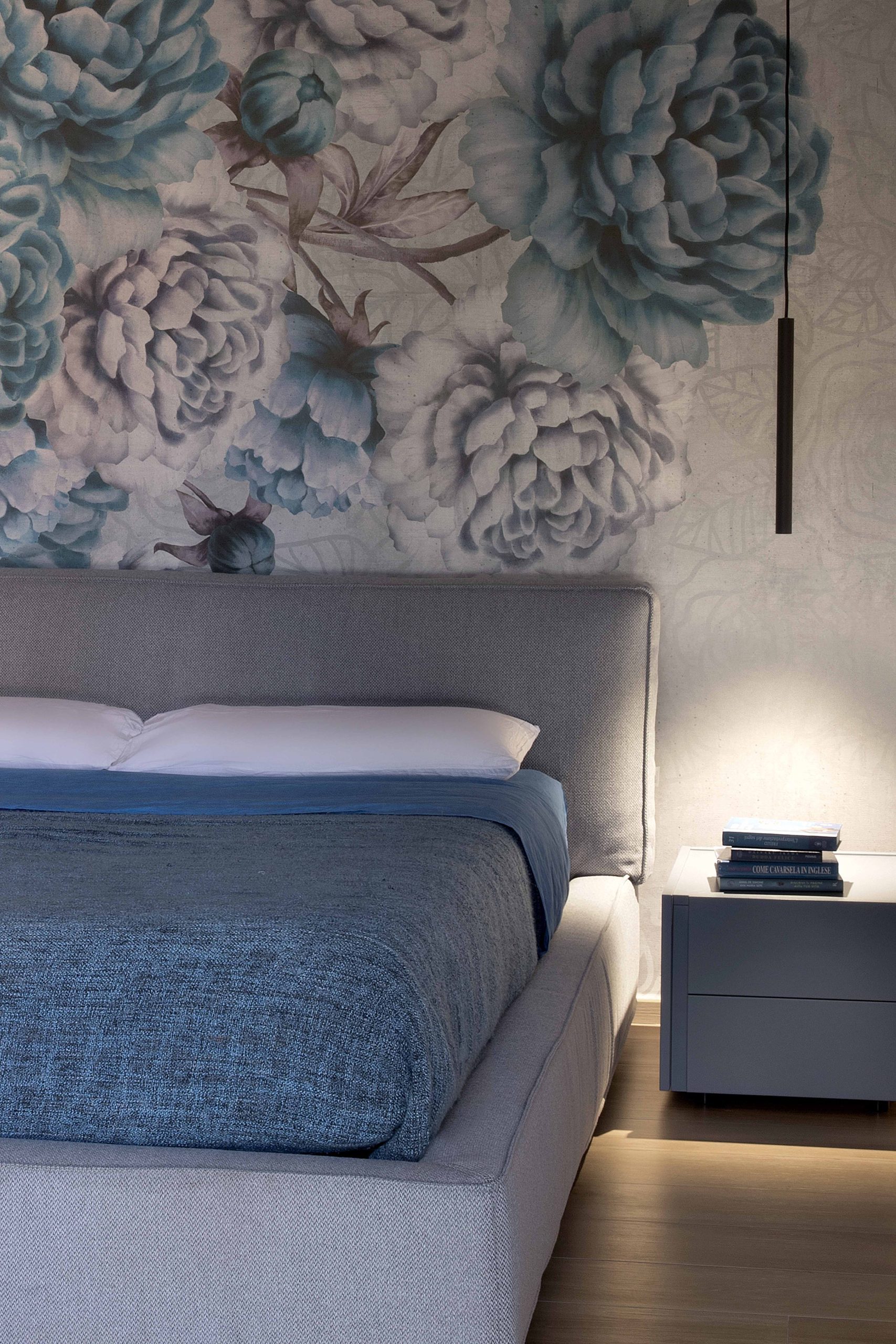 I toni freddi e spenti del blu si alternano al calore del legno naturale, creando un equilibrio armonico e rilassante.