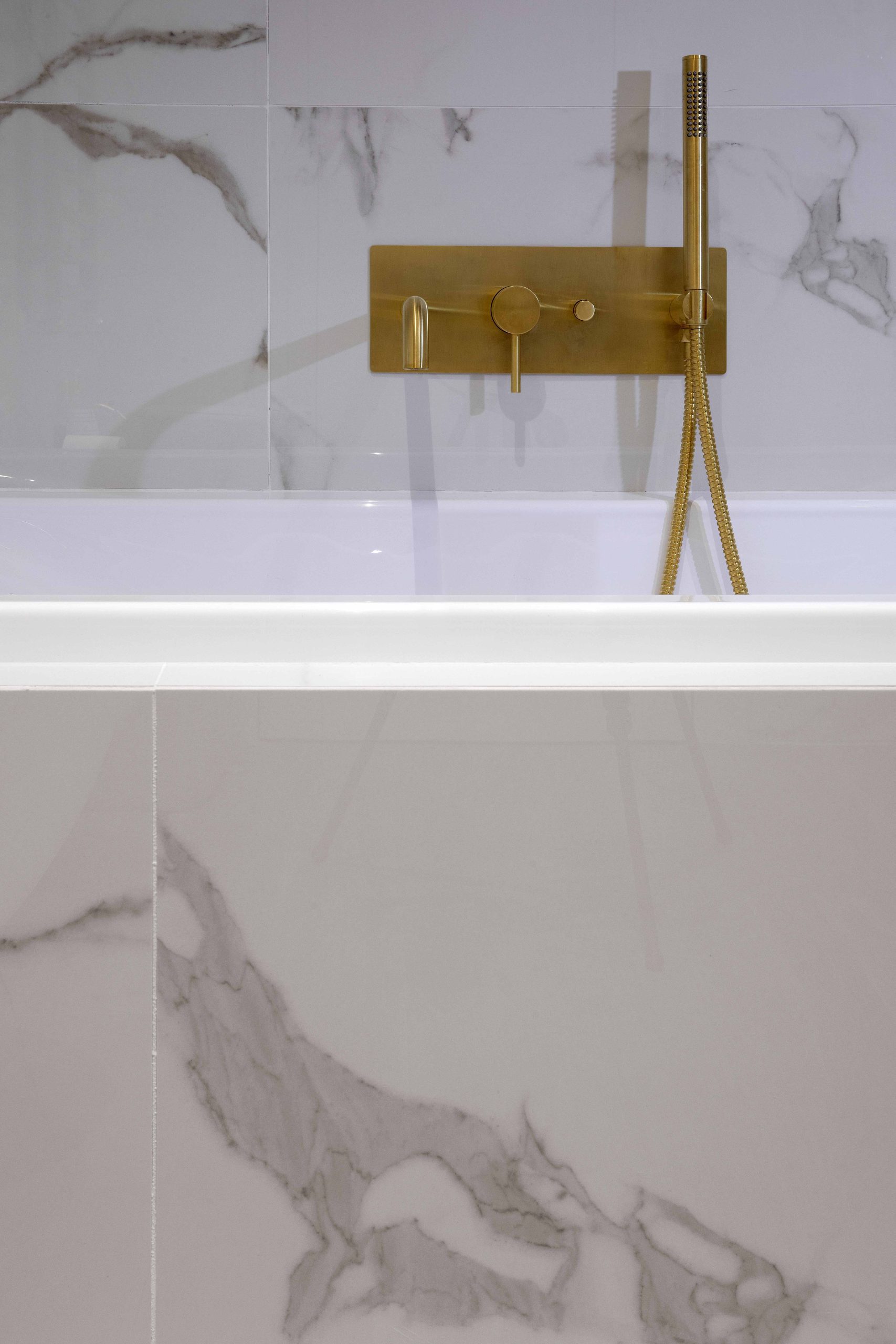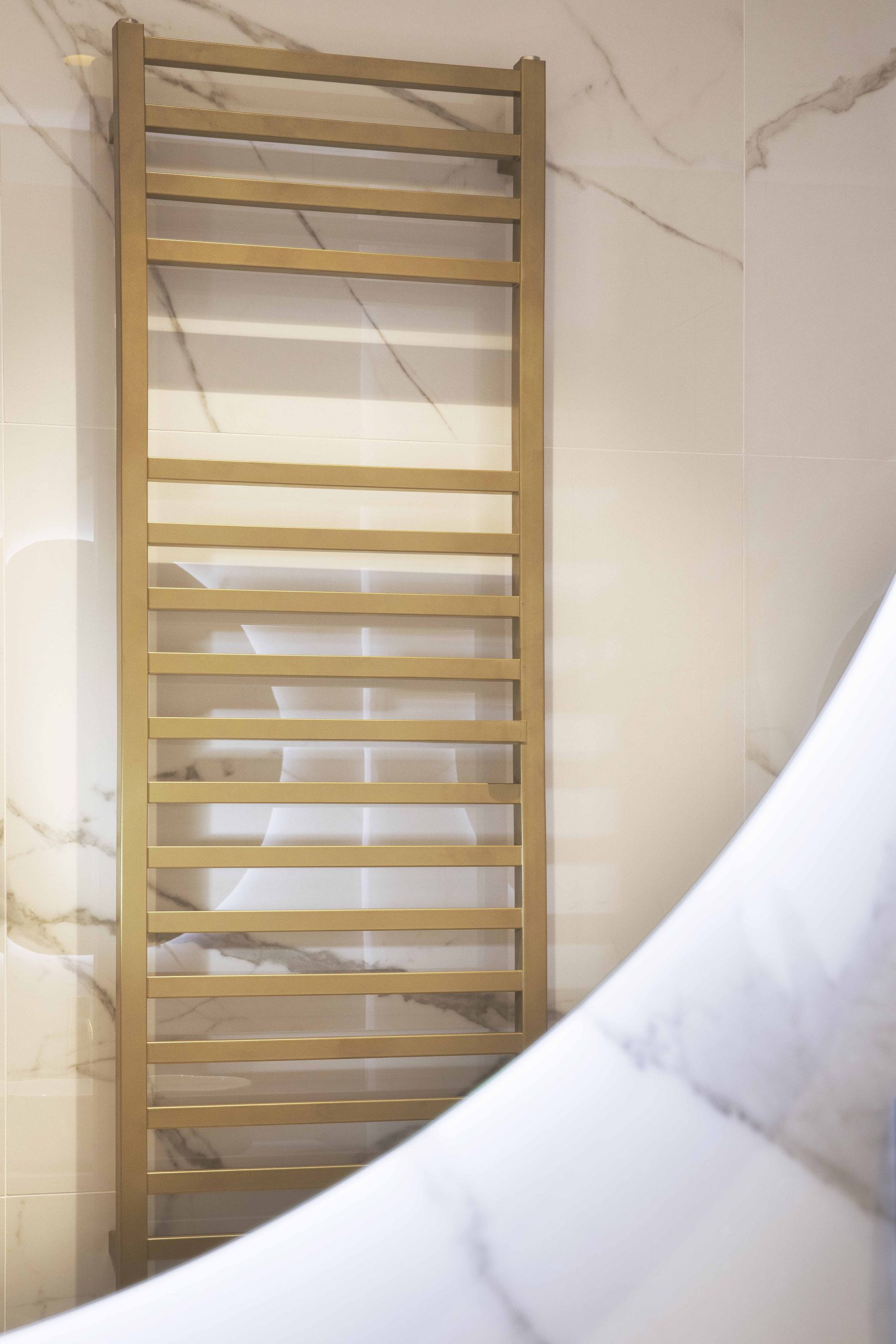 Le superfici effetto marmo statuario si fondono con i toni avio delle pareti, mentre piccoli accenti dorati nei sanitari e nei profili illuminano l’ambiente con eleganza.