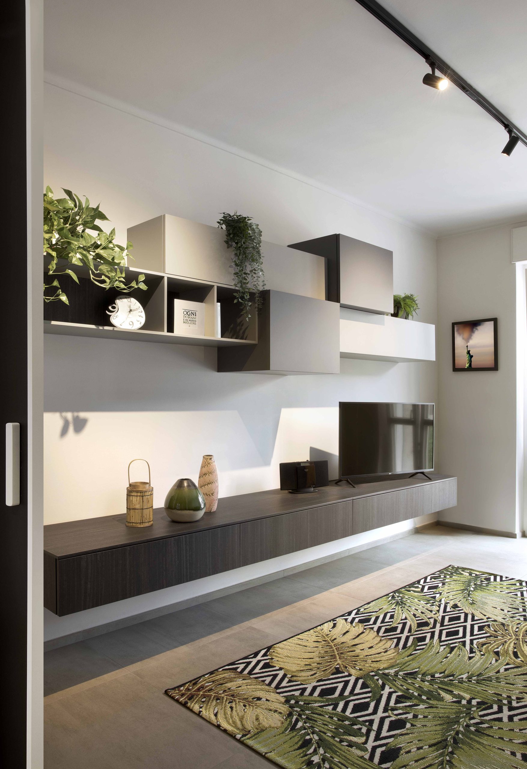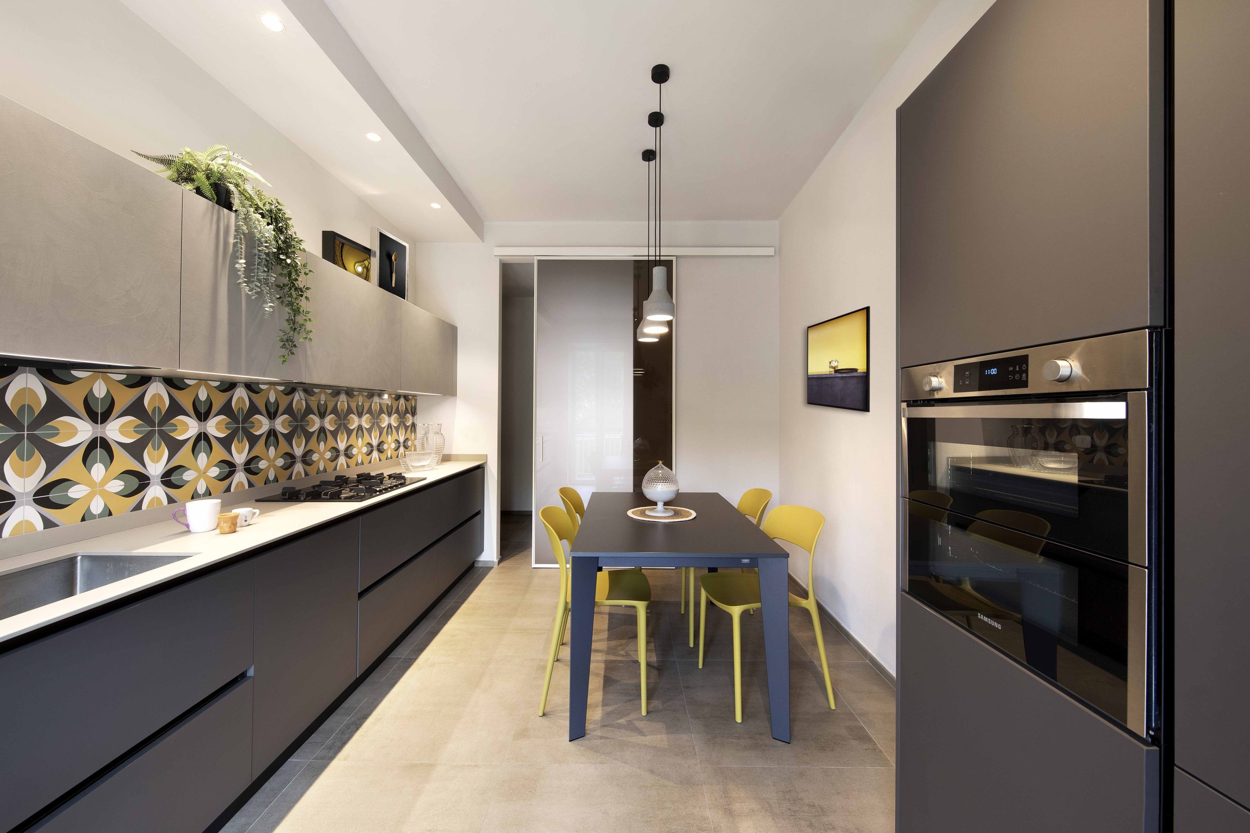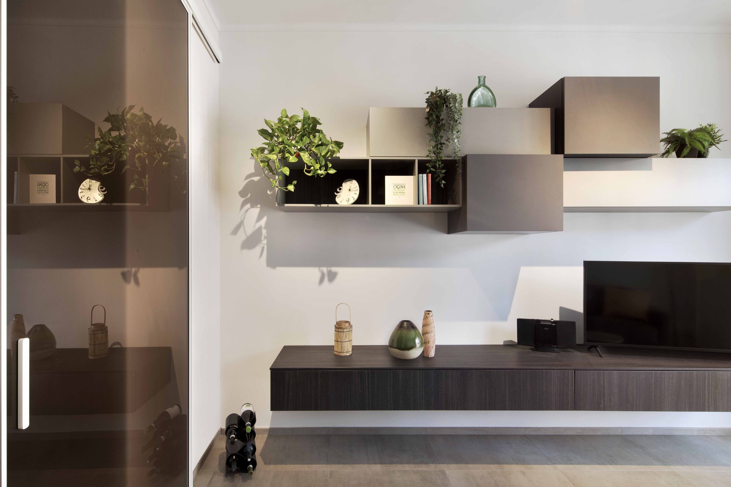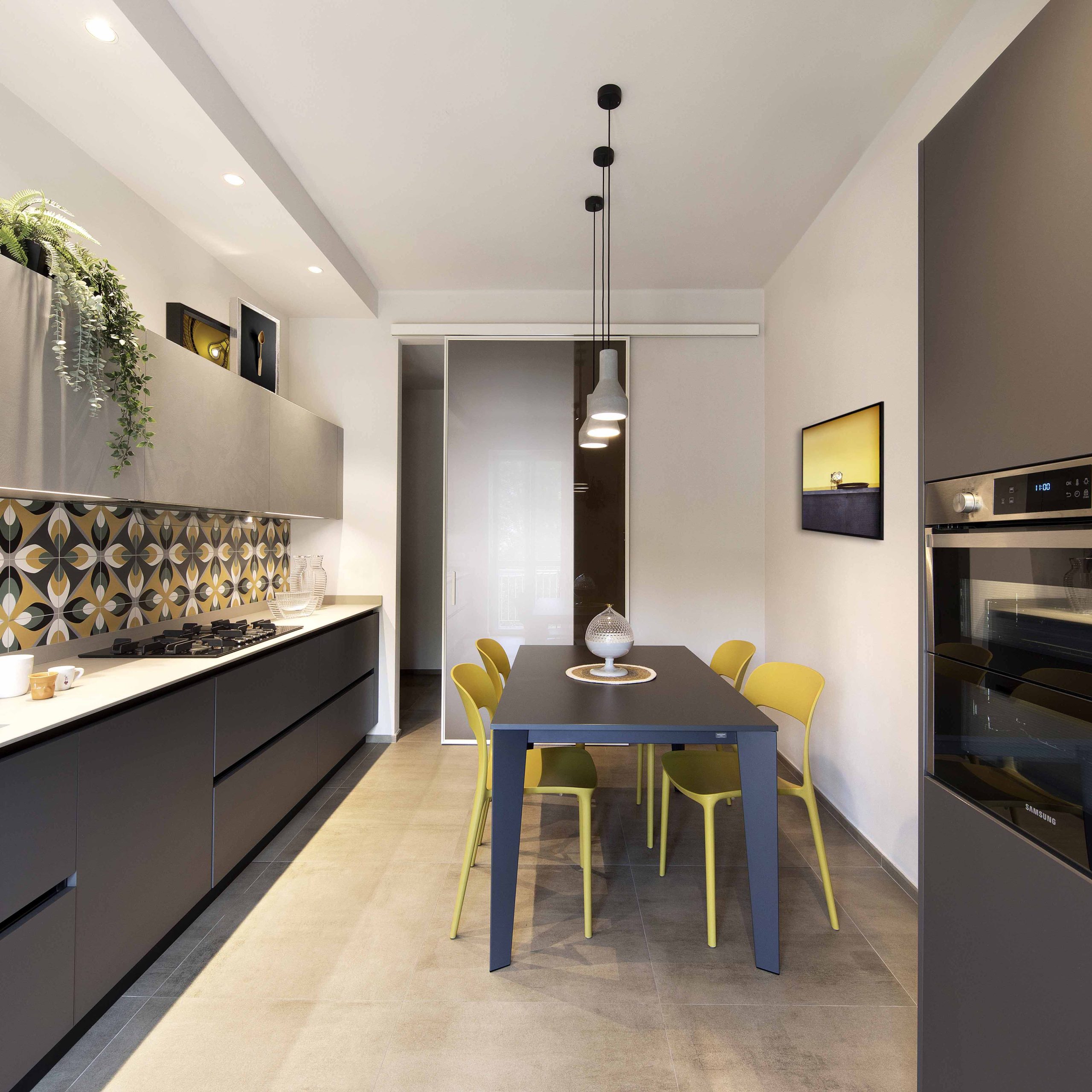 La cucina è abitabile ma separata dal soggiorno tramite porta scorrevole in vetro fumé, scelta replicata anche nel salotto, per mantenere continuità e luminosità.