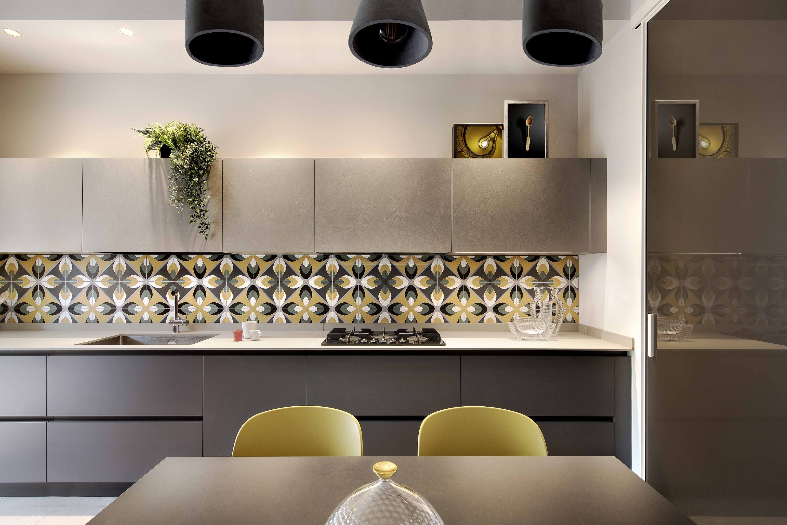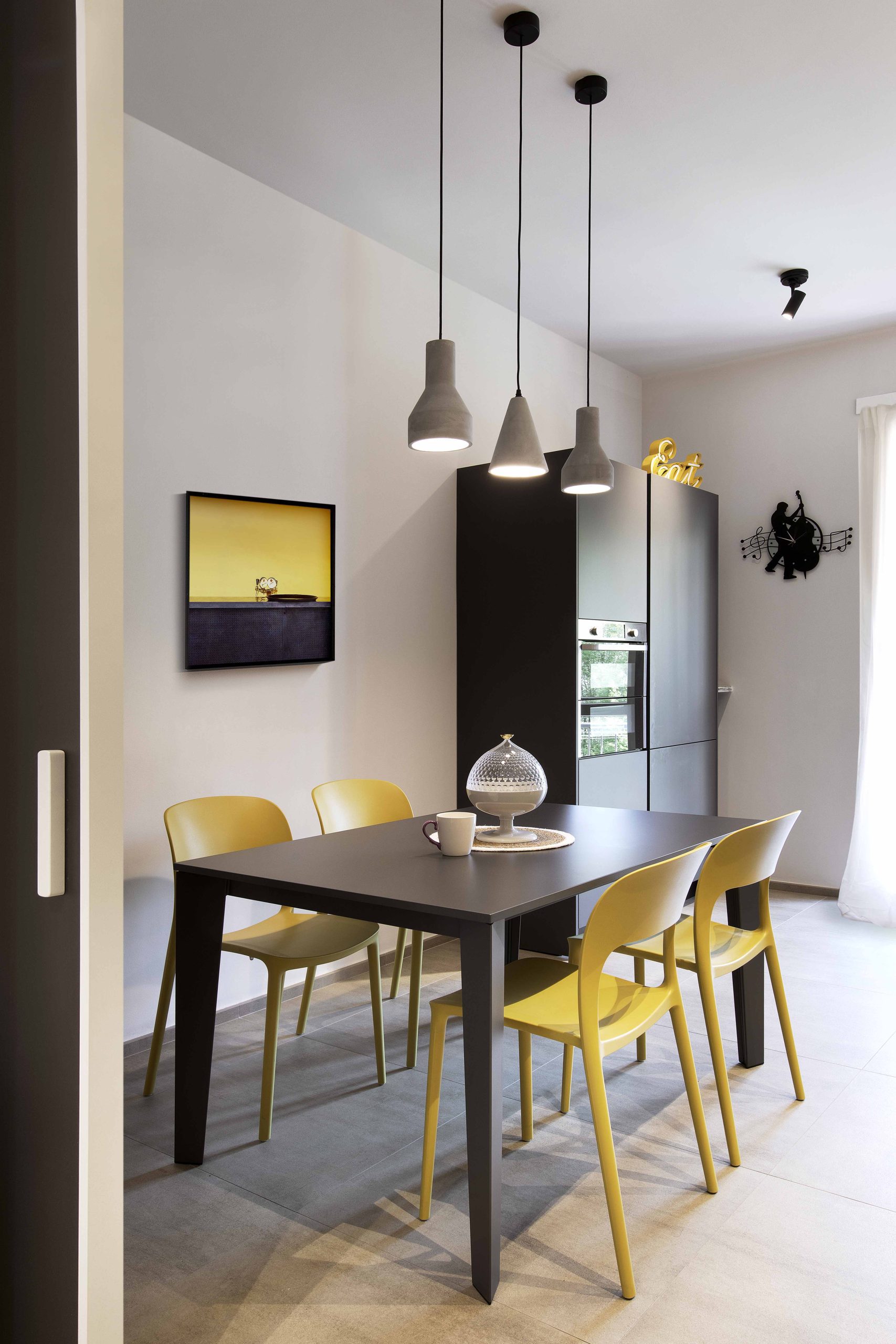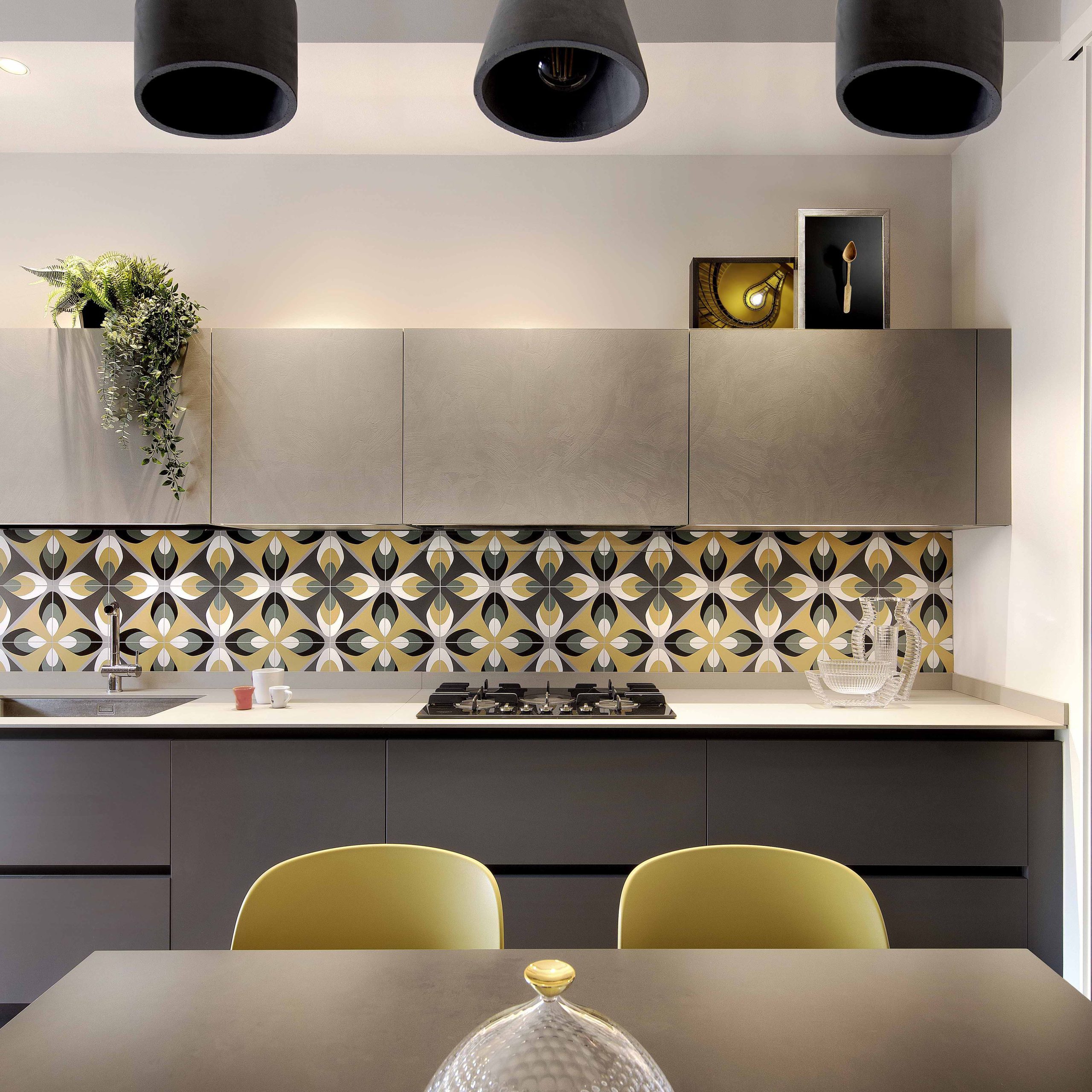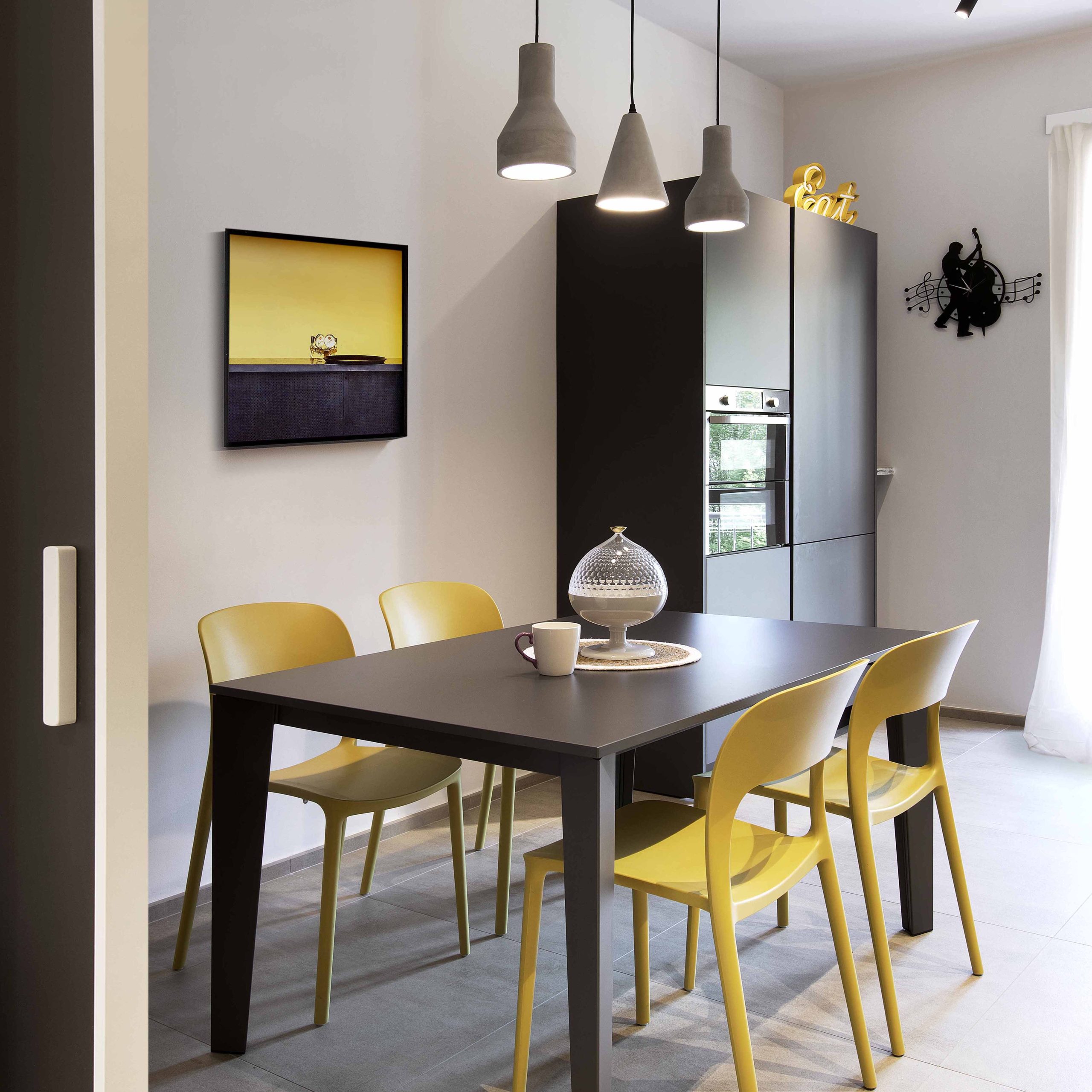 Il colore predominante è il giallo ocra, inserito in combinazione con tonalità neutre di arredi e pavimenti, creando un ambiente conviviale e funzionale.