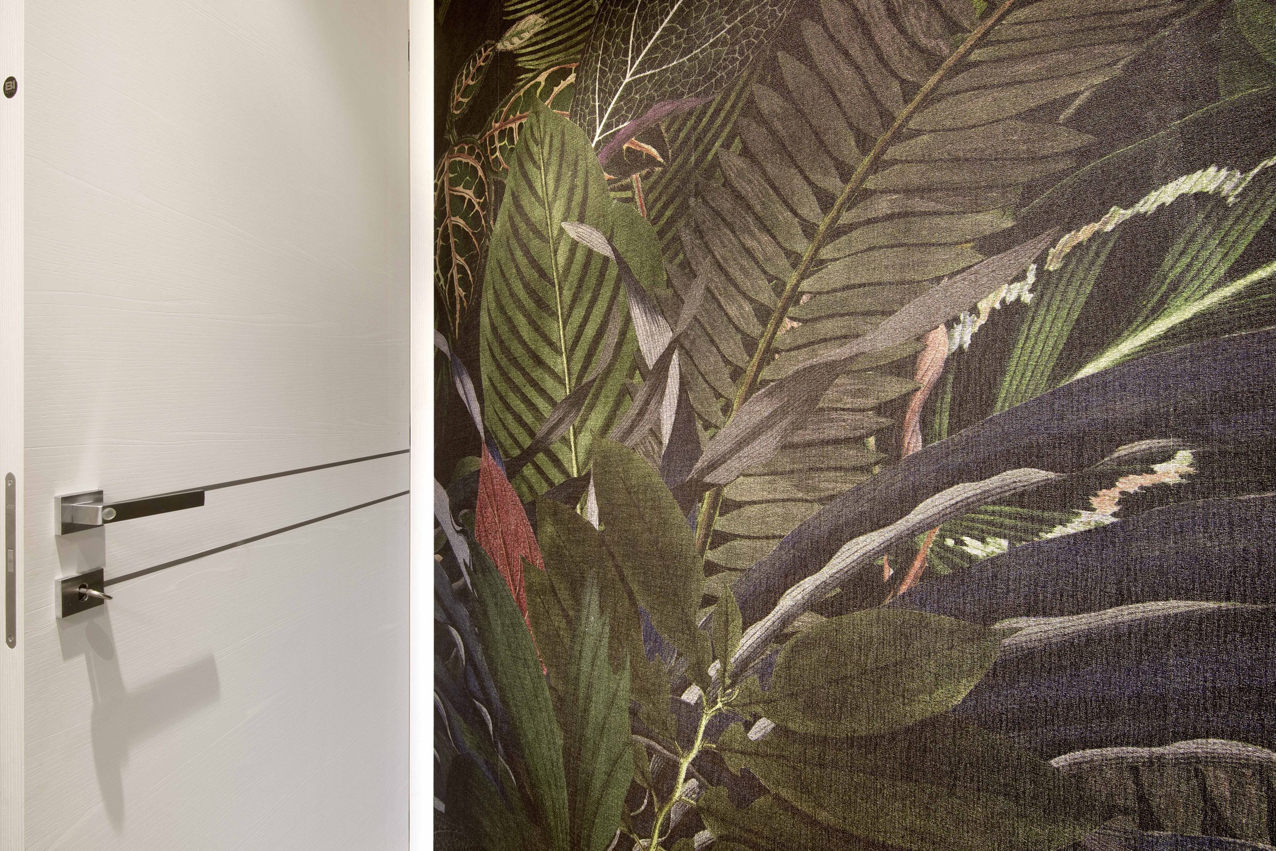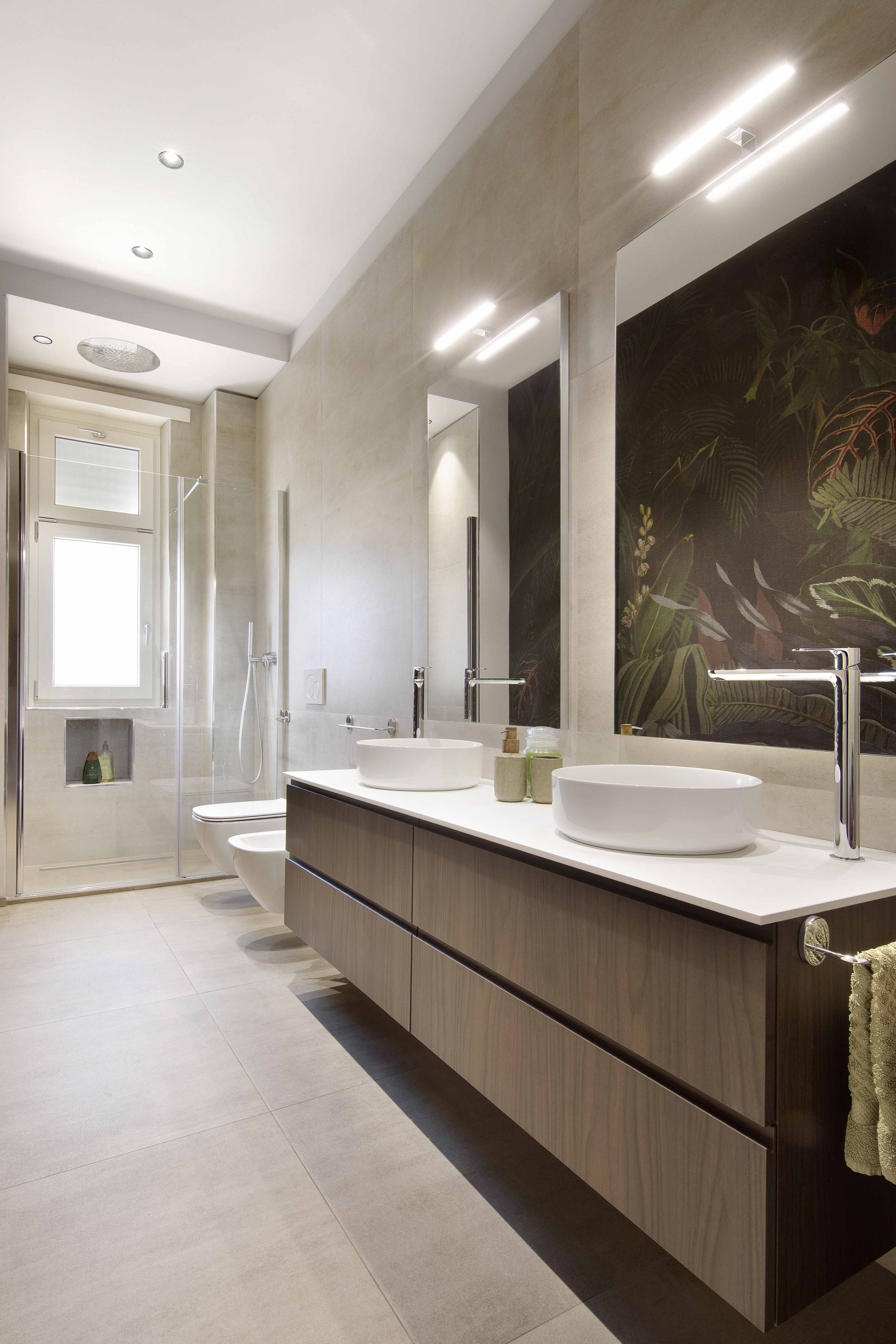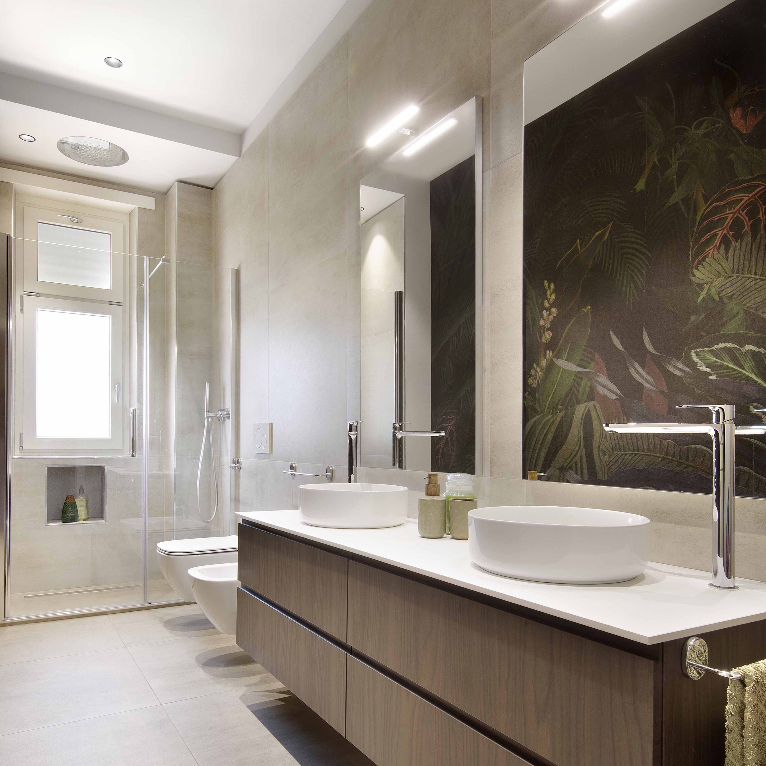 Il bagno utilizza una carta da parati tropicale sui toni del verde scuro, che regala personalità e carattere all’ambiente, abbinata a pavimenti e rivestimenti chiari per amplificare la luminosità.