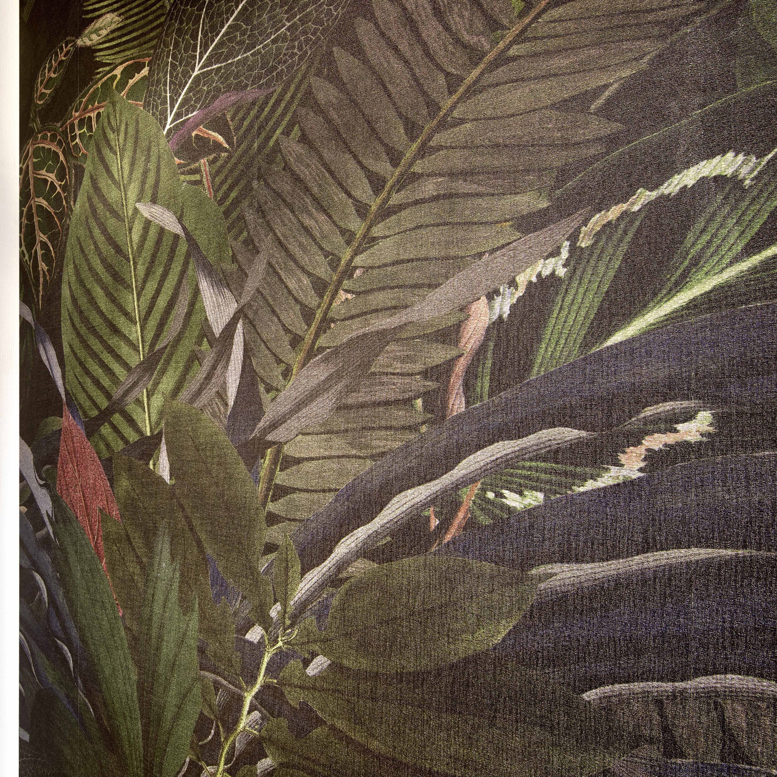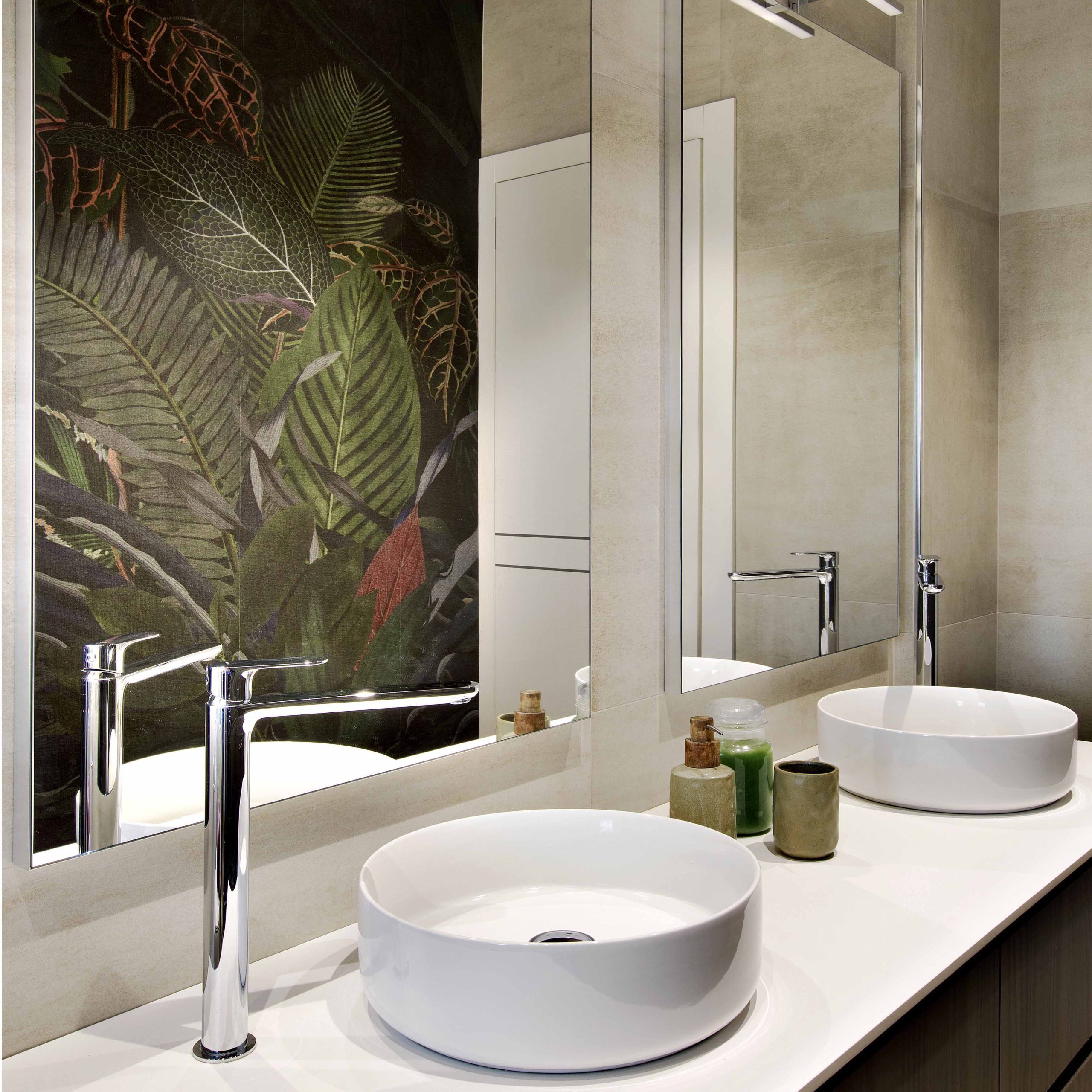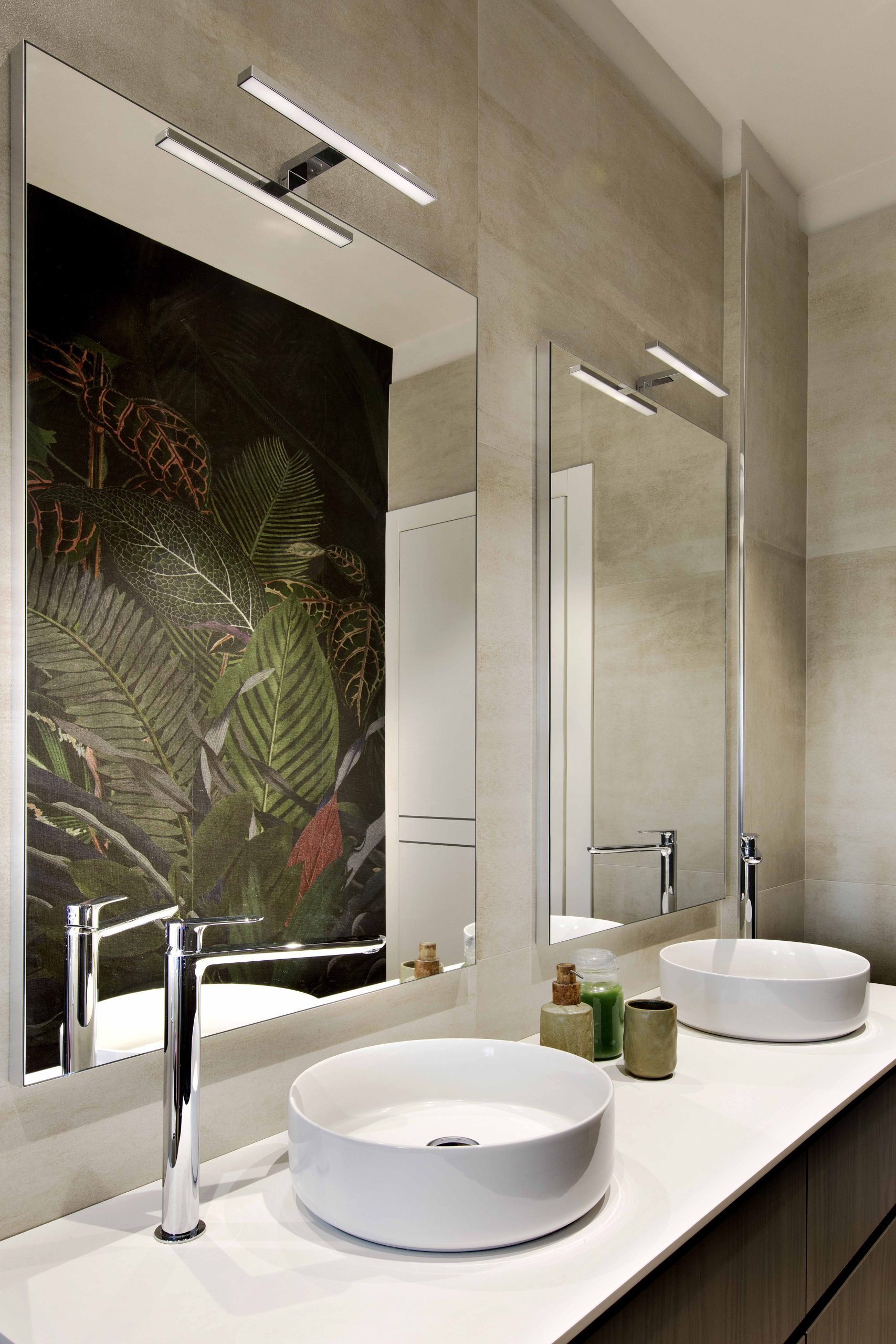 Il bagno utilizza una carta da parati tropicale sui toni del verde scuro, che regala personalità e carattere all’ambiente, abbinata a pavimenti e rivestimenti chiari per amplificare la luminosità.