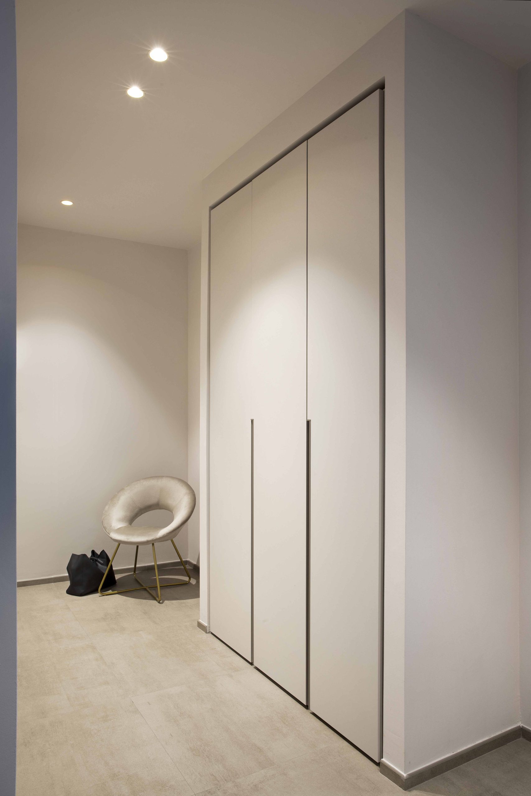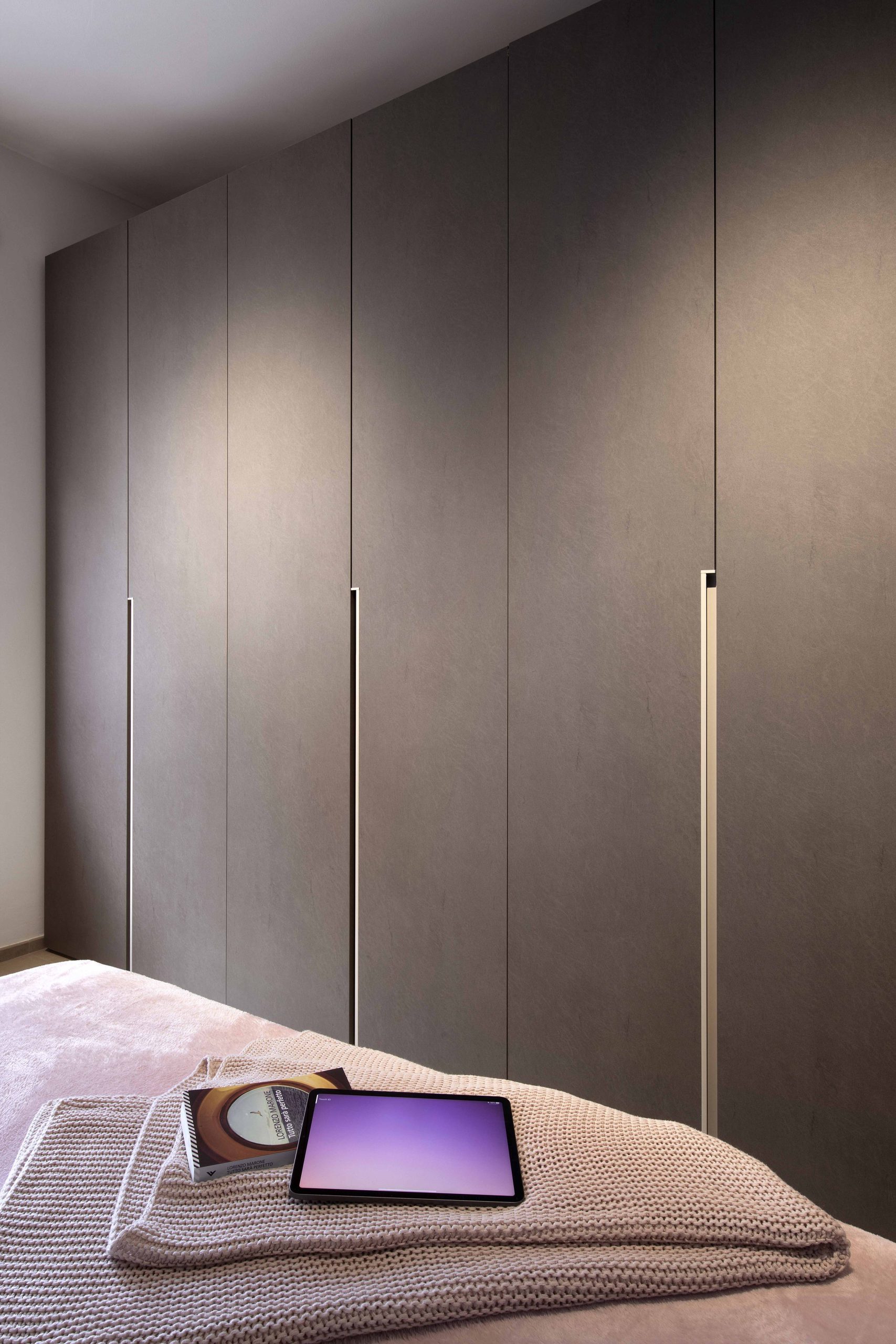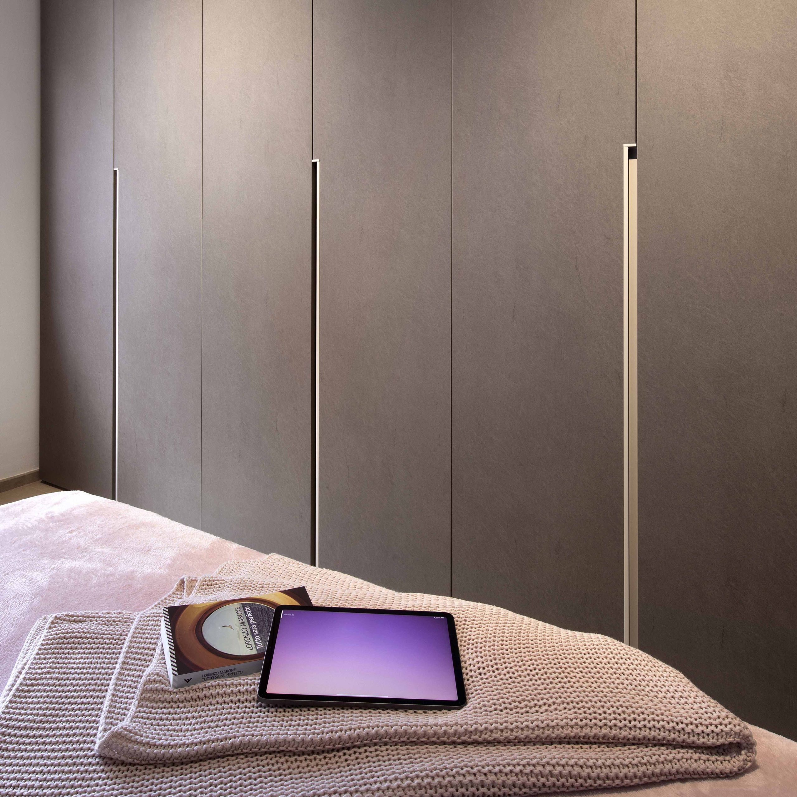 L’ampio armadio lineare sfrutta tutta la larghezza fronte letto, offrendo contenimento e ordine senza sacrificare lo stile.