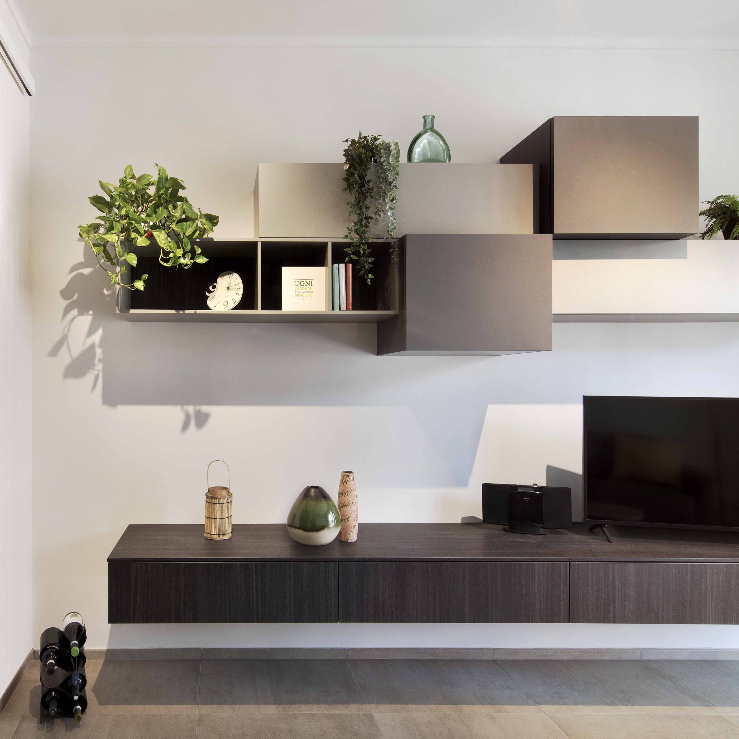 Il salotto è caratterizzato dall’azzurro, accostato ai toni neutri del divano e della parete TV, creando un ambiente distinto ma armonioso con la cucina.