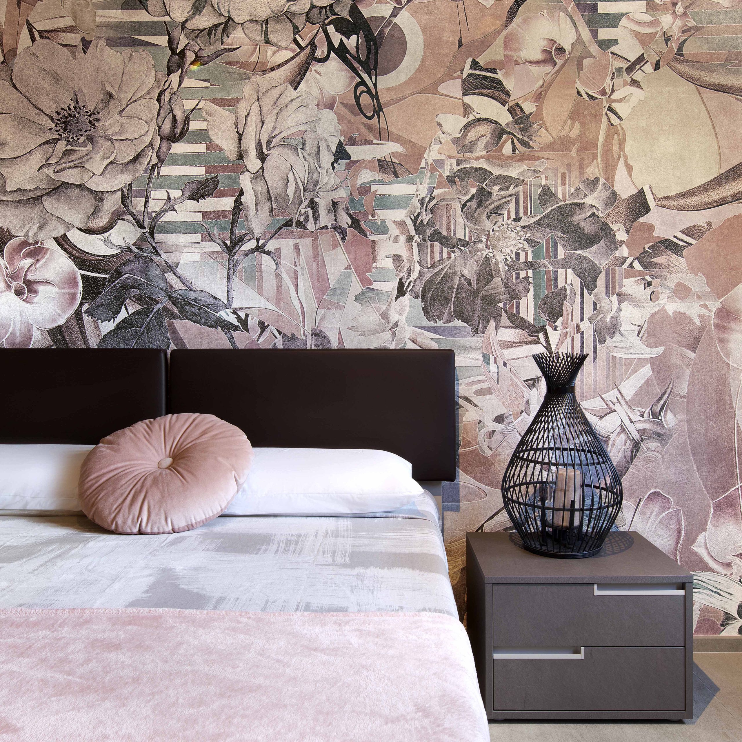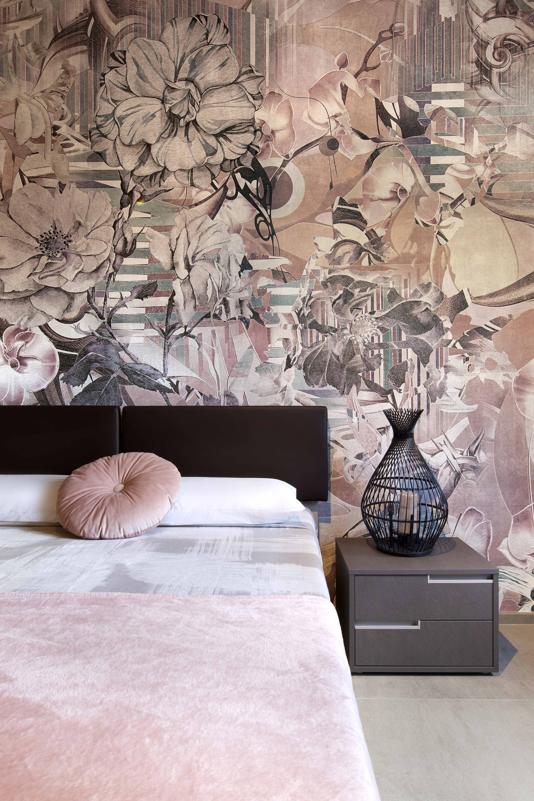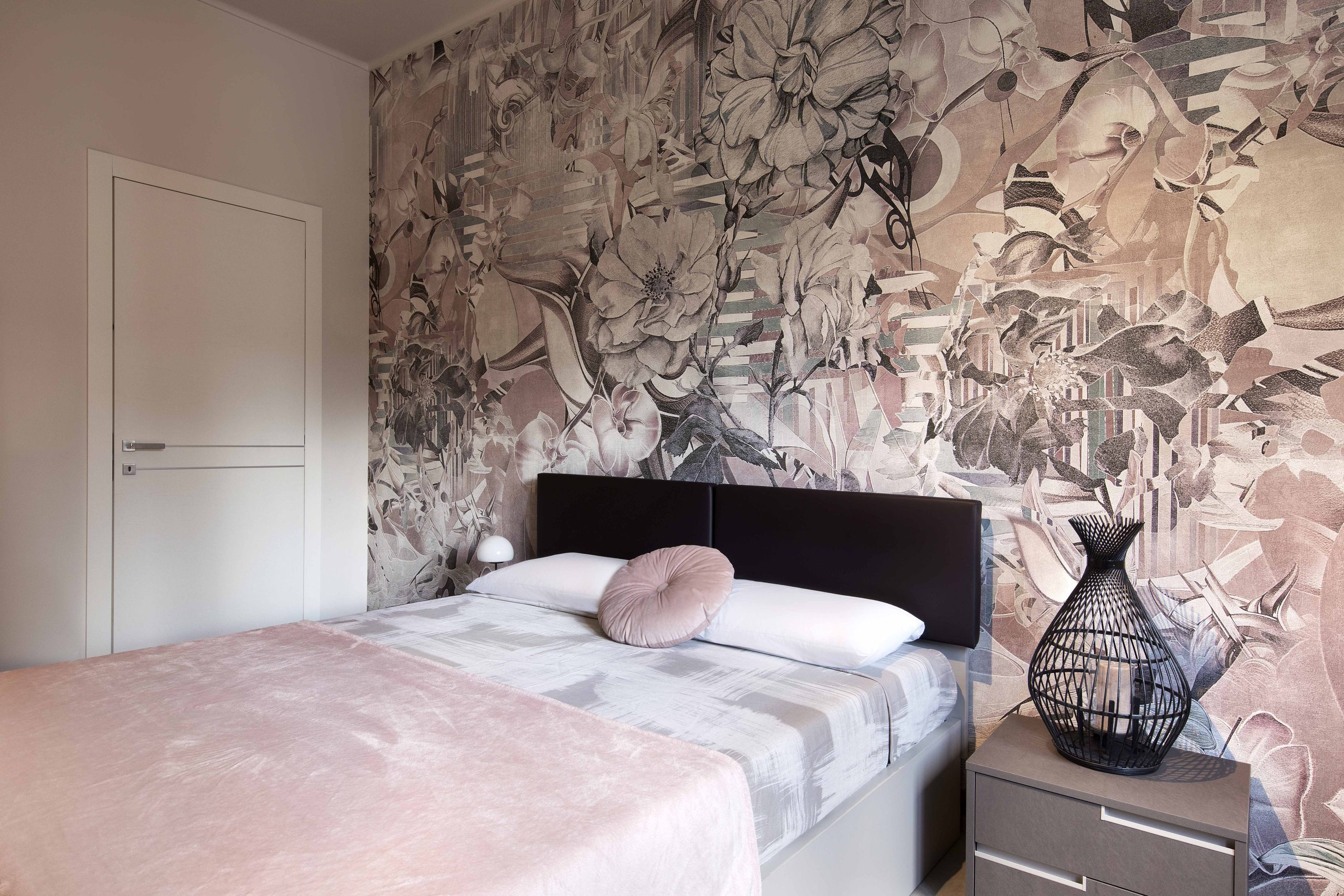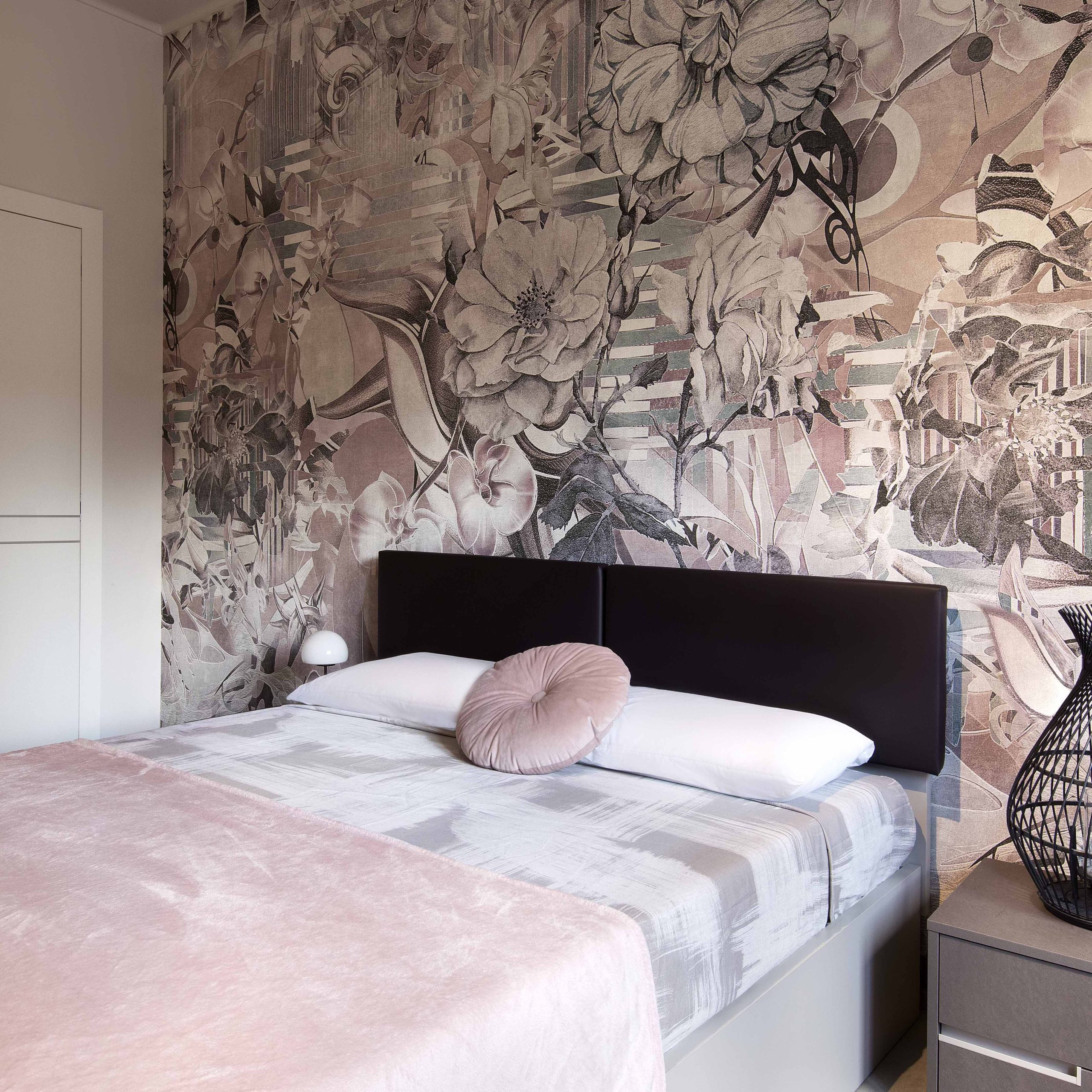 La camera da letto è stata arredata con un rosa antico morbido e avvolgente, in contrasto con i toni bronzati degli arredi.