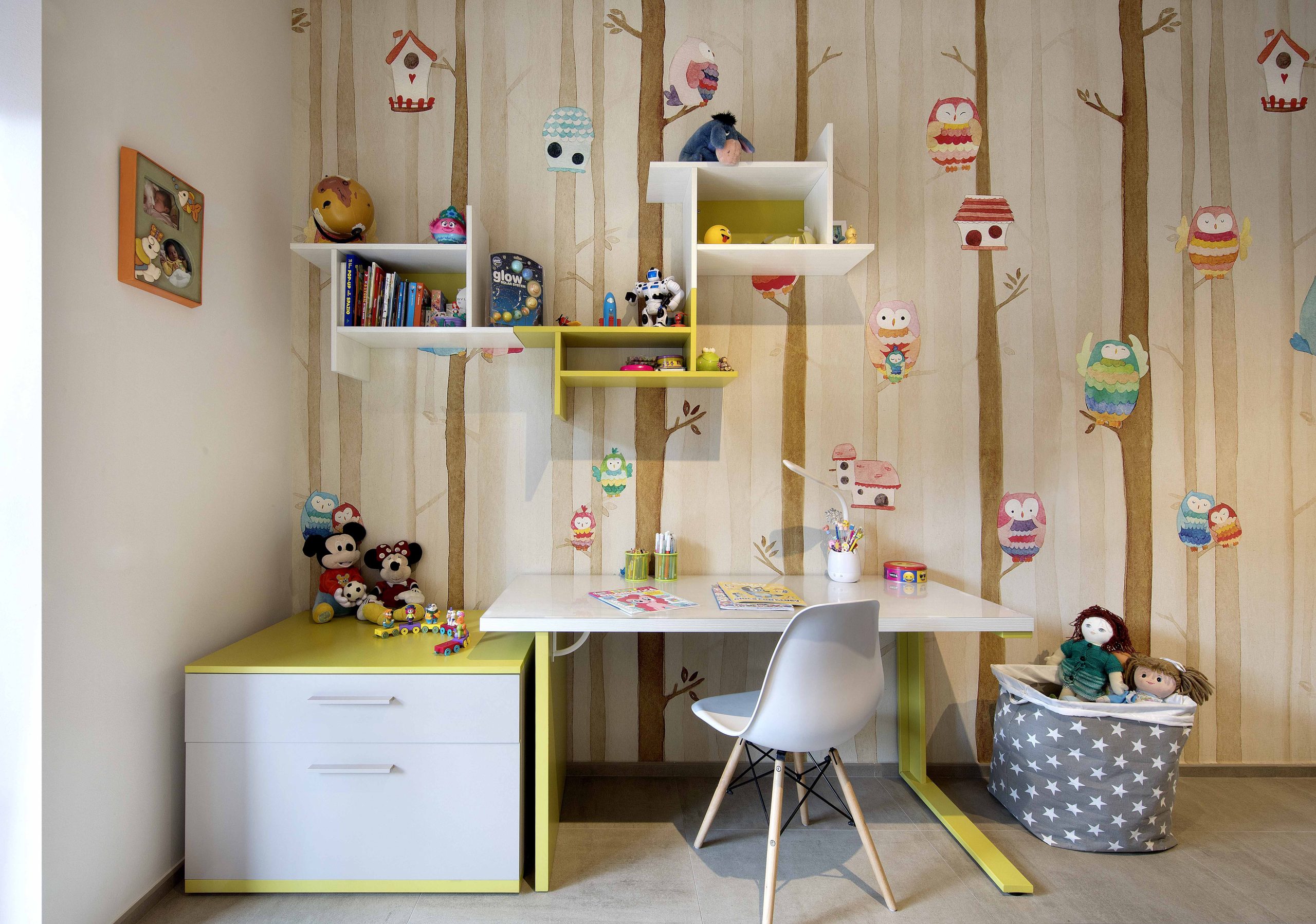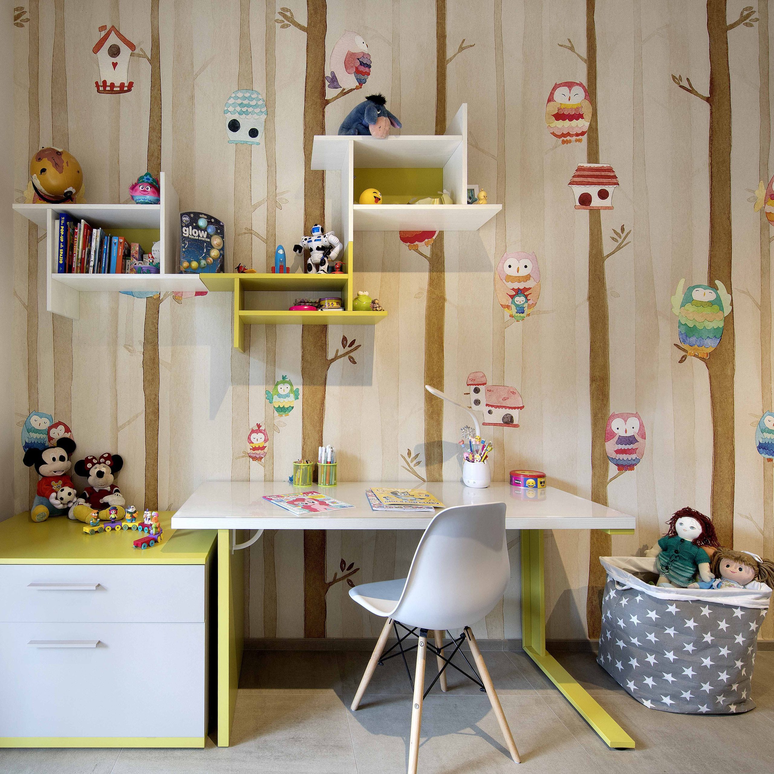 L’arredo include un angolo studio e un armadio contenitivo, mentre la carta da parati enfatizza la personalità e il carattere dello spazio.