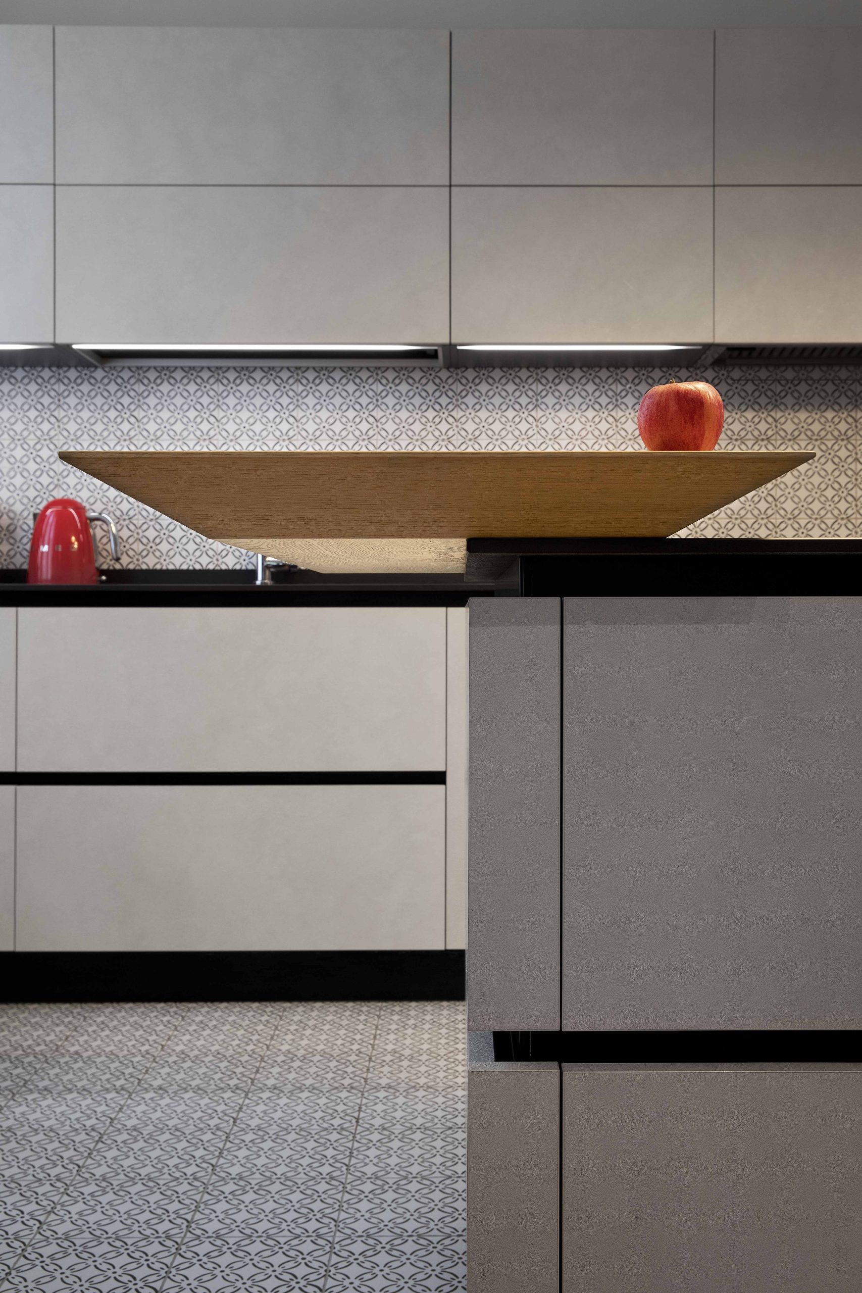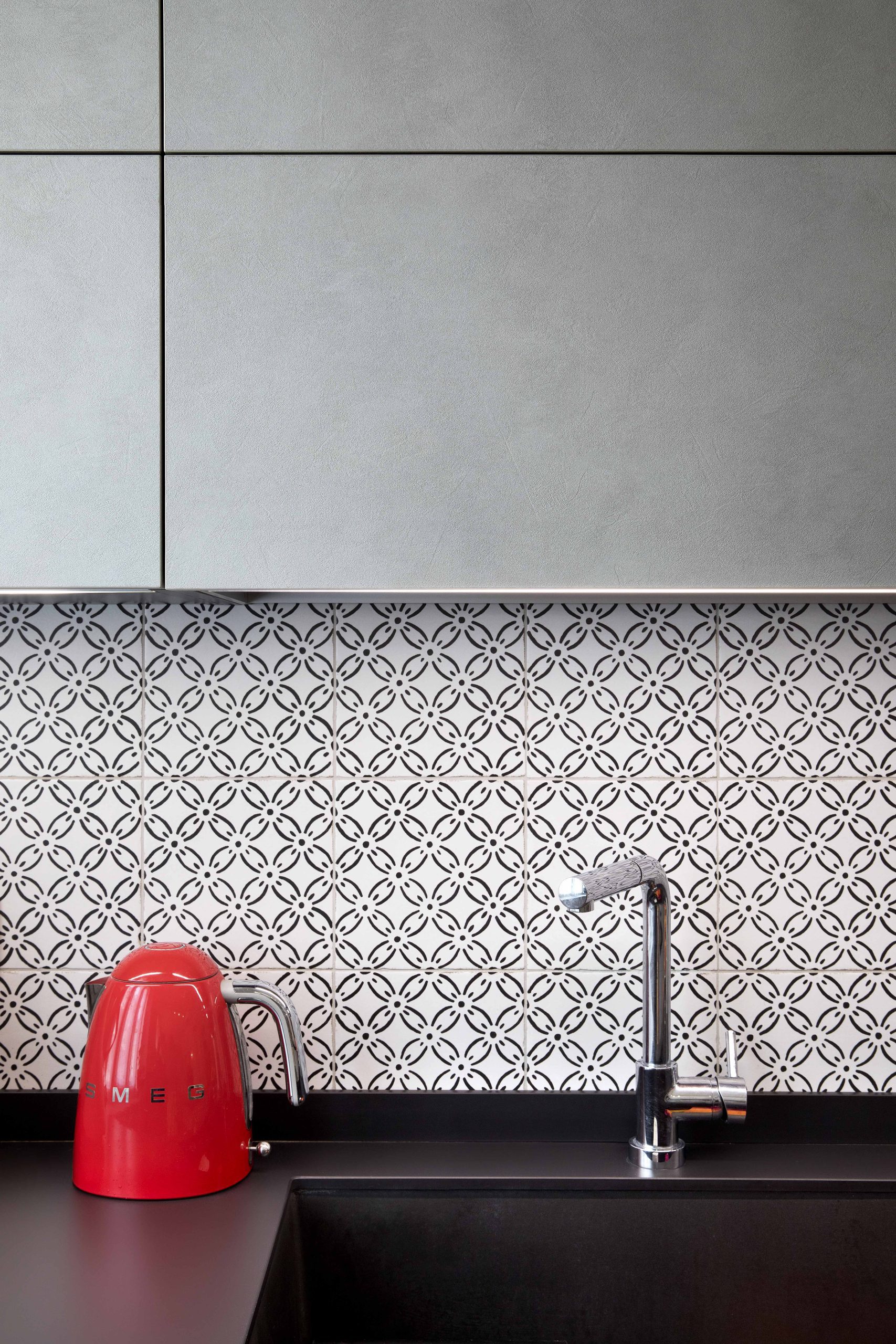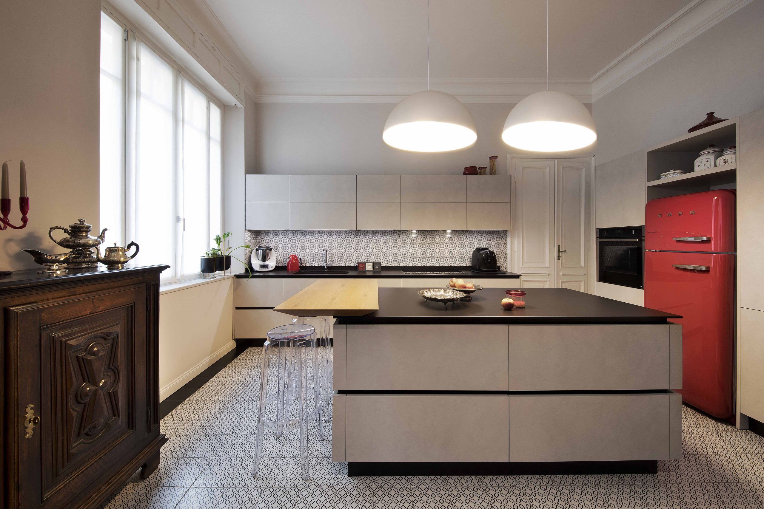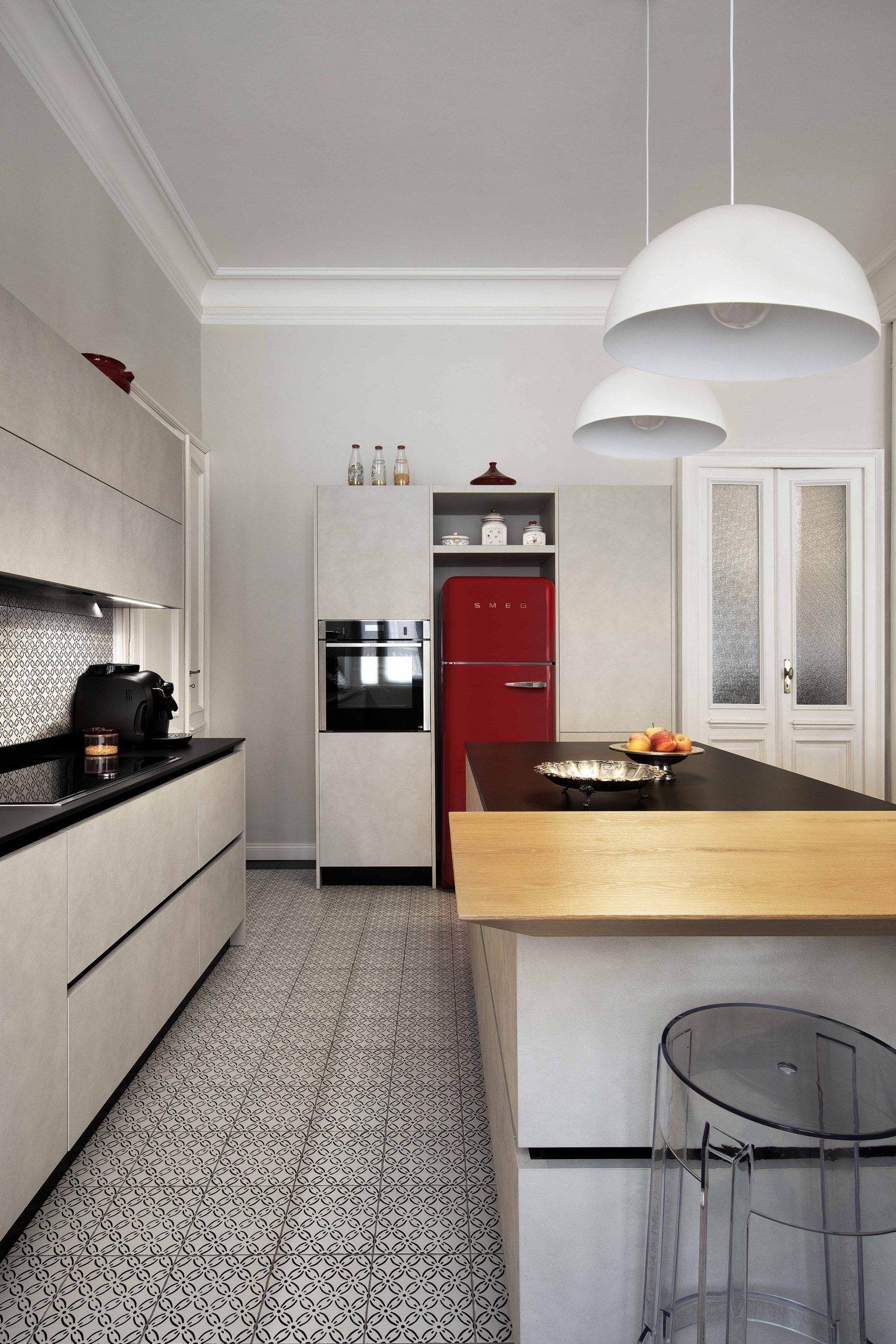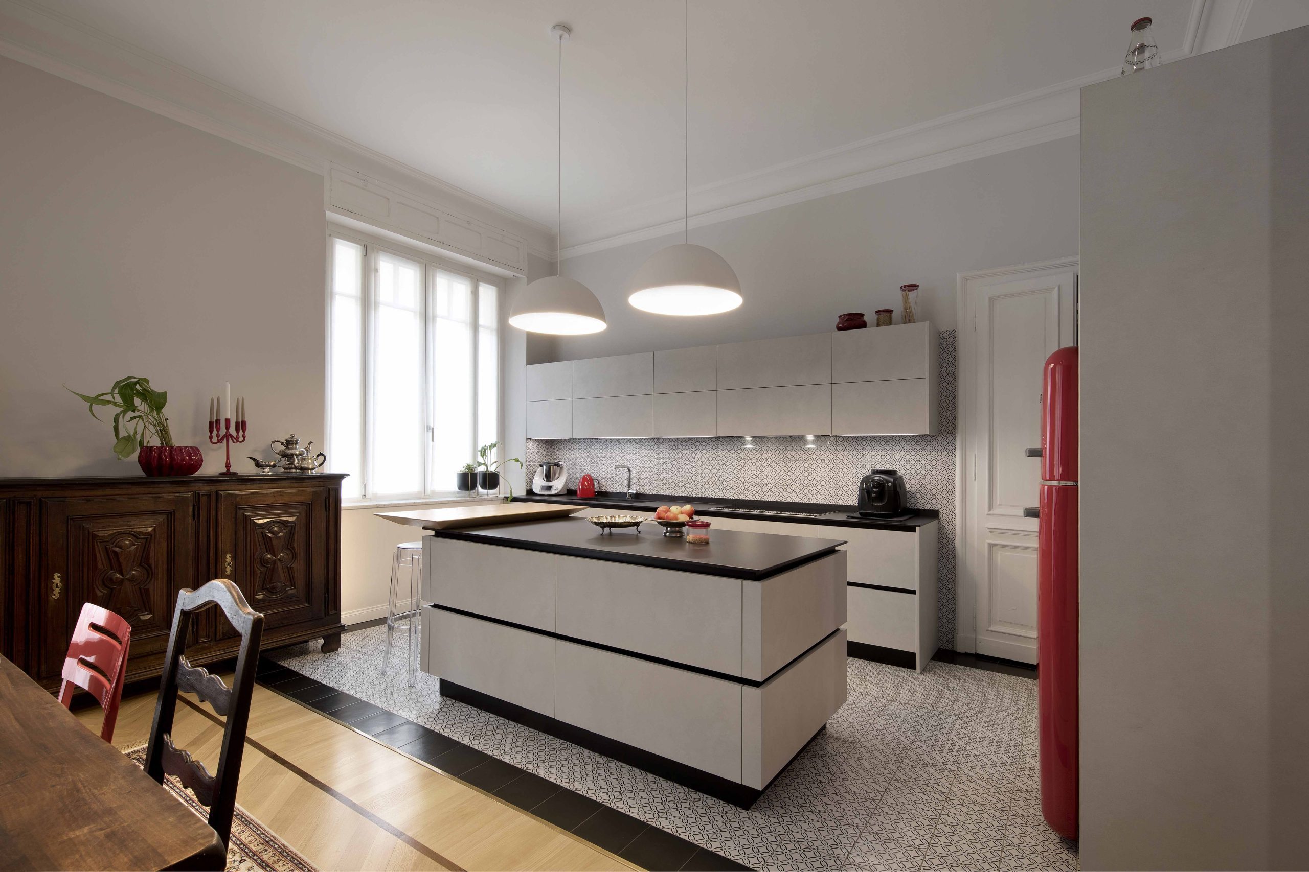 I colori della cucina riprendono il pavimento e il rivestimento in stile liberty, mentre l’inserimento di elettrodomestici rossi crea un contrasto audace e raffinato.