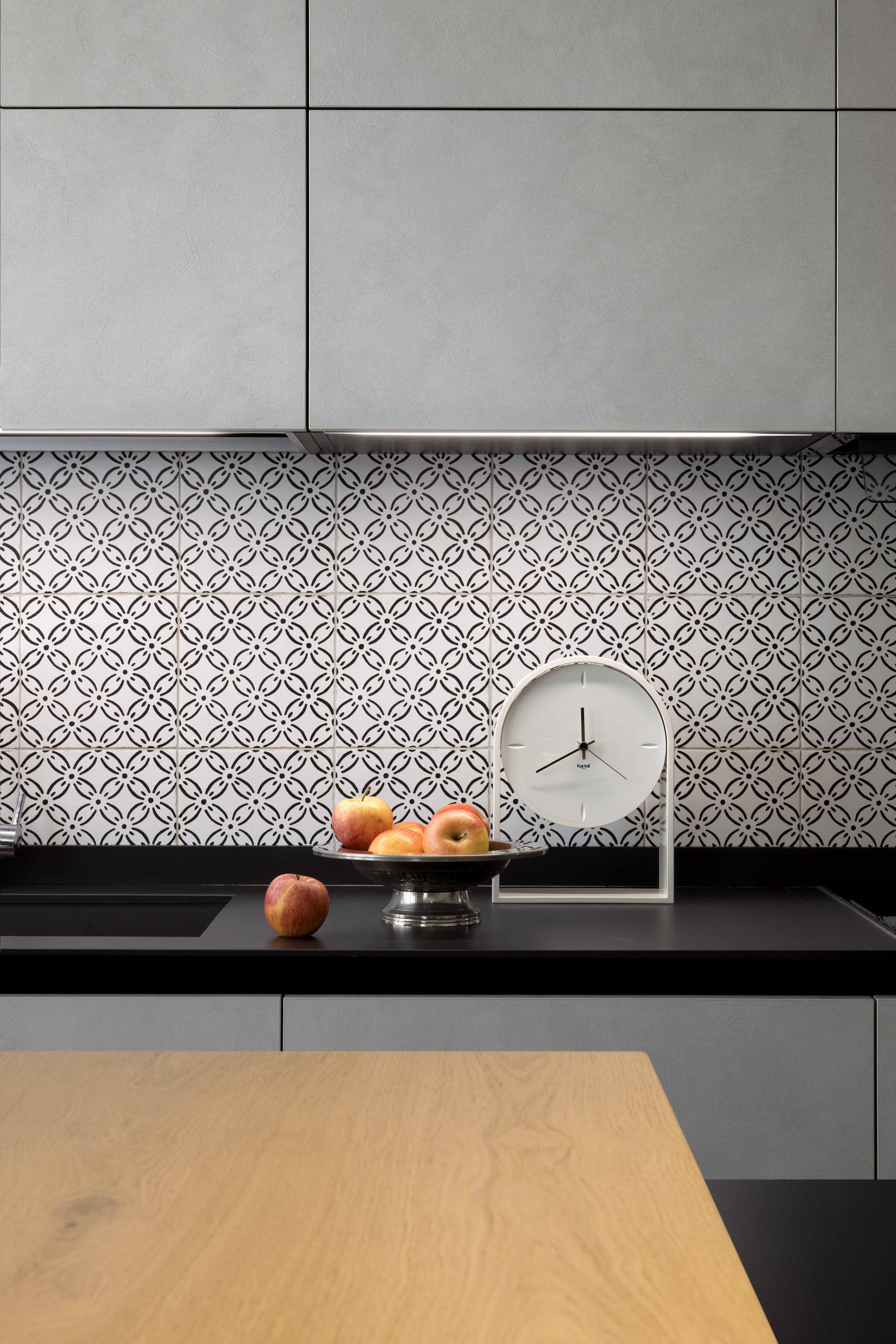 Il cuore della casa è una cucina simmetrica e leggera, progettata con il modello Logica Alf DaFrè – Valdesign, con basi e pensili in nobilitato Rasato, top in grès nero e gola e zoccolo laccato opaco nero.