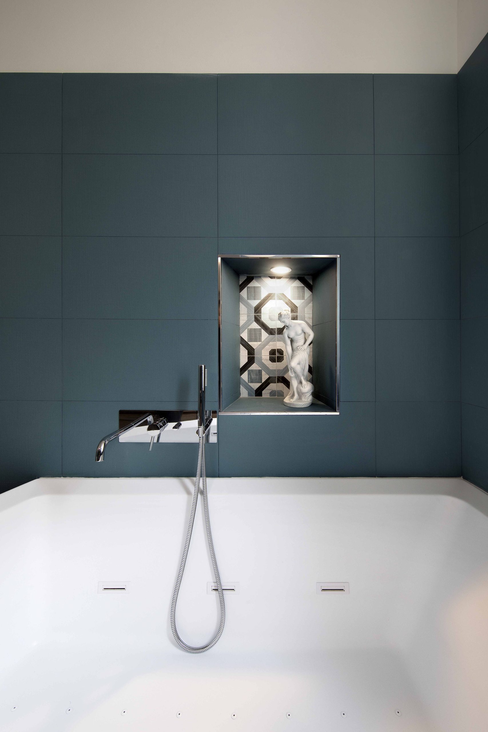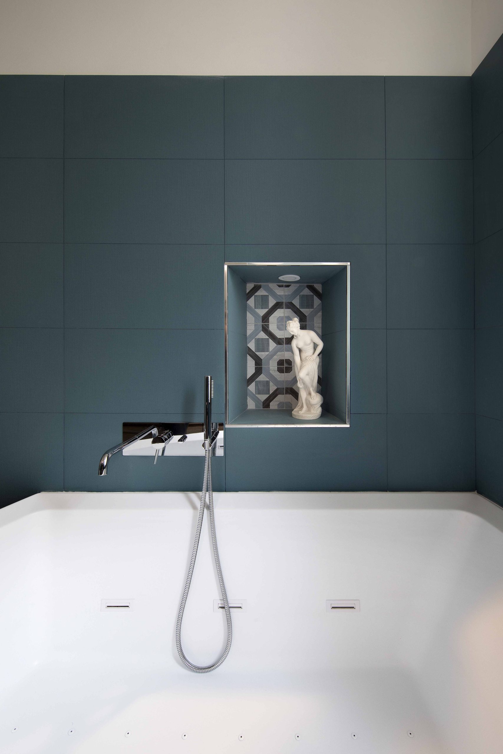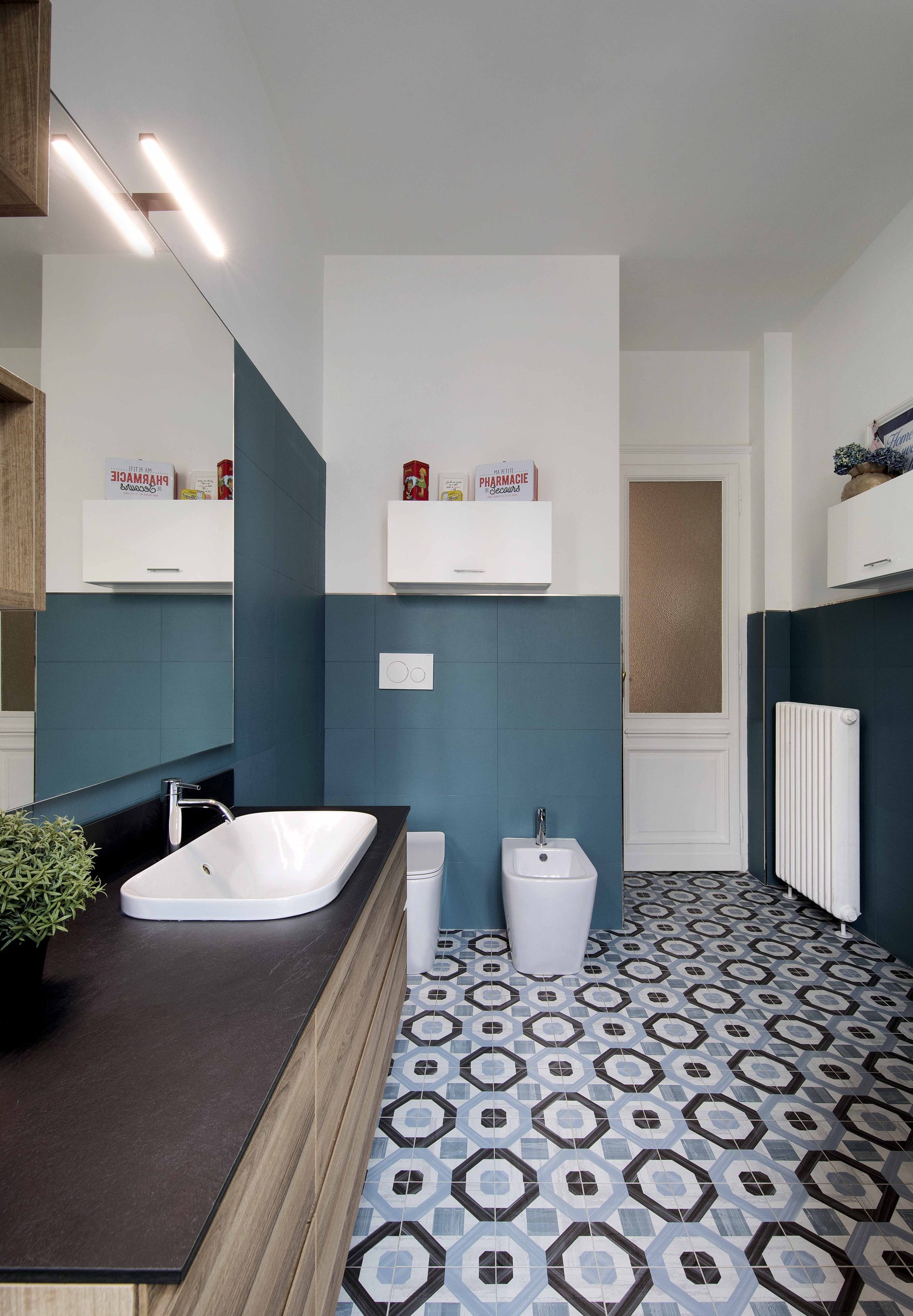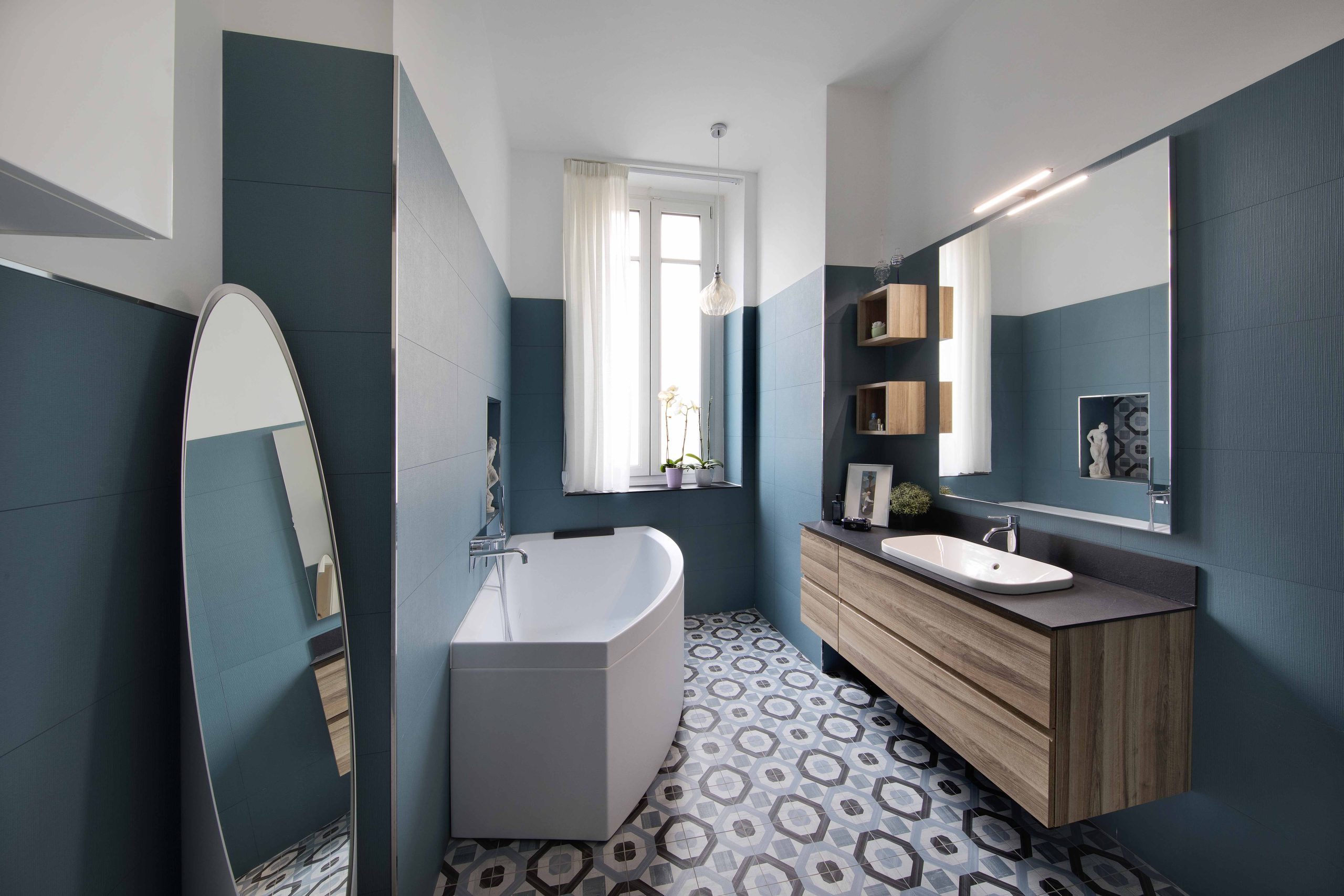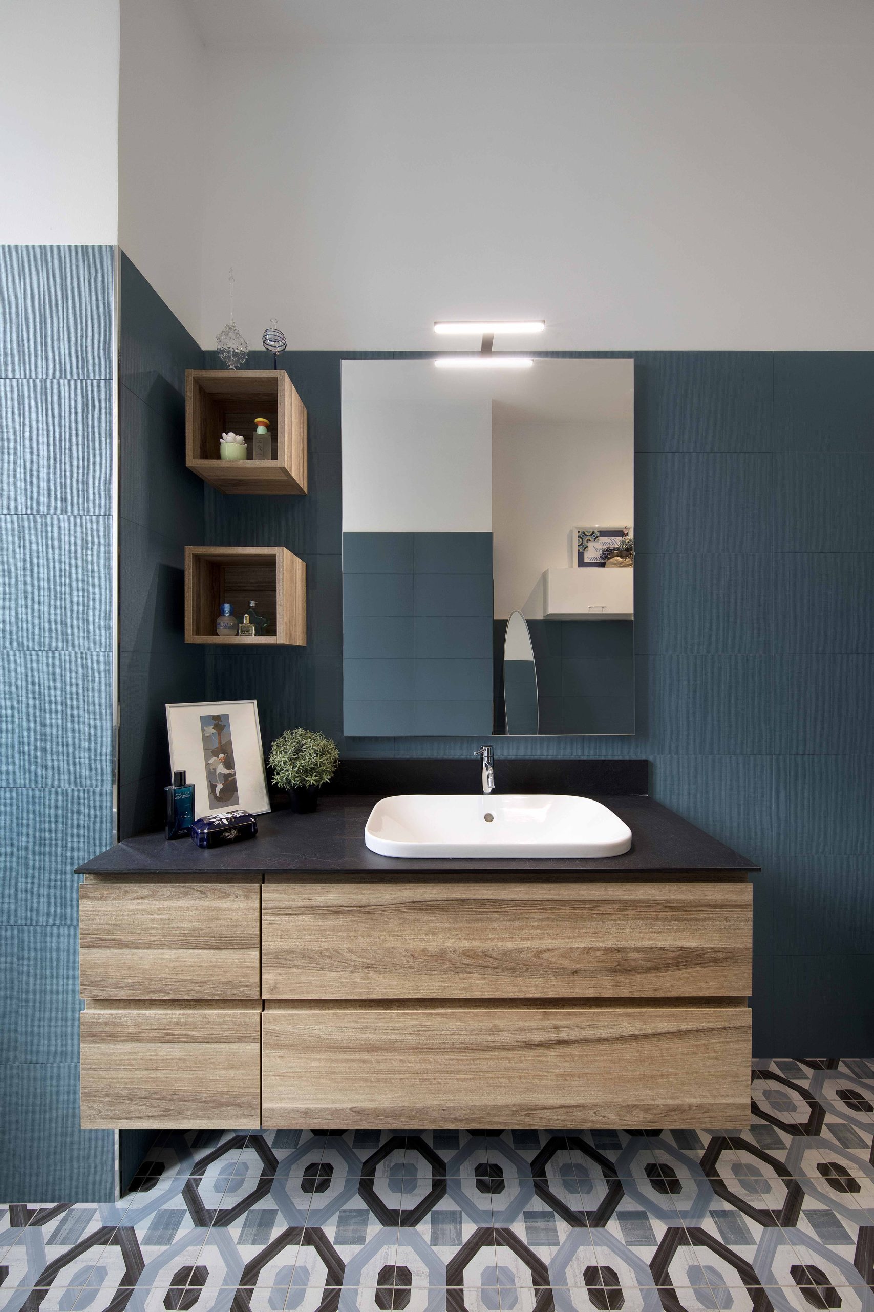 Le piastrelle Liberty incontrano l’eleganza del blu cadetto e il calore della finitura in legno, creando un ambiente accogliente, raffinato e contemporaneo.