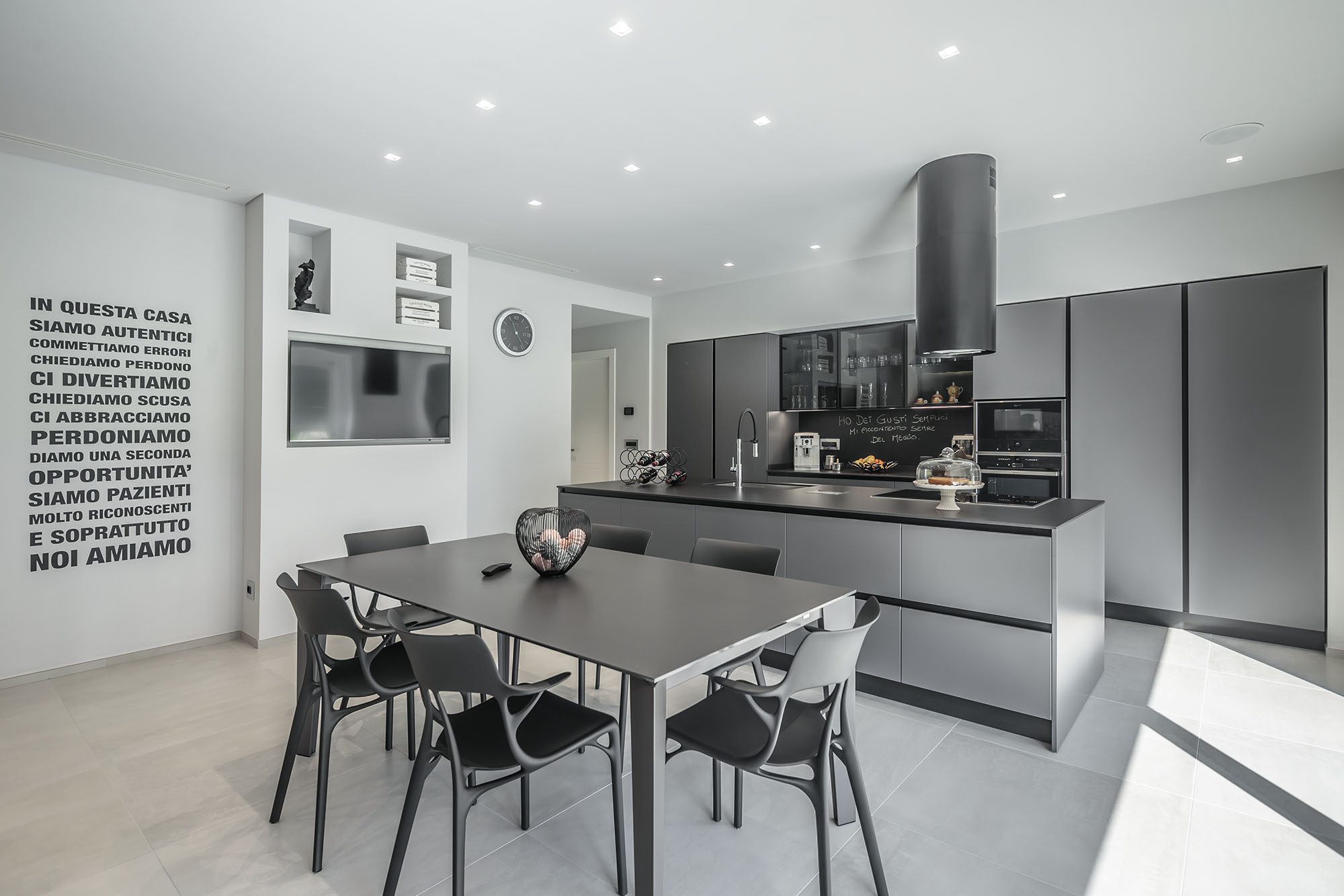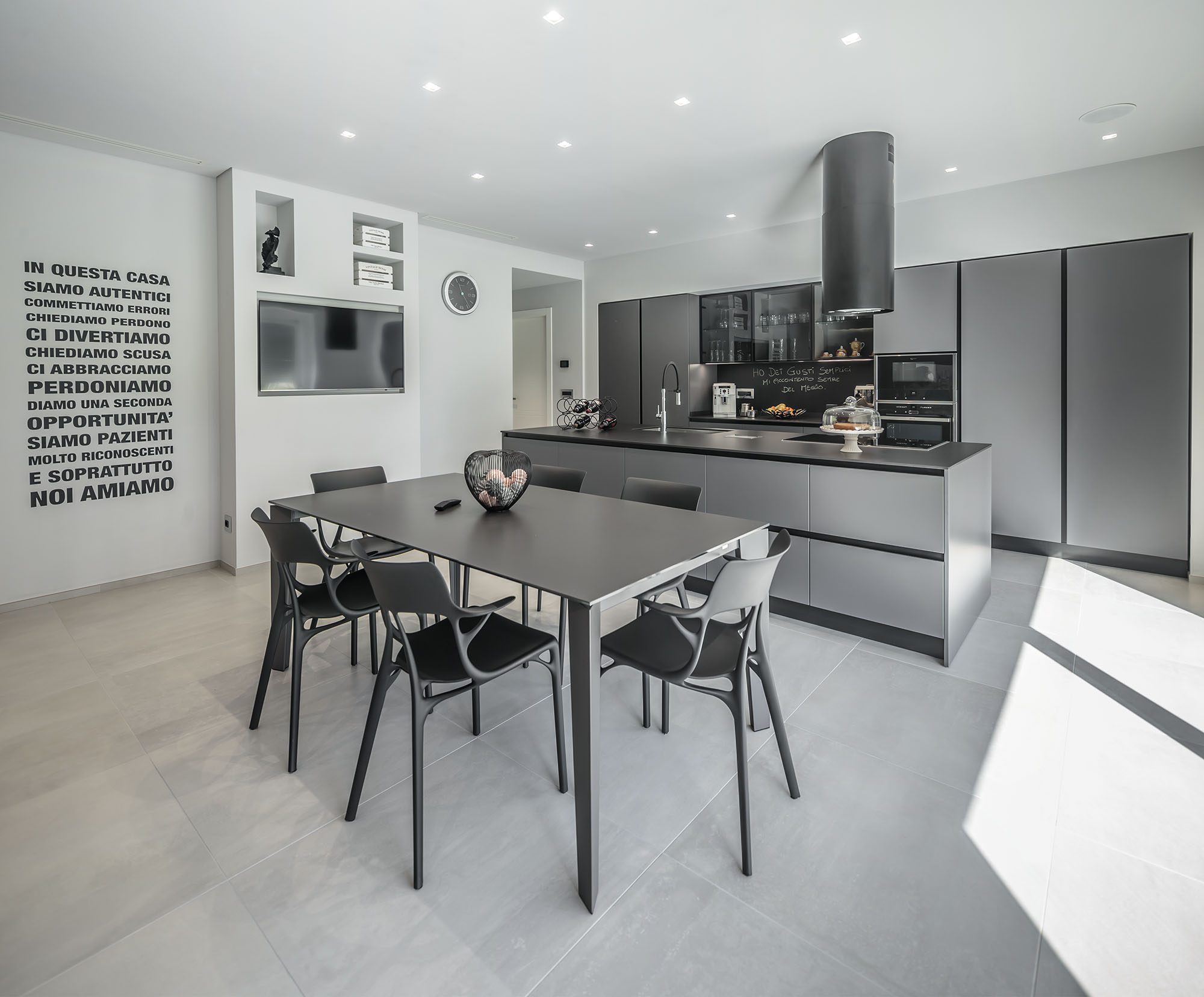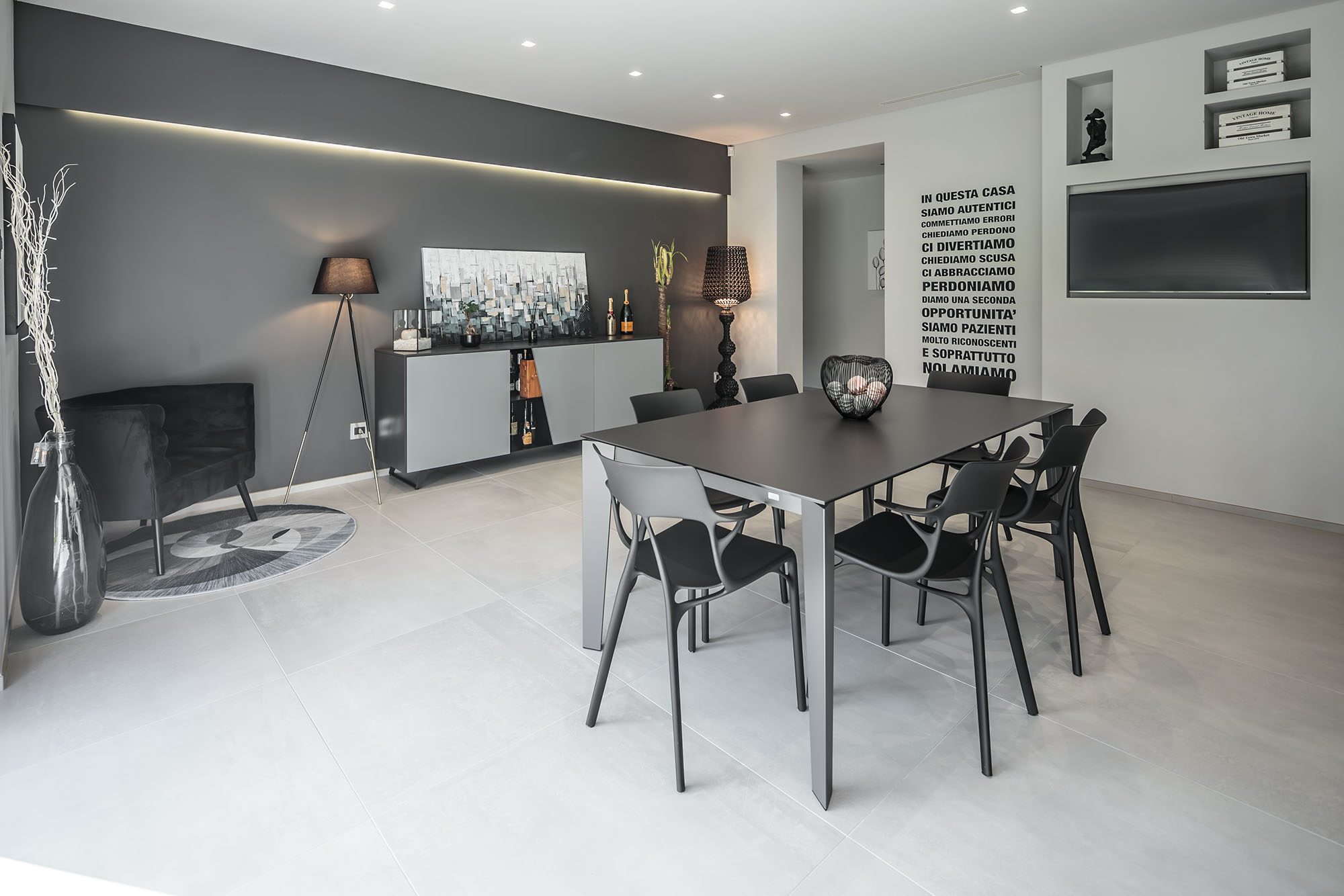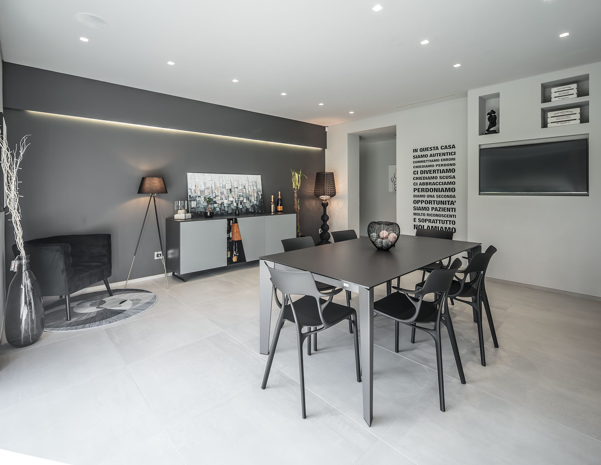 Progetto di arredo in stile minimal moderno con forti contrasti chiaro-scuro ambiente living open space.