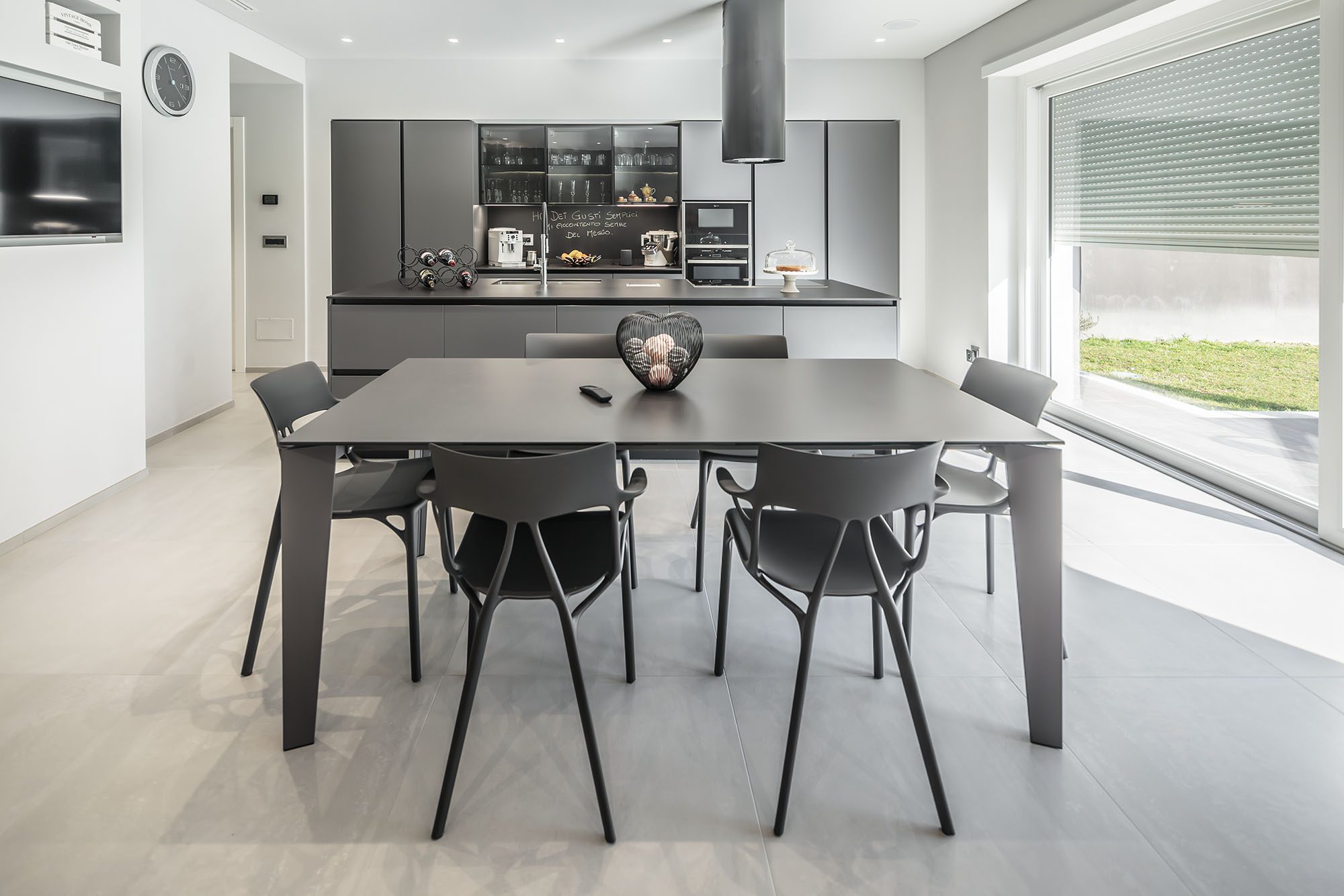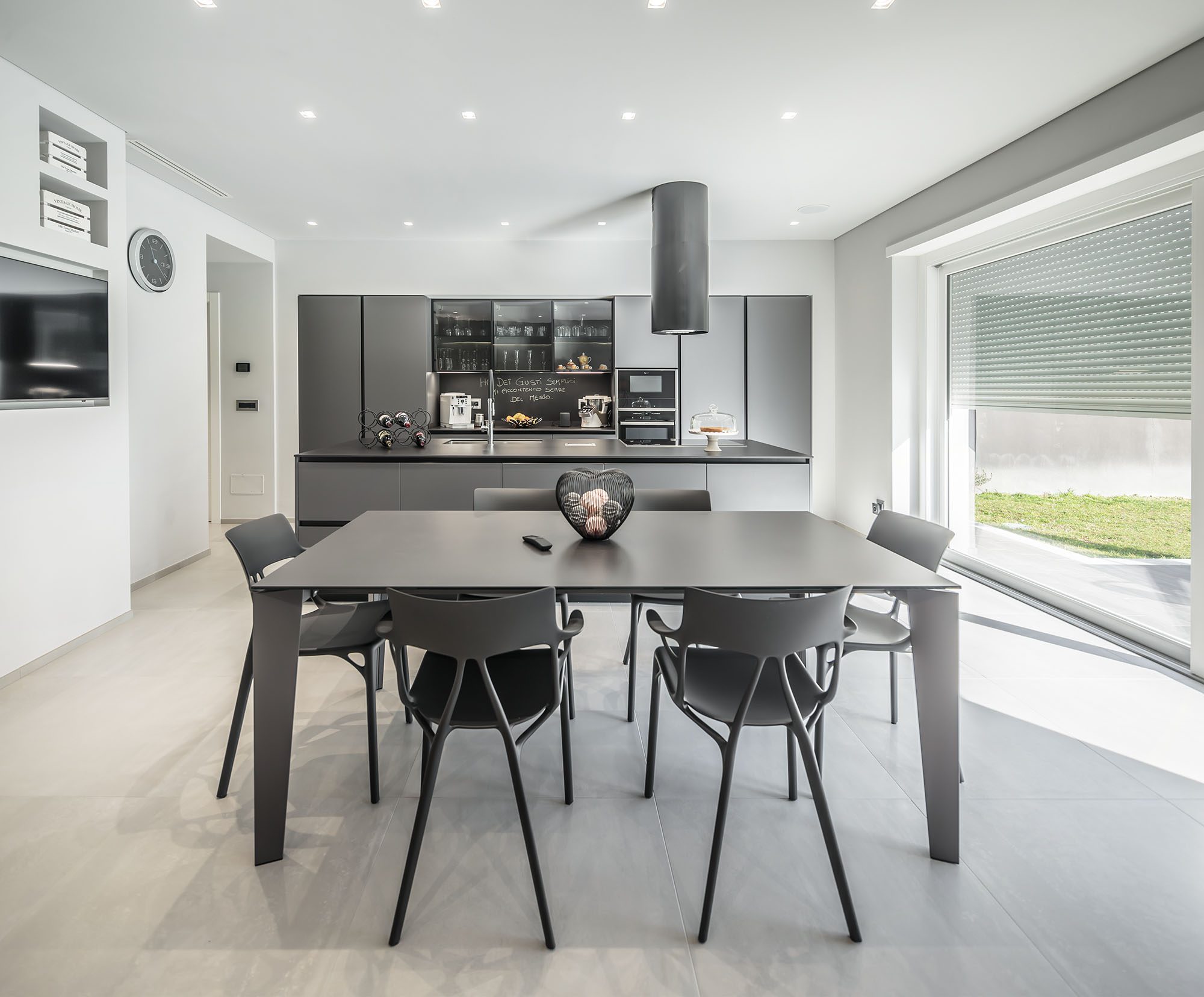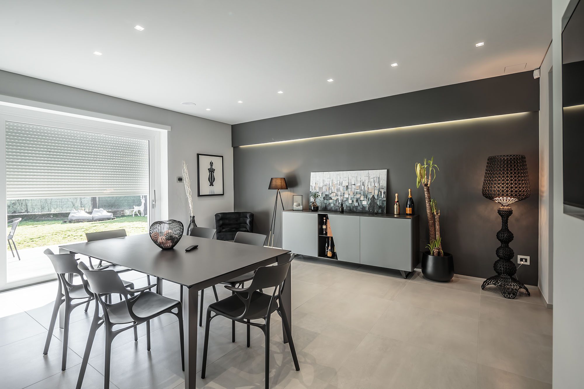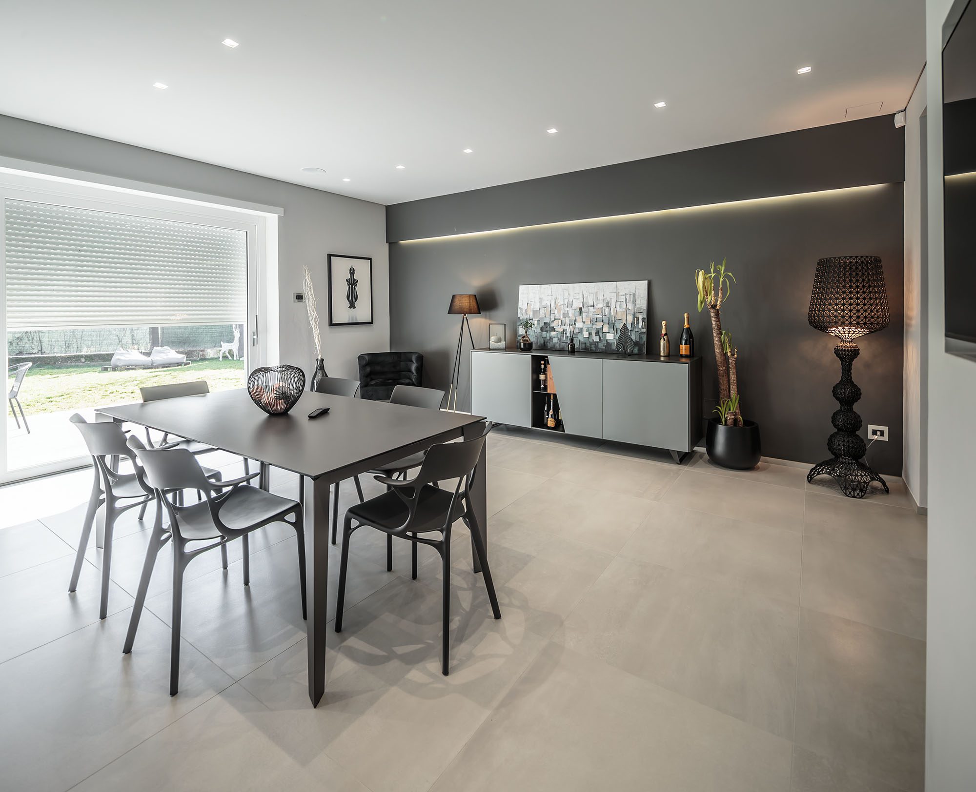 Progetto di arredo in stile minimal moderno con forti contrasti chiaro-scuro ambiente living open space.