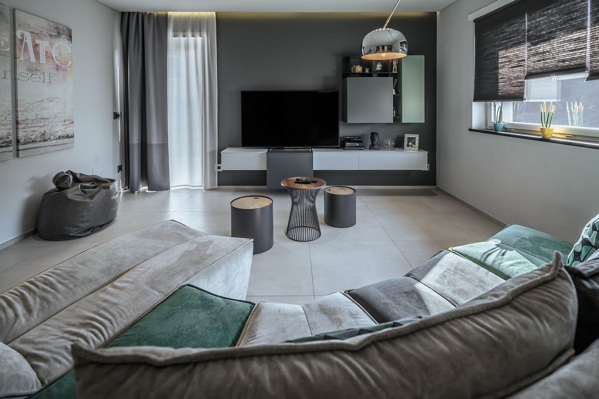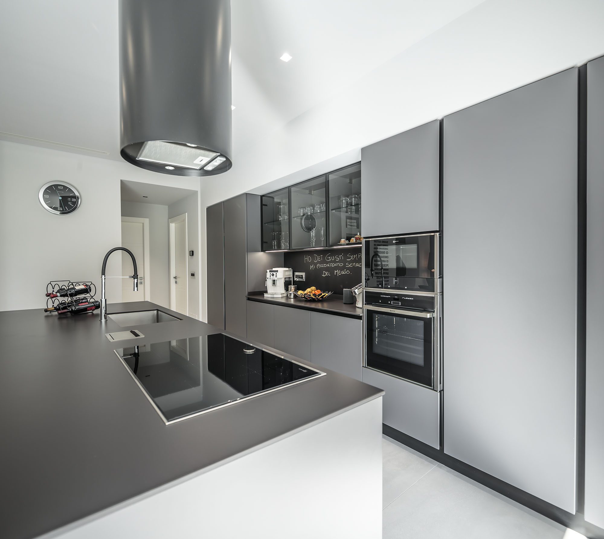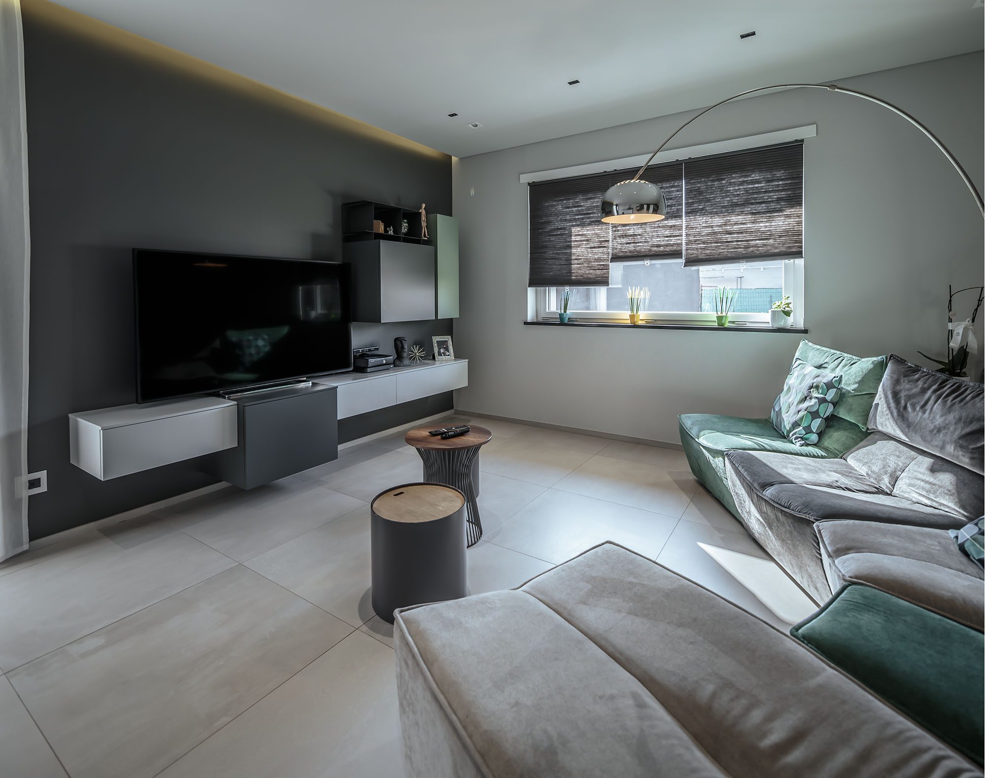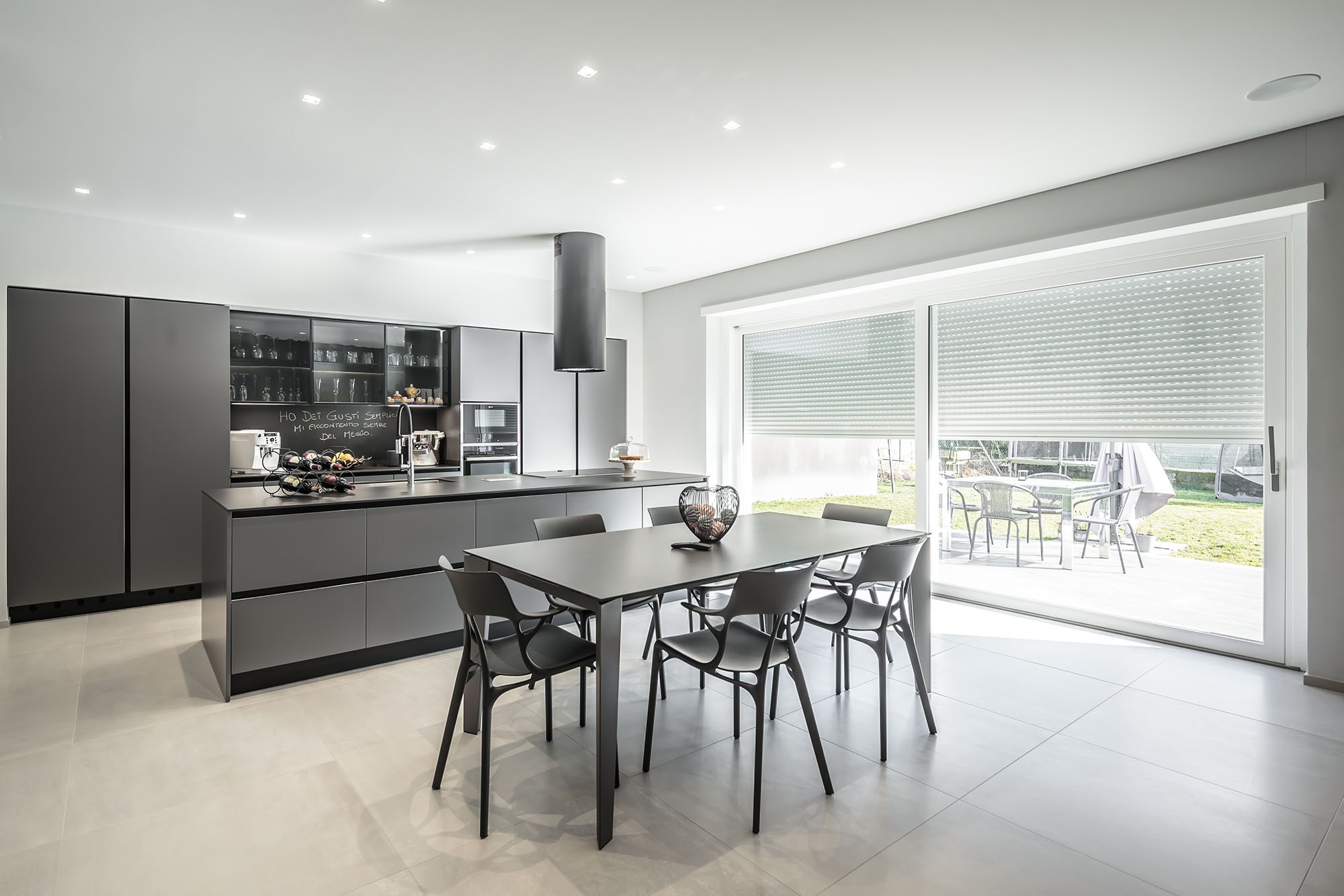 Progetto di arredo in stile minimal moderno con forti contrasti chiaro-scuro ambiente living open space.
