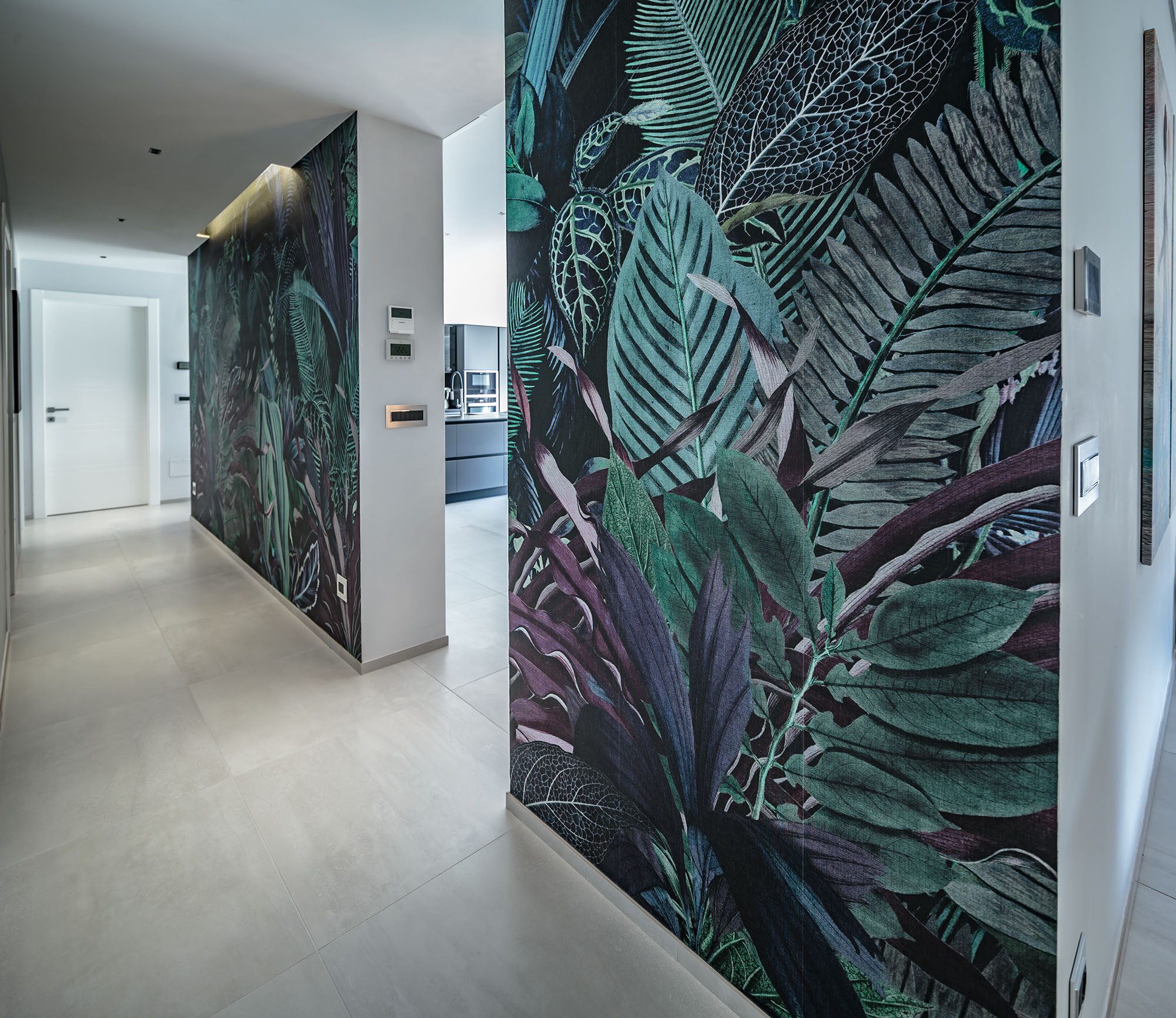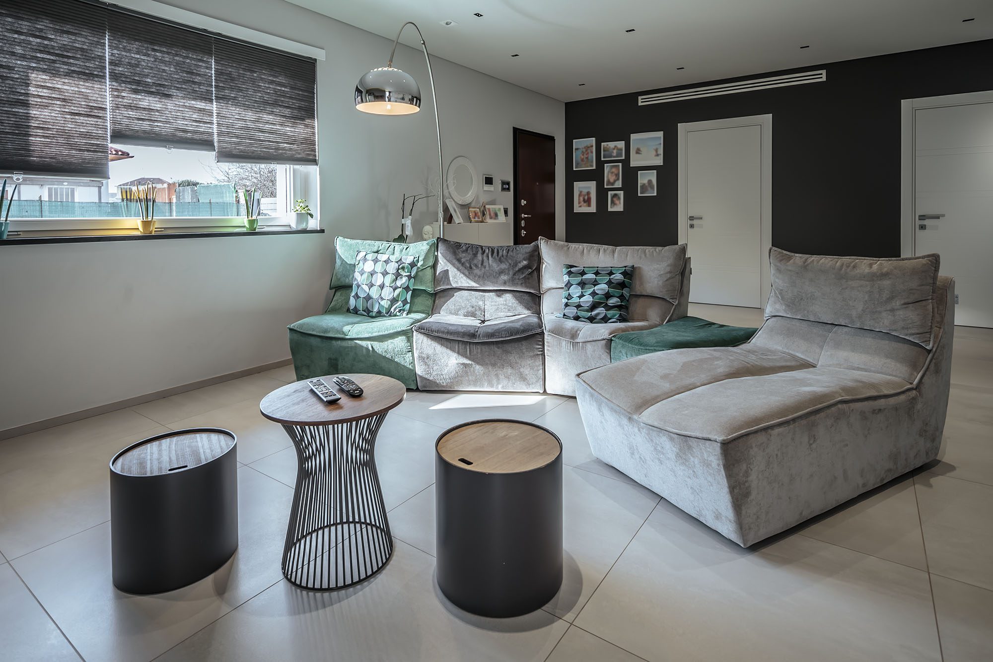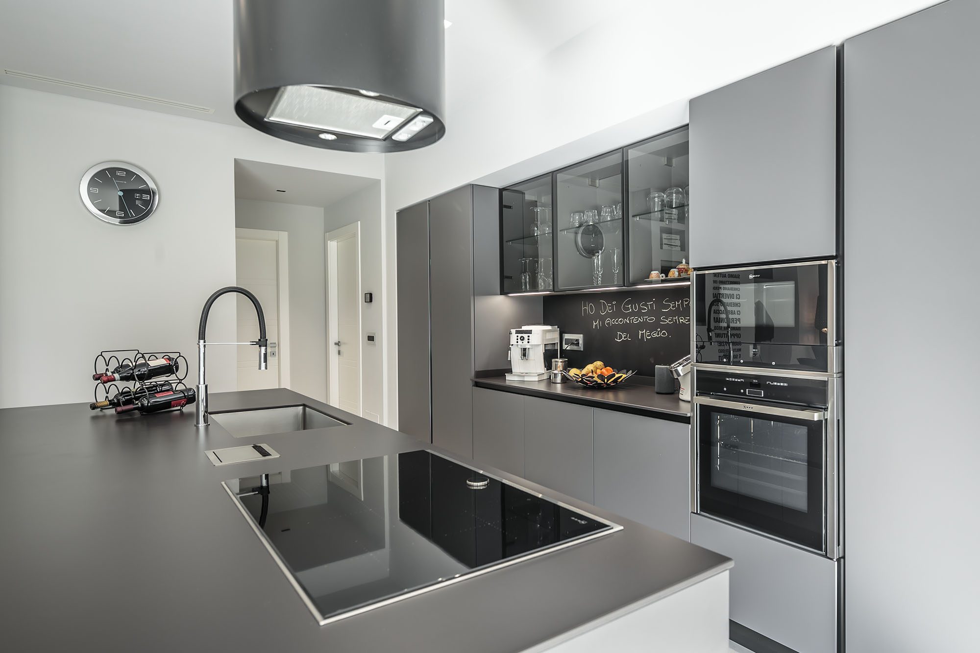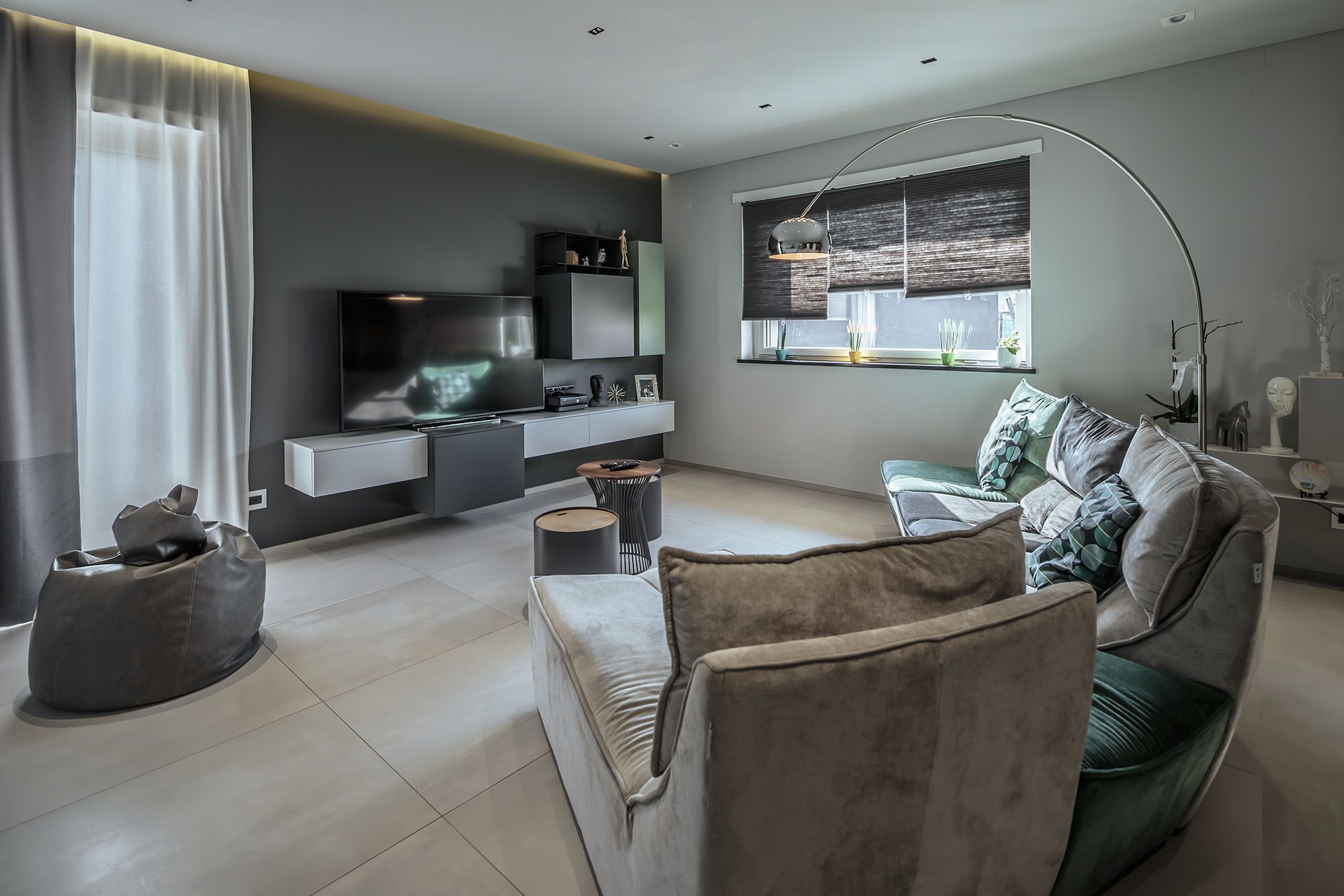 Progetto di arredo in stile minimal moderno con forti contrasti chiaro-scuro ambiente living open space.
