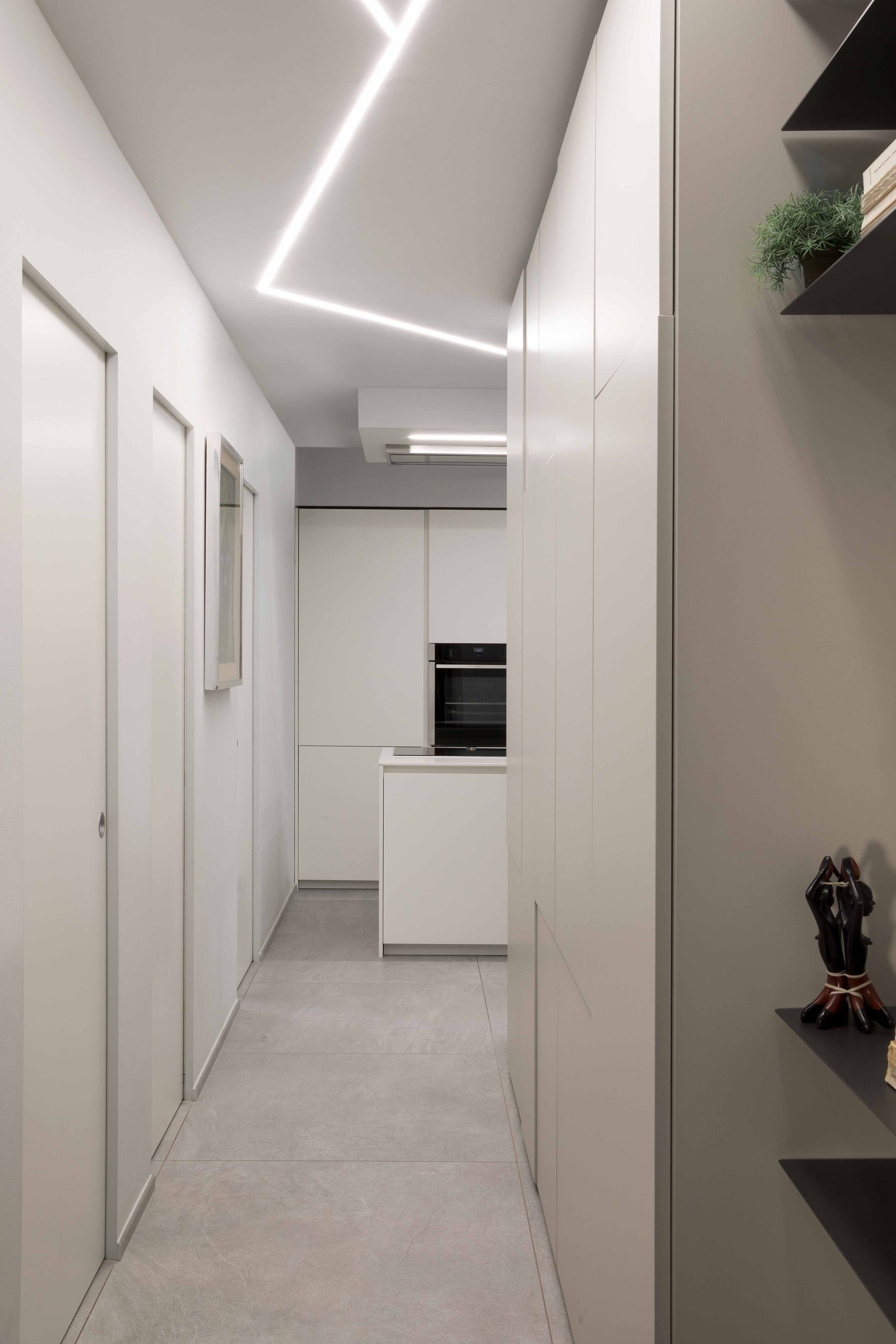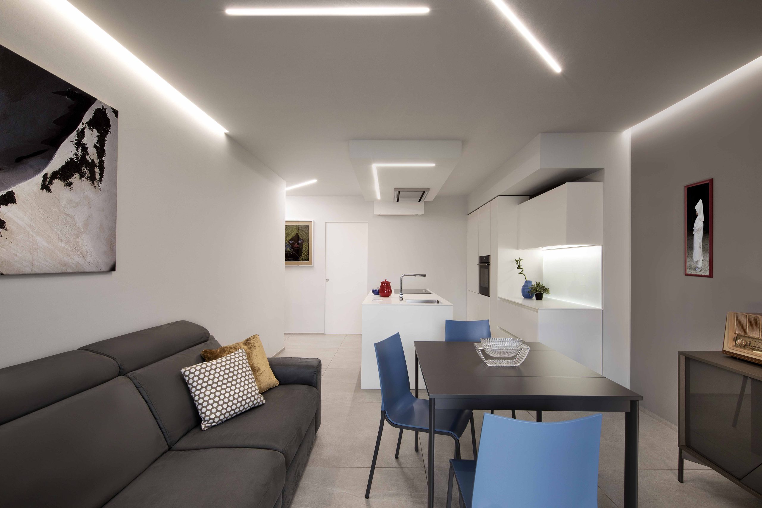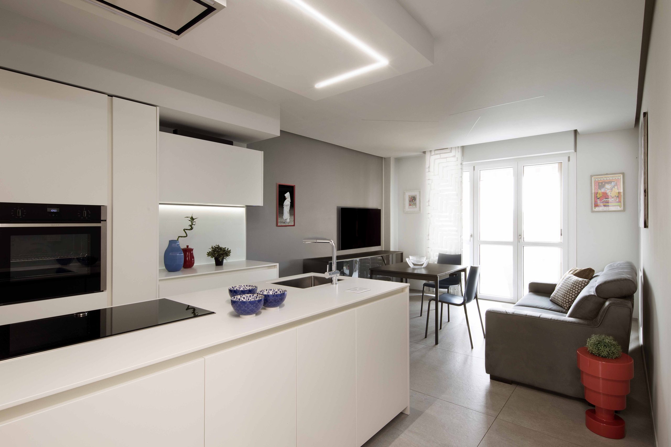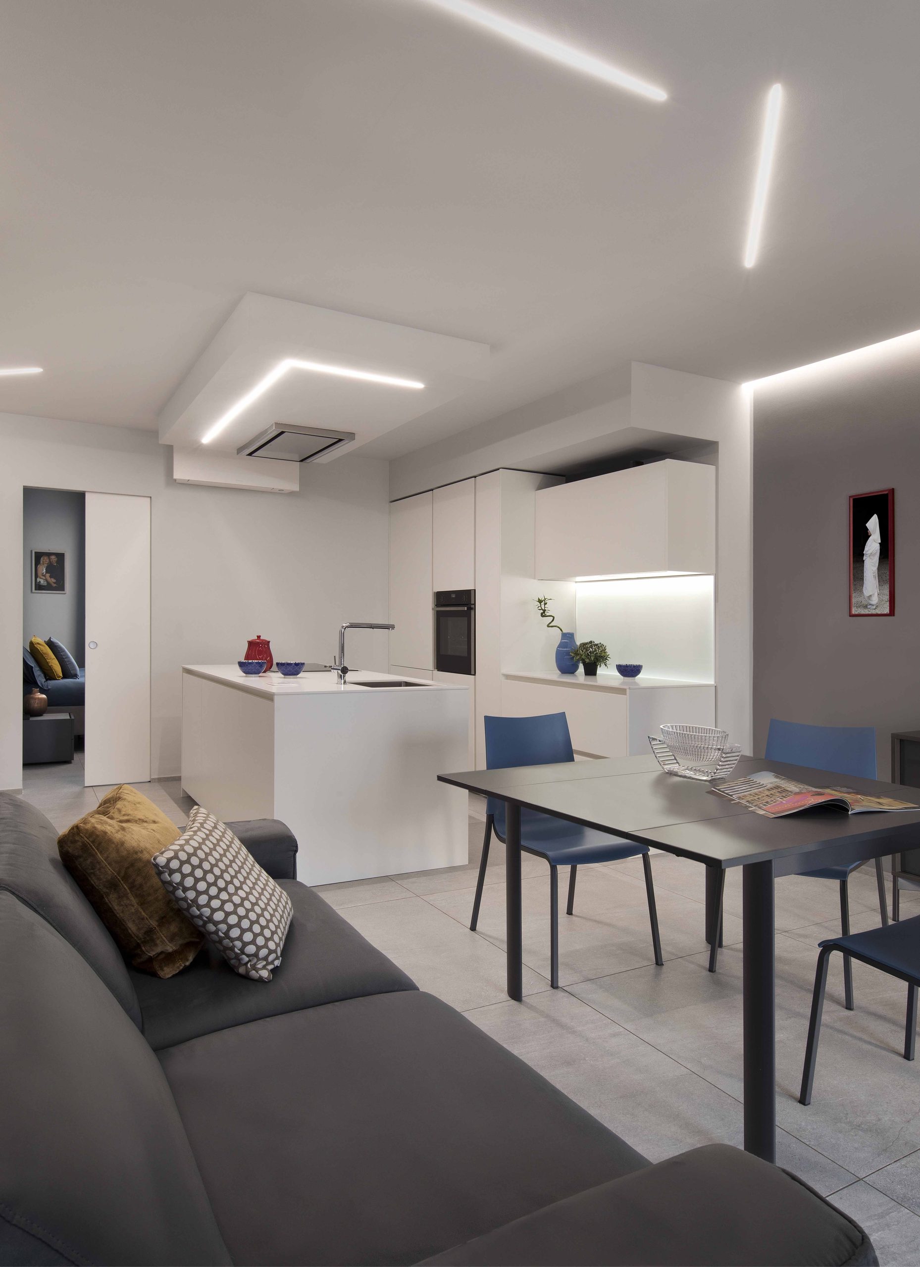 La cucina, nicchiata all’interno di cartongessi su misura, è pensata come un volume architettonico integrato.