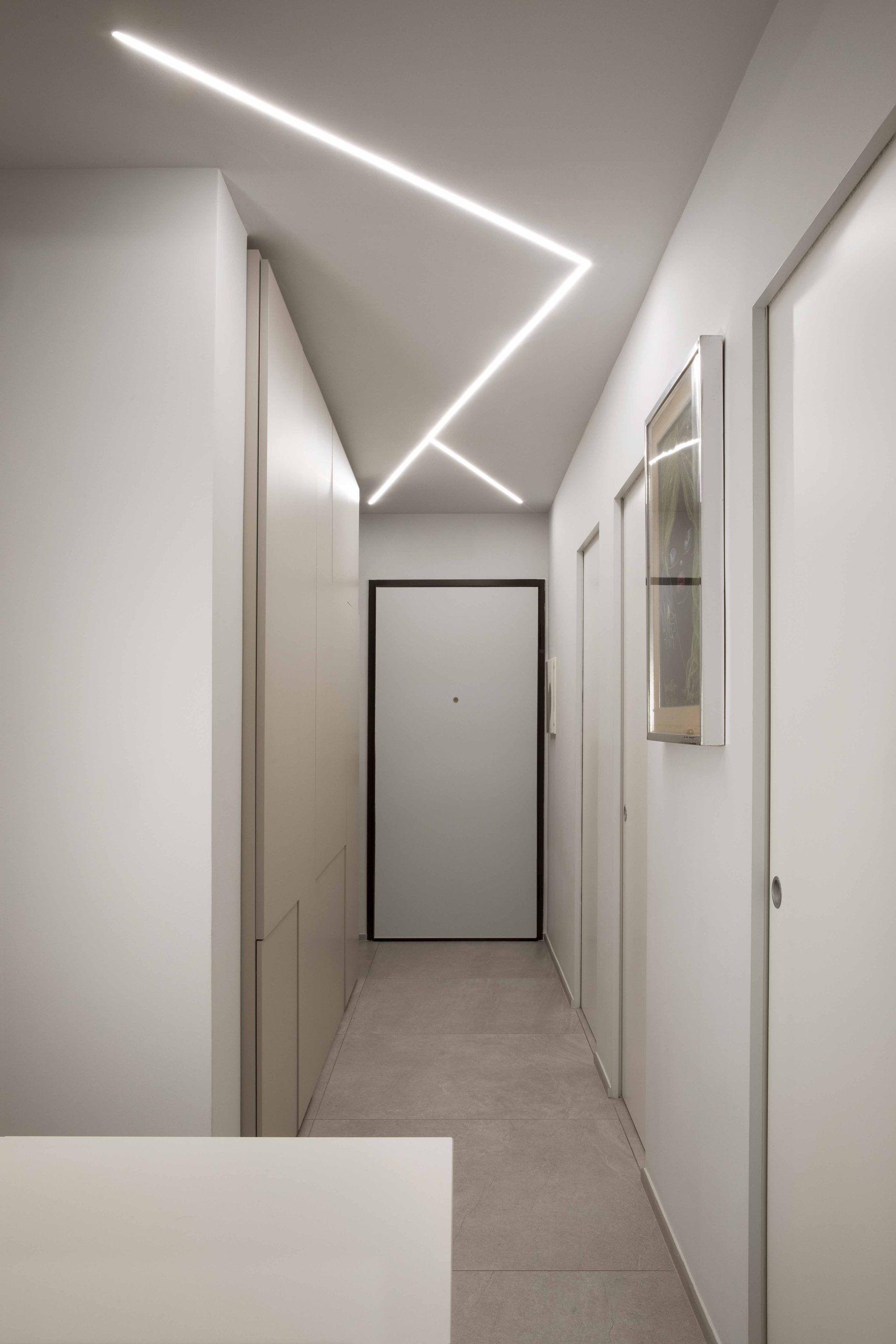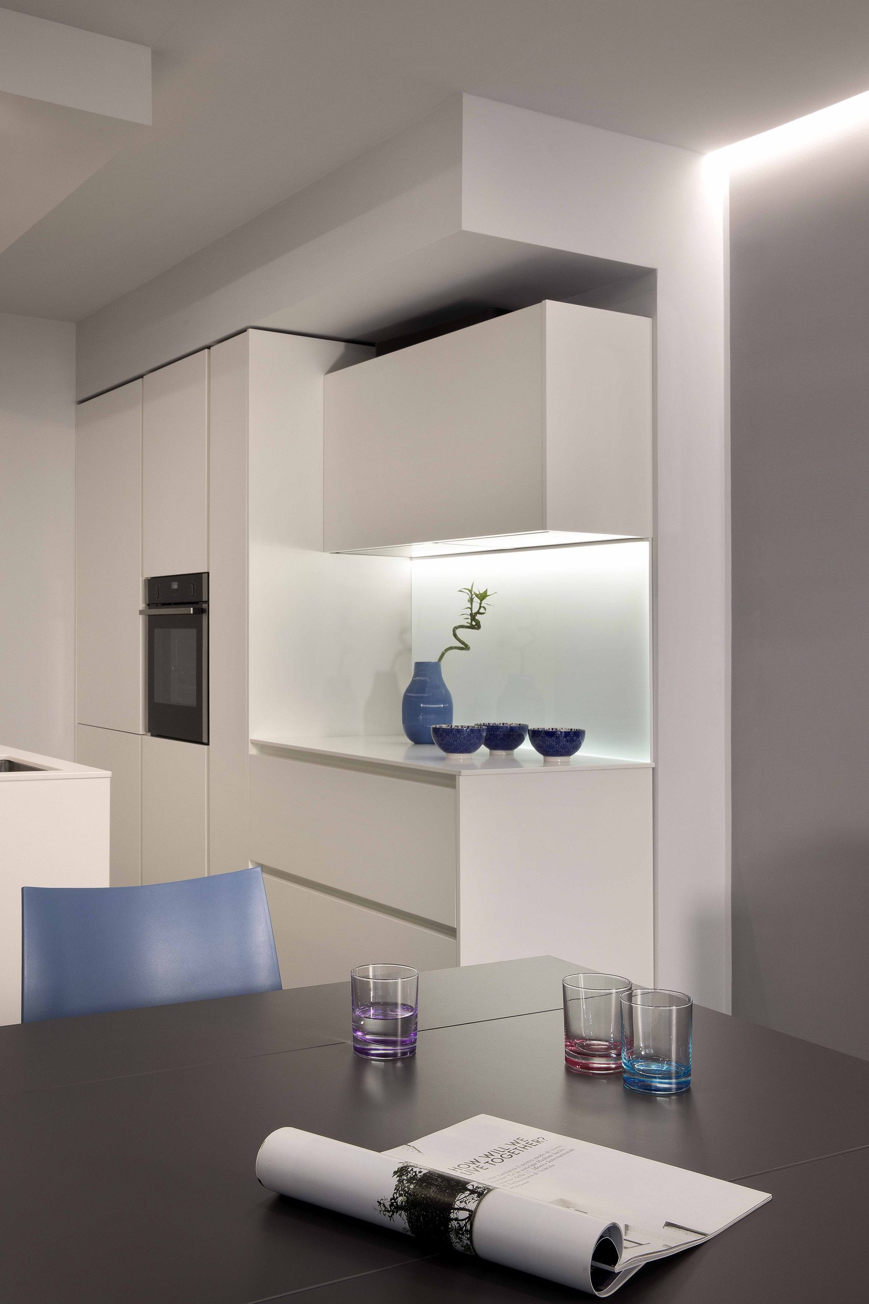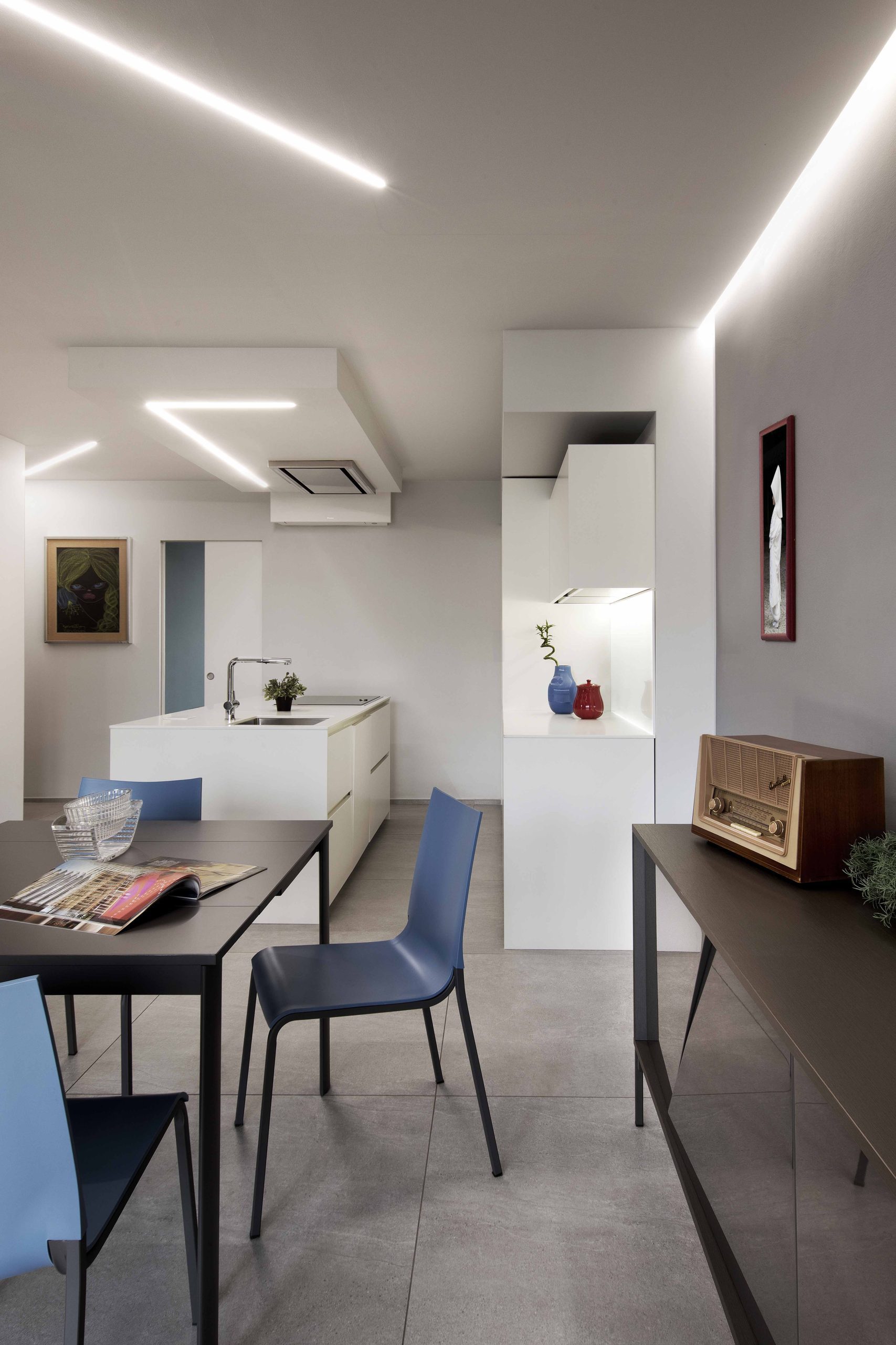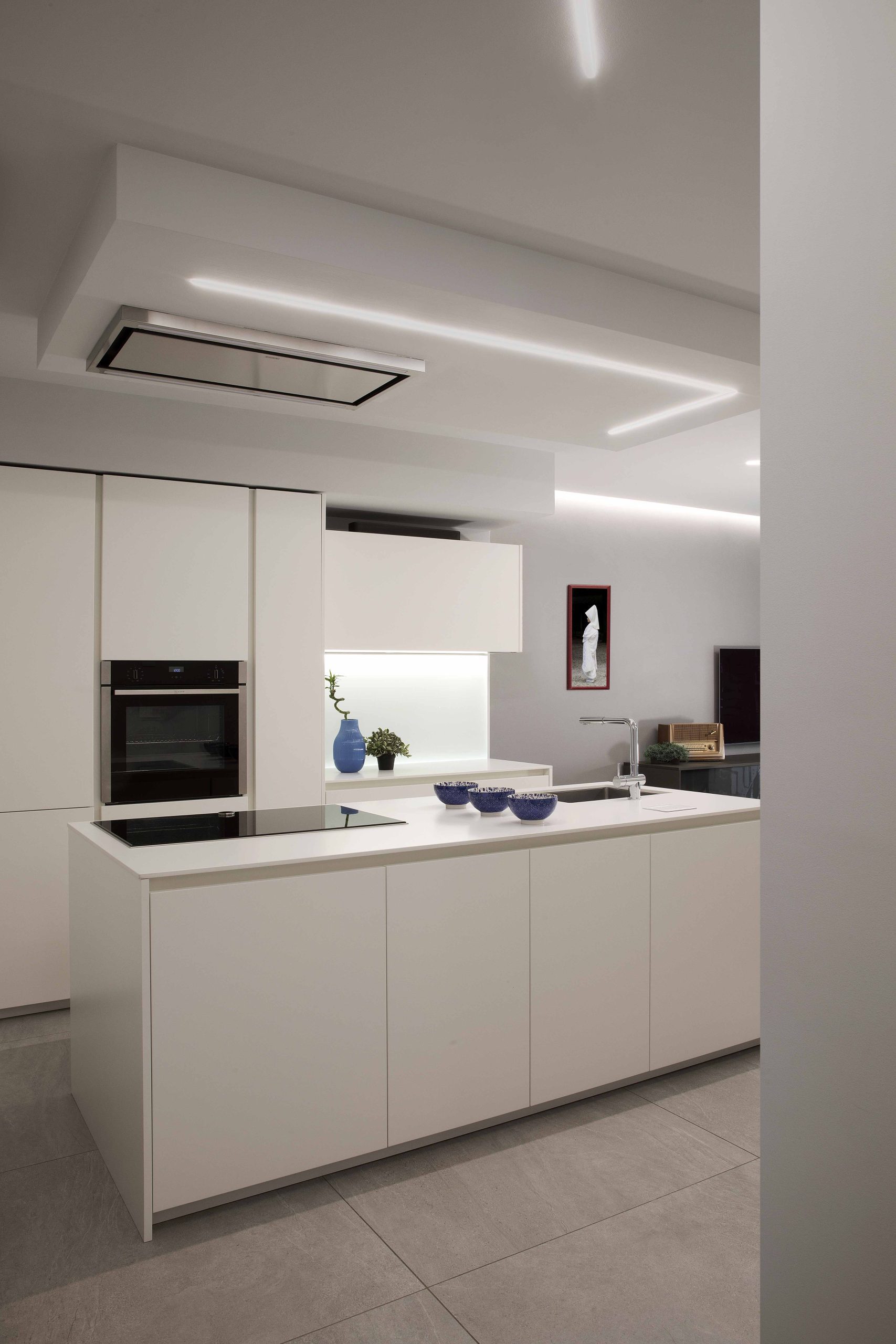 La cappa incassata a soffitto mantiene pulita la composizione, lasciando che l’illuminazione diventi protagonista e che la percezione visiva resti fluida e ordinata.