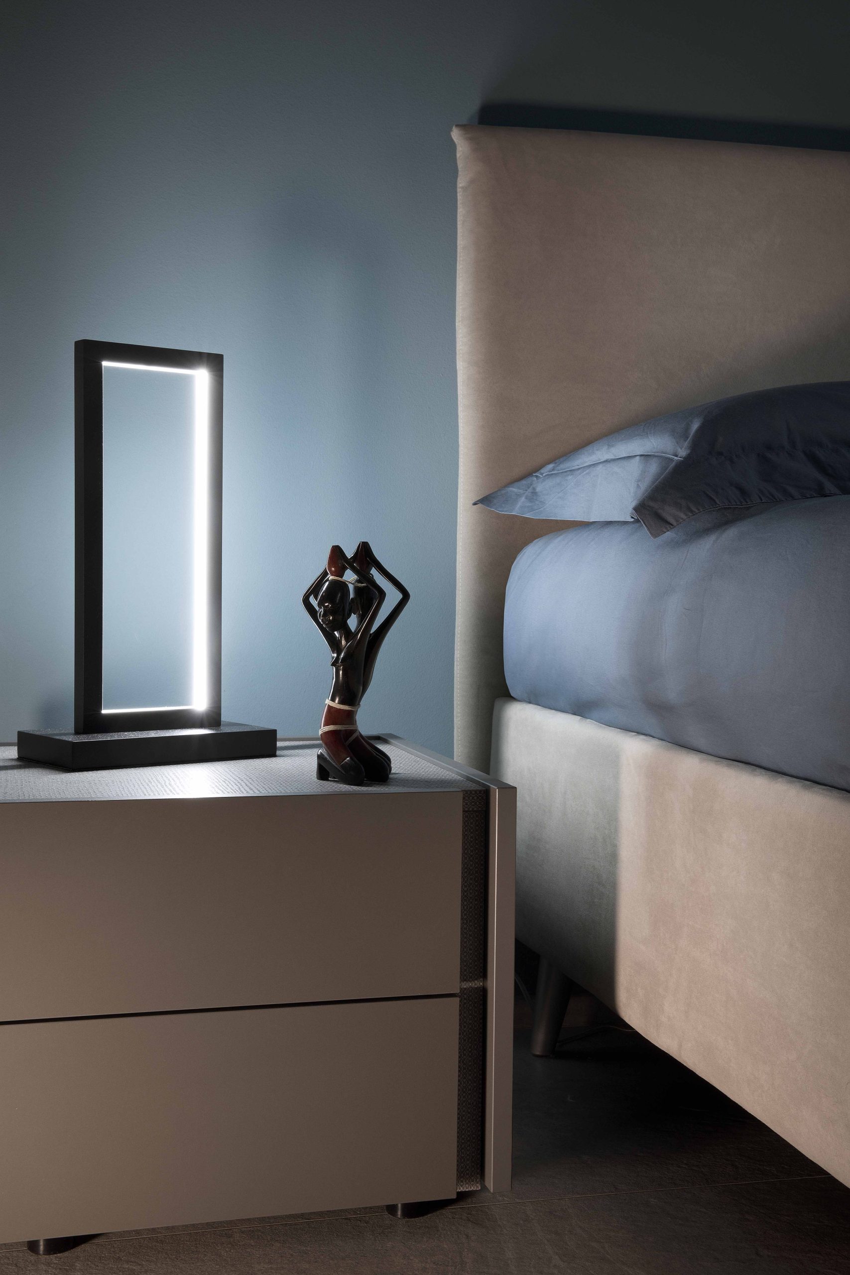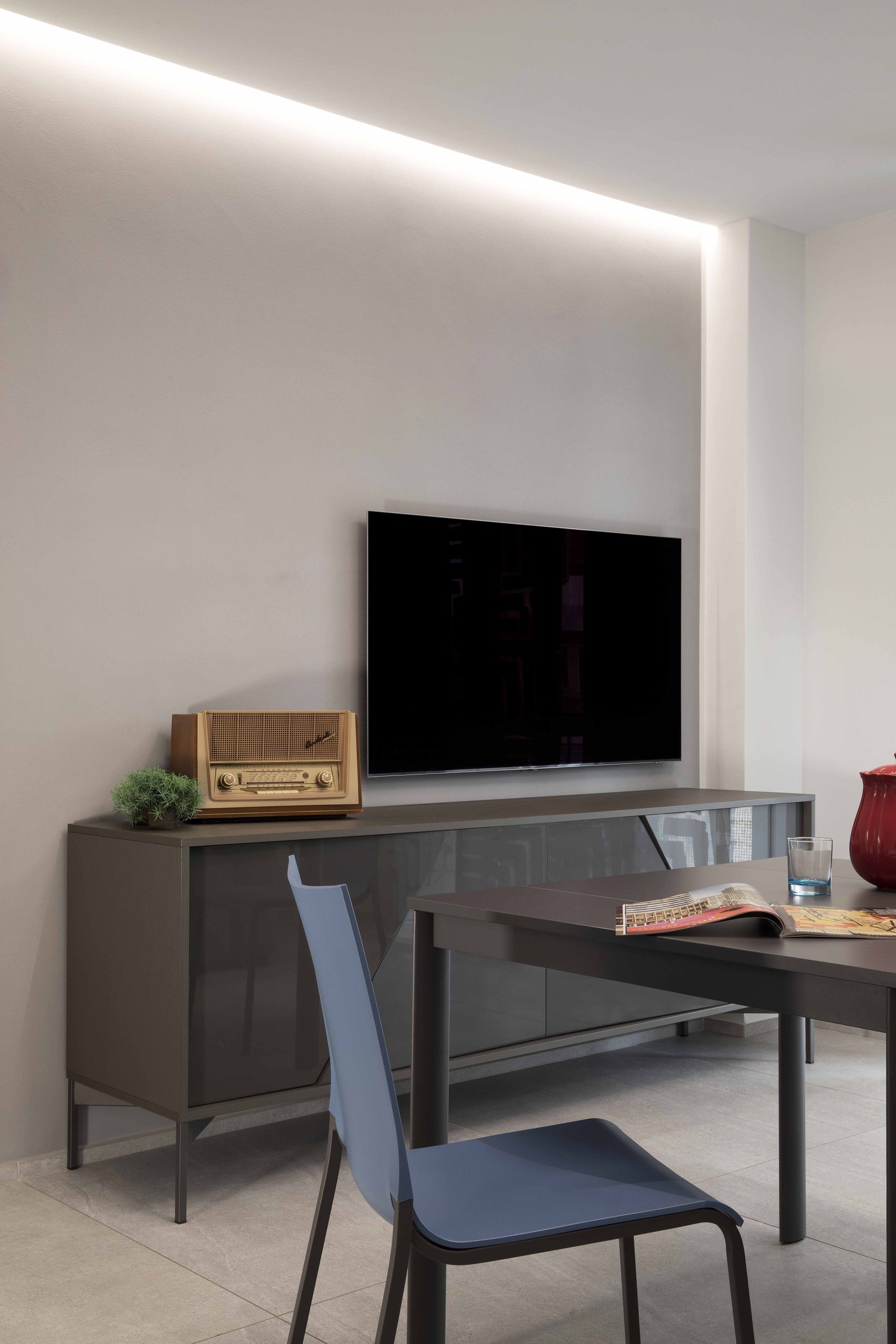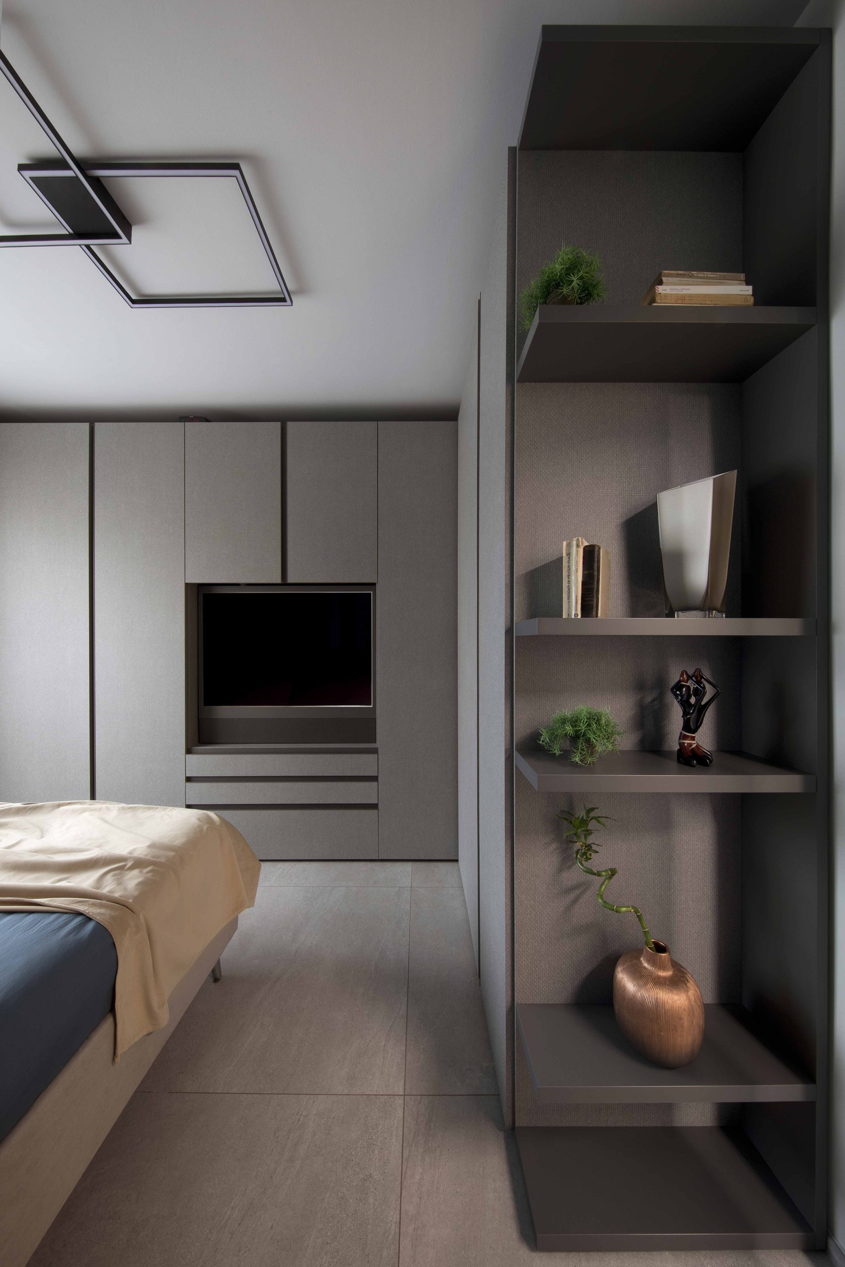 Il protagonista è il grande armadio angolare Go Up di Alf DaFrè, con finitura Gurè, un nobilitato che restituisce la sensazione tattile di un tessuto.