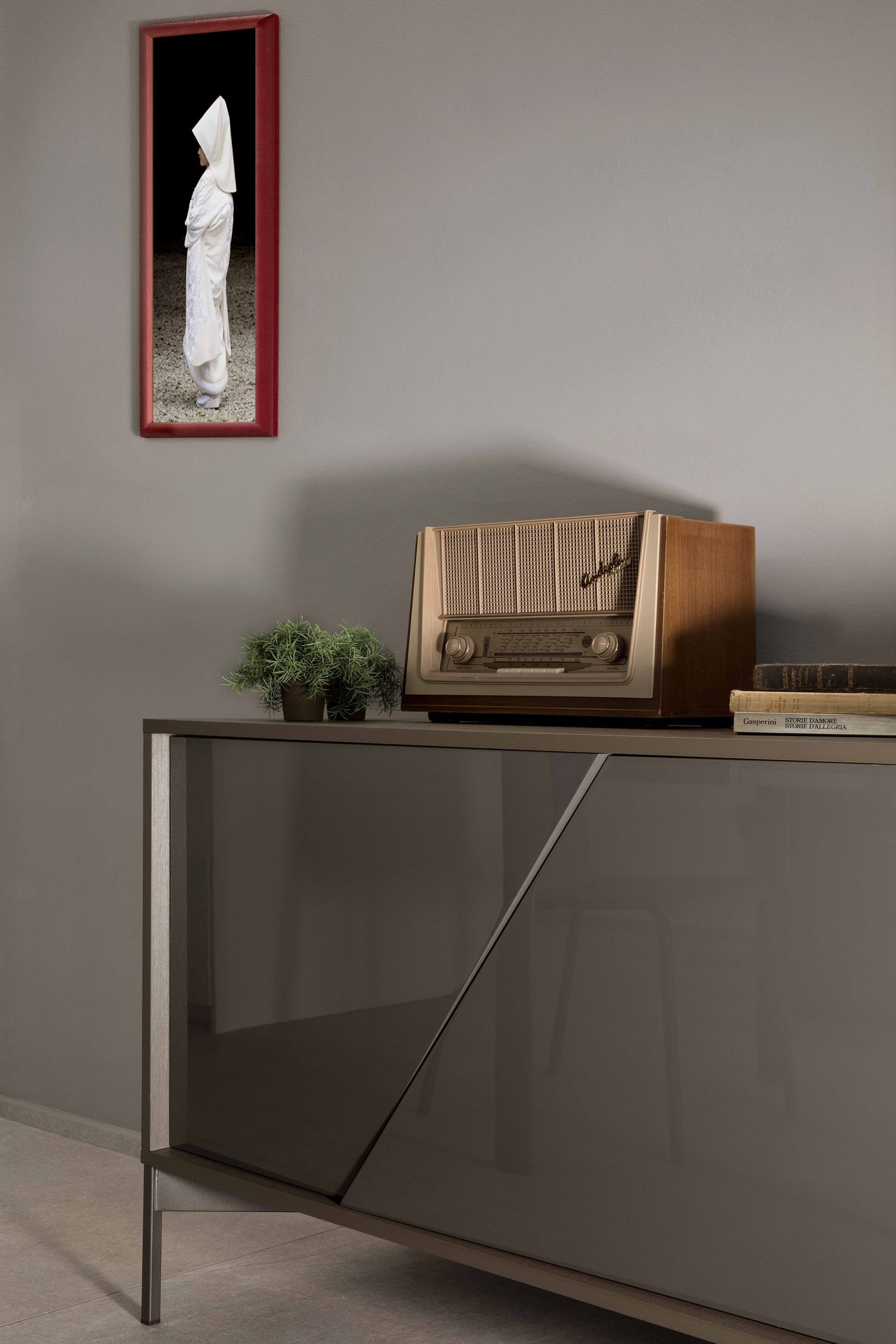 Il profilo Moka Shine incornicia le superfici chiare, creando un gioco di luce e profondità.