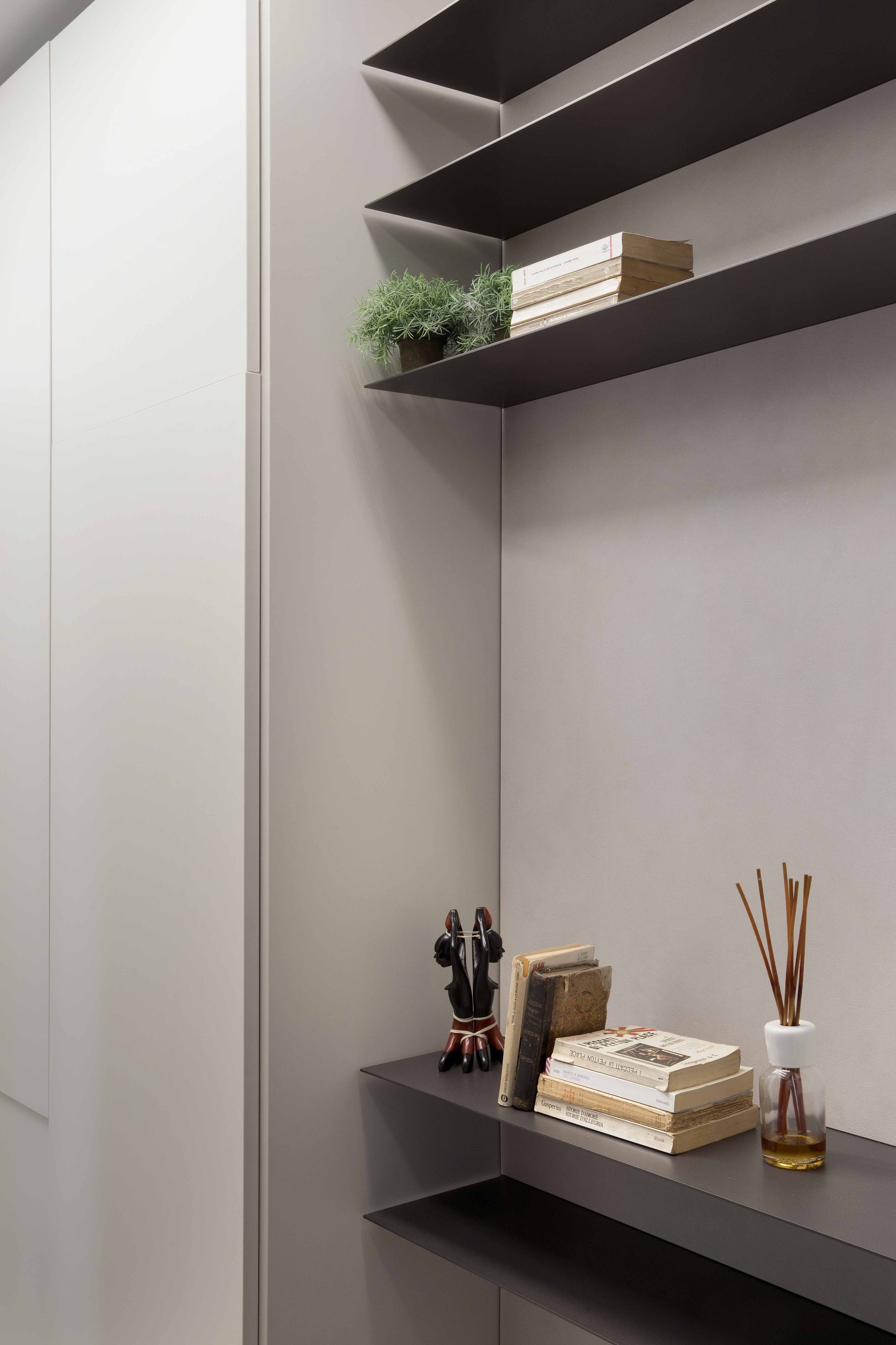 Le mensole in acciaio scuro introducono un contrasto materico e formano una libreria leggera, che bilancia la linearità del mobile principale e aggiunge ritmo alla parete.