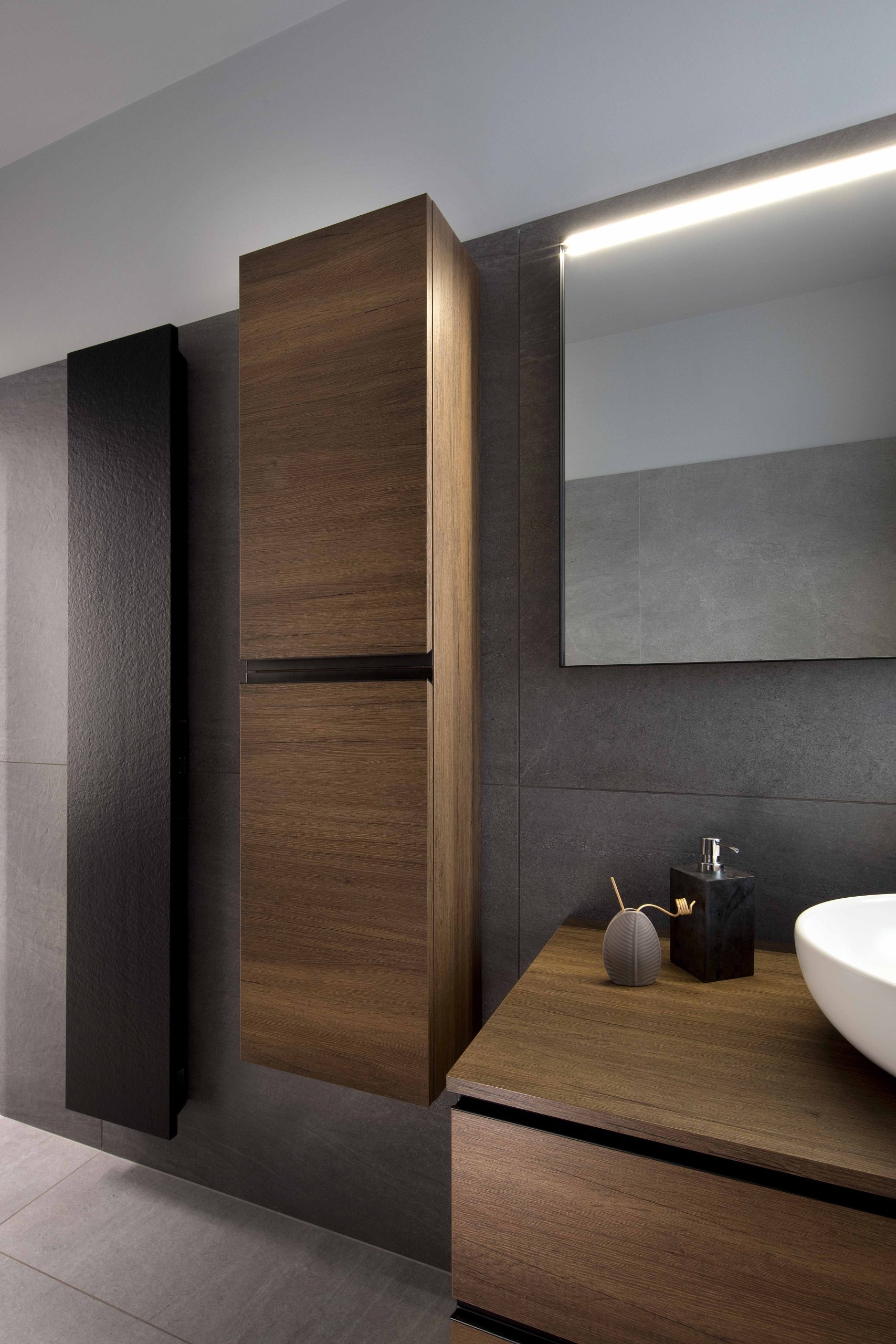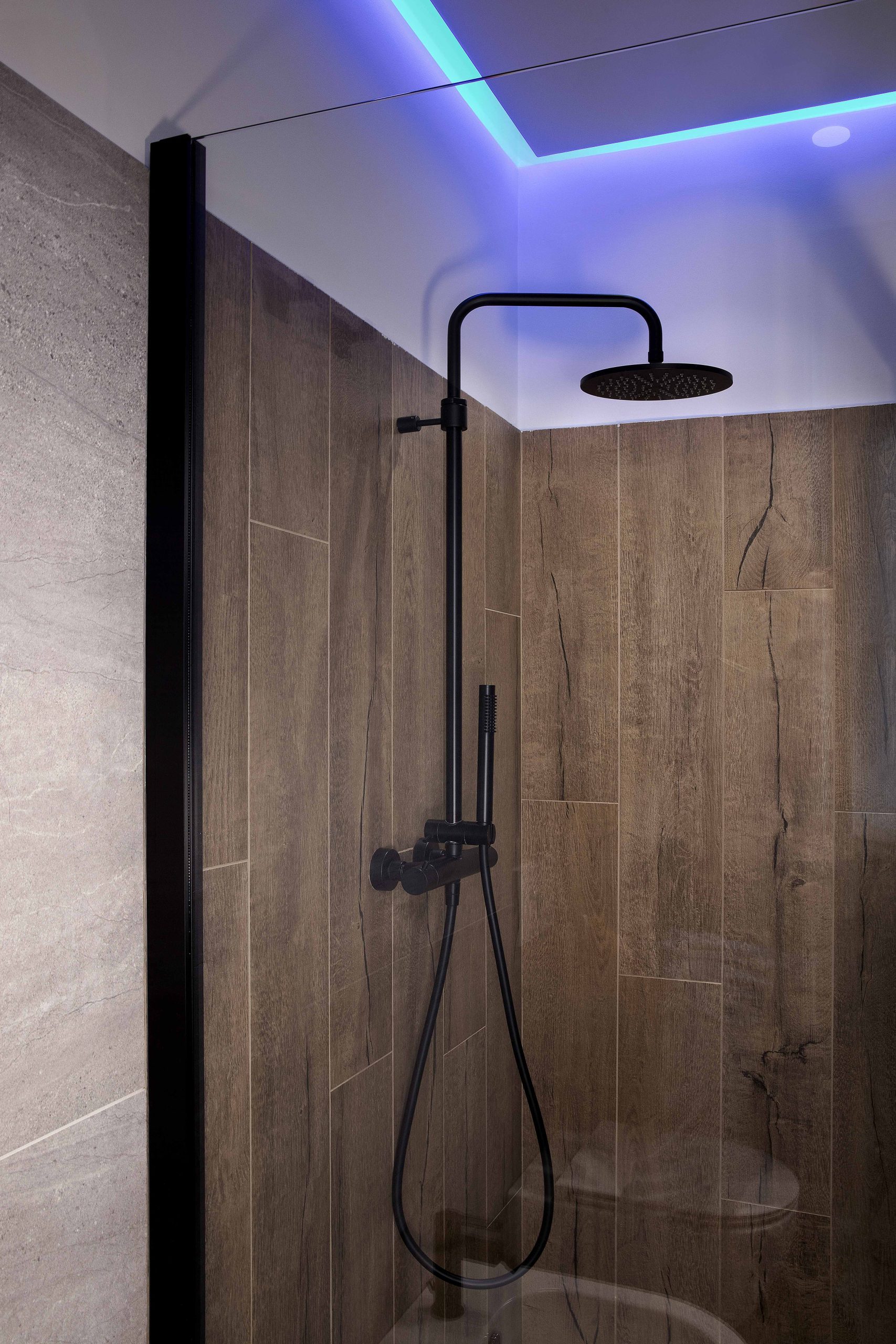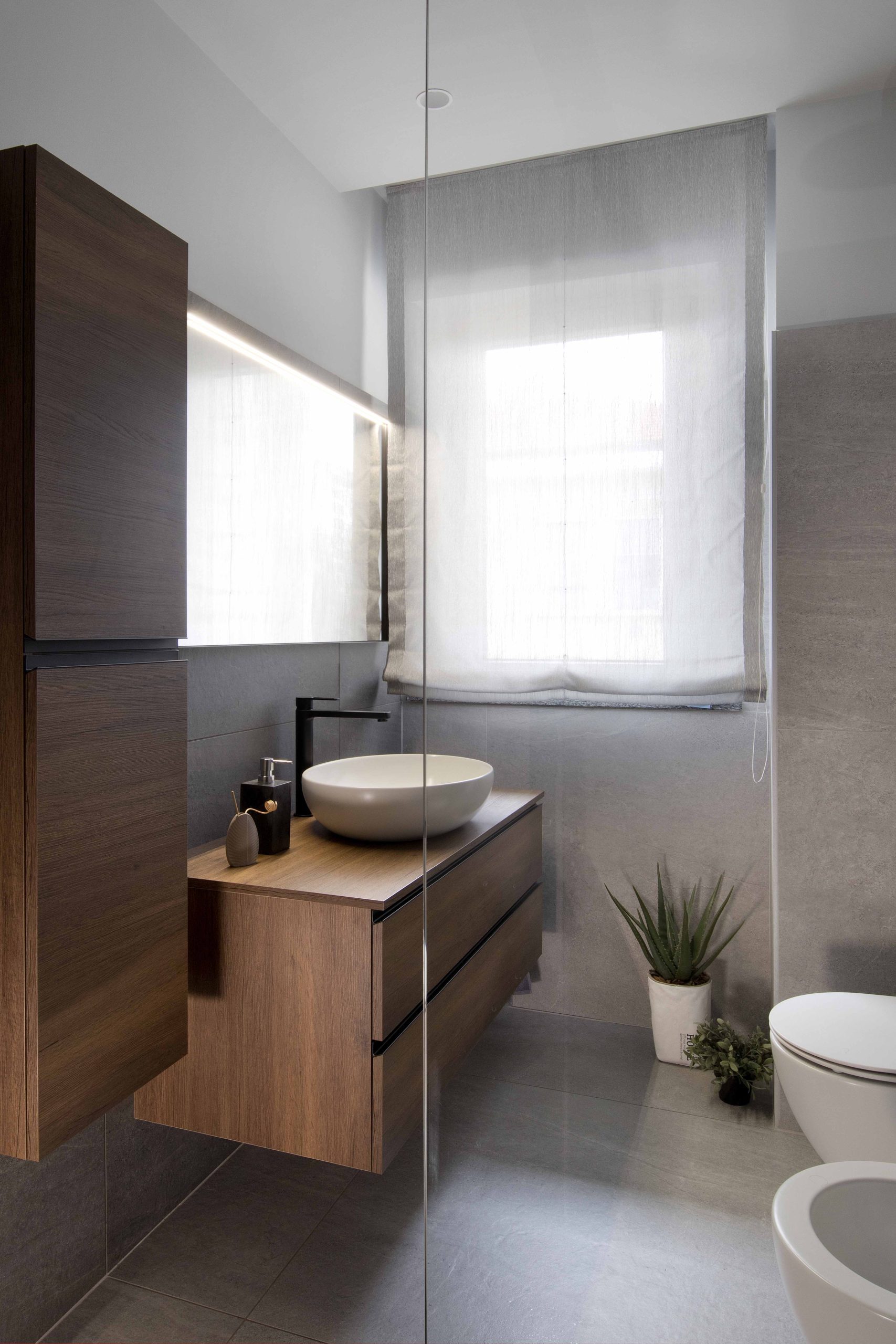 I pavimenti e rivestimenti in effetto cemento chiaro sono accostati a rubinetterie e profili neri, mentre le finiture più calde del legno nella doccia e nel mobile lavabo donano equilibrio e comfort visivo.