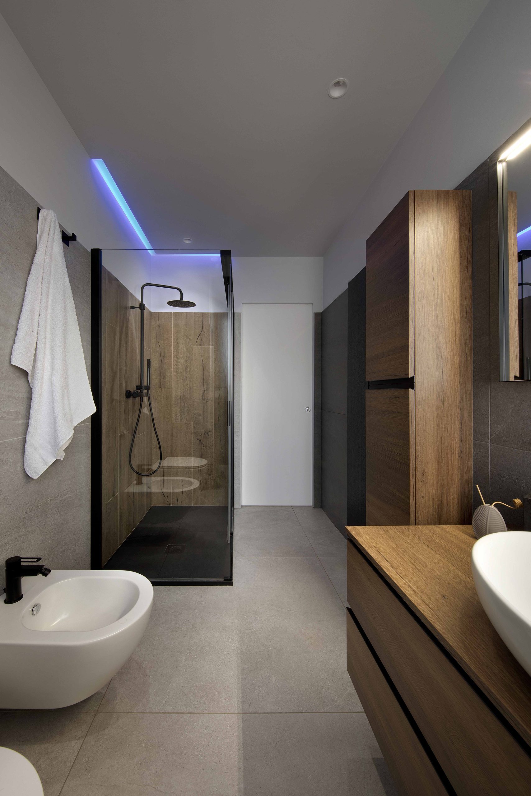 Nel bagno torna il dialogo tra chiaro e scuro, cifra stilistica del progetto.