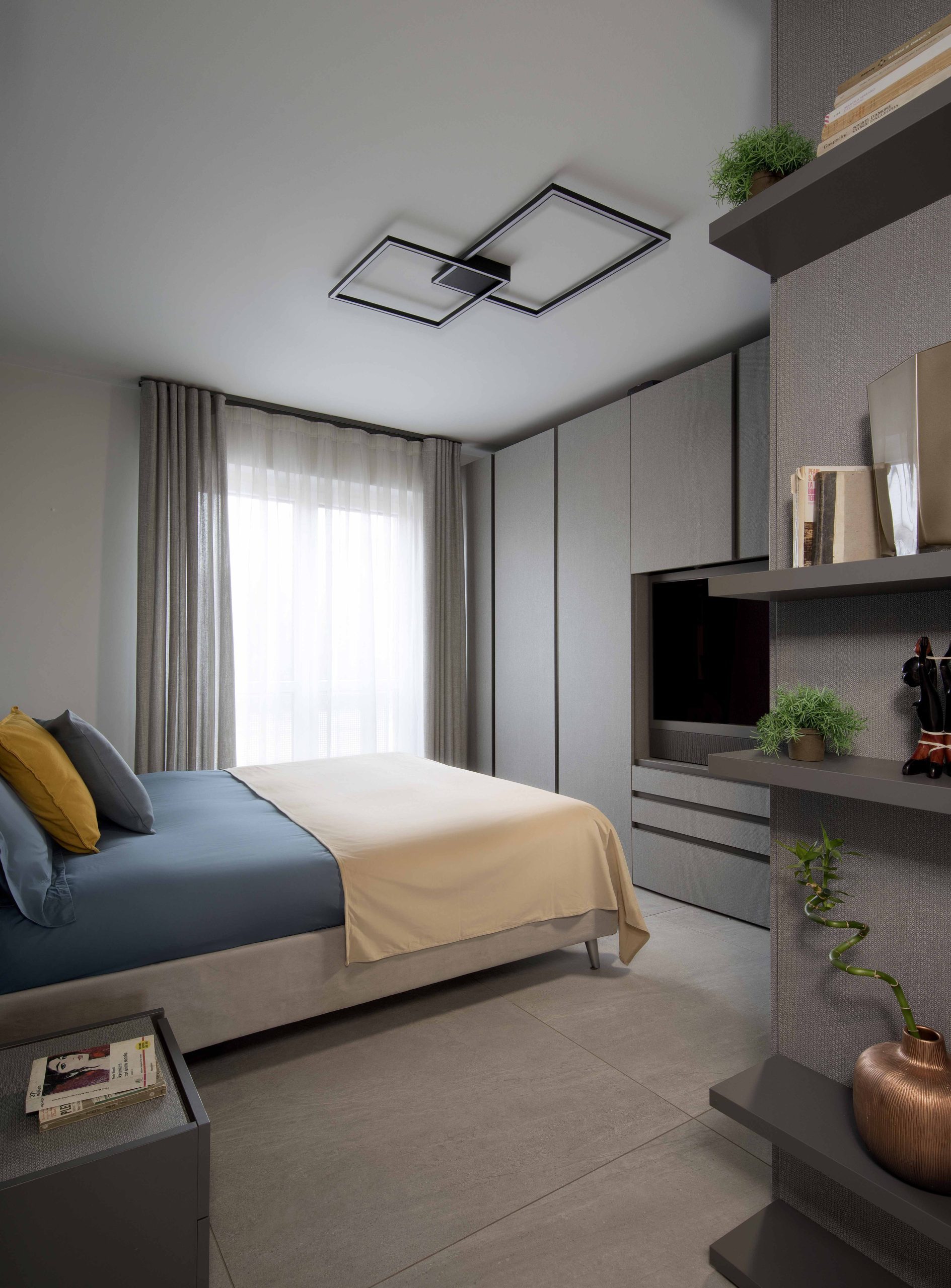 Anche la camera da letto riflette la filosofia del progetto: linee sobrie, volumi definiti e contrasti calibrati.