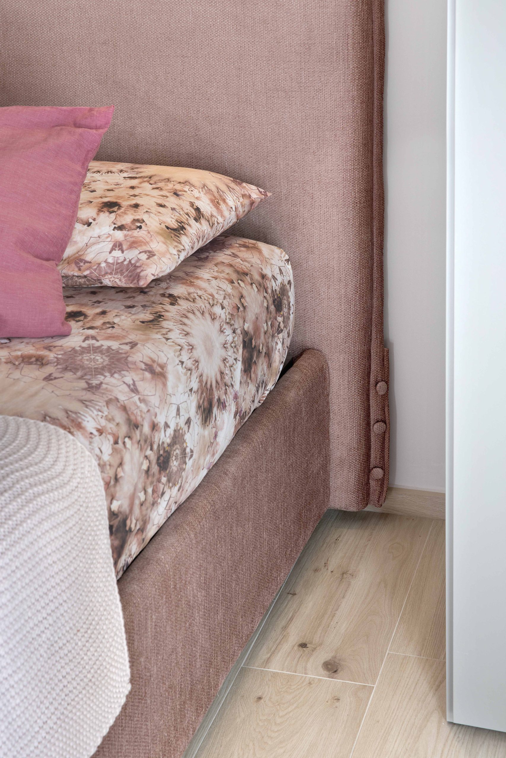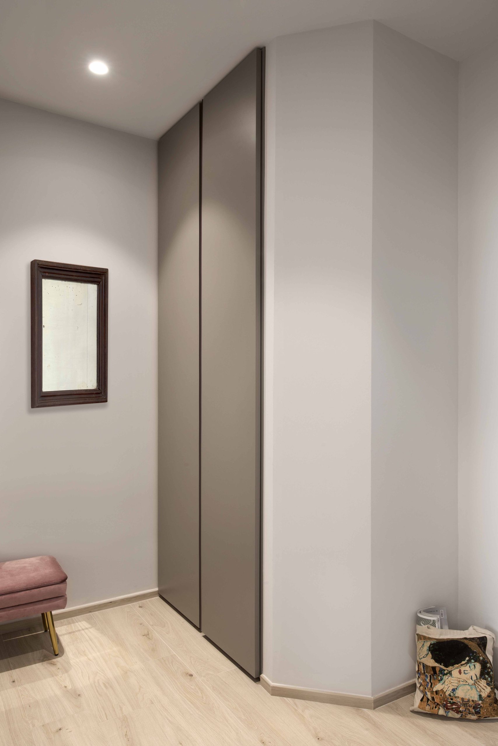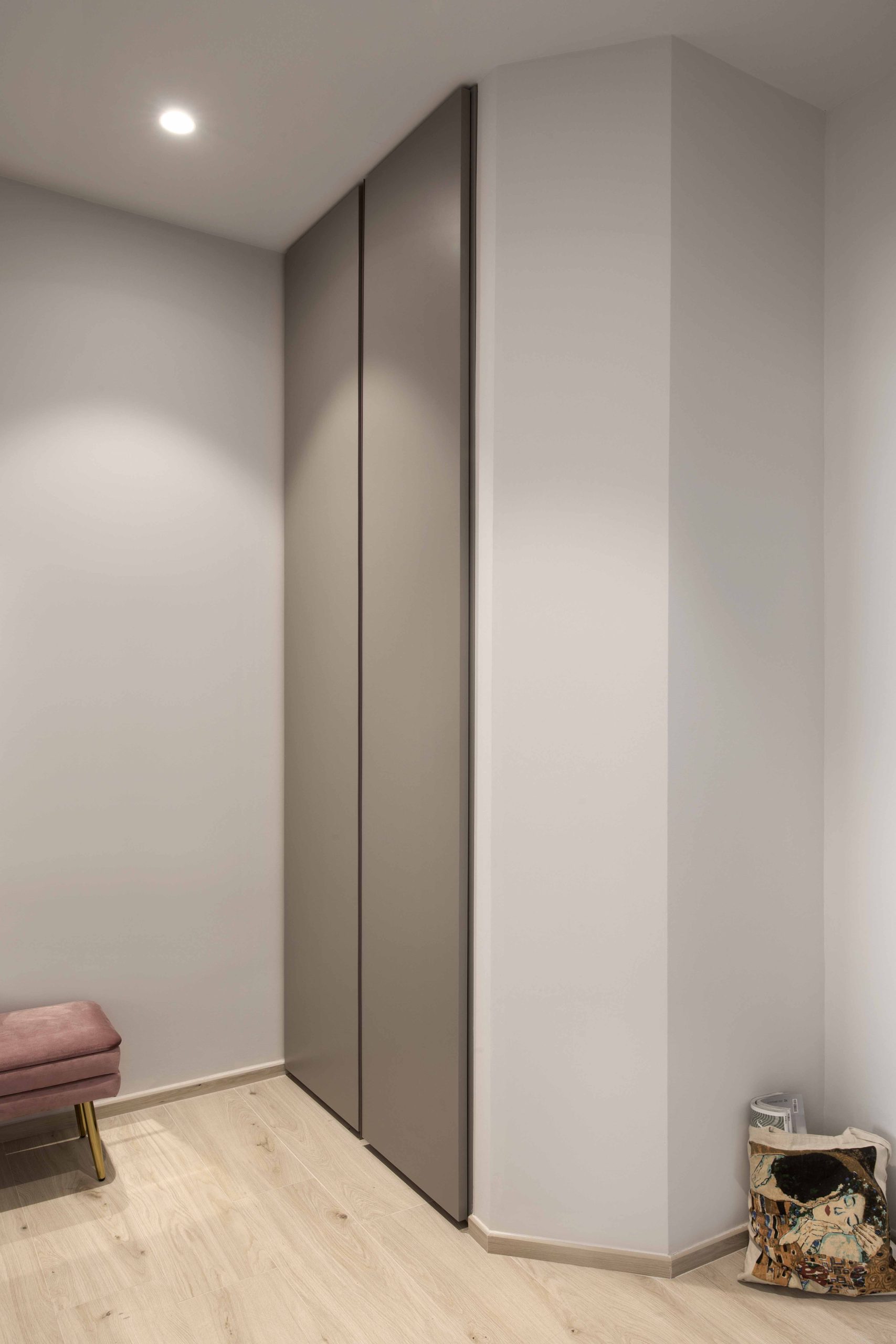 La palette neutra è ravvivata da un punto di colore azalea, scelto in accordo con la cliente per dare carattere senza stravolgere l’equilibrio dell’ambiente.