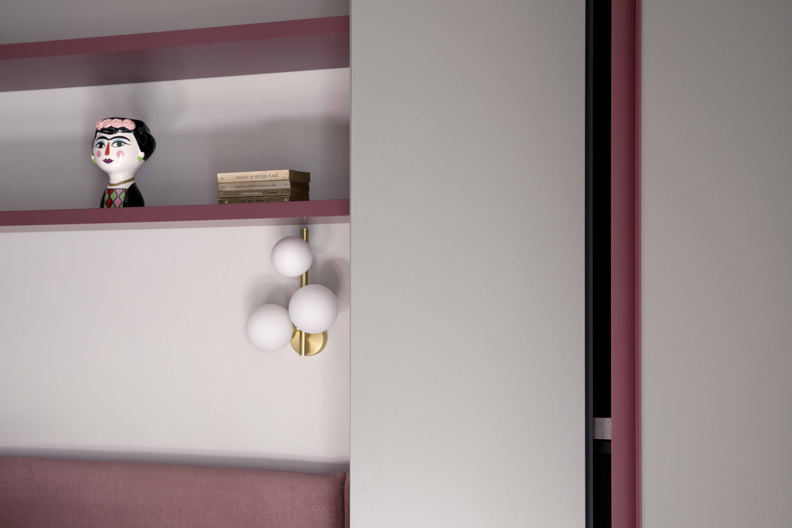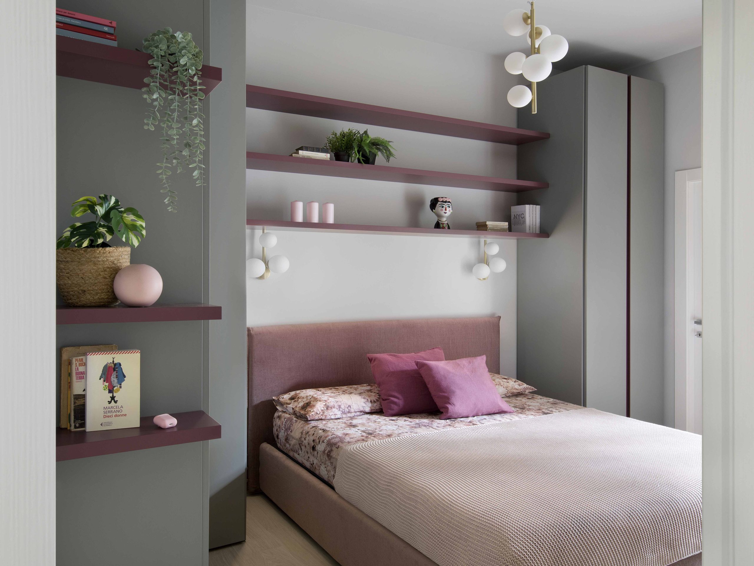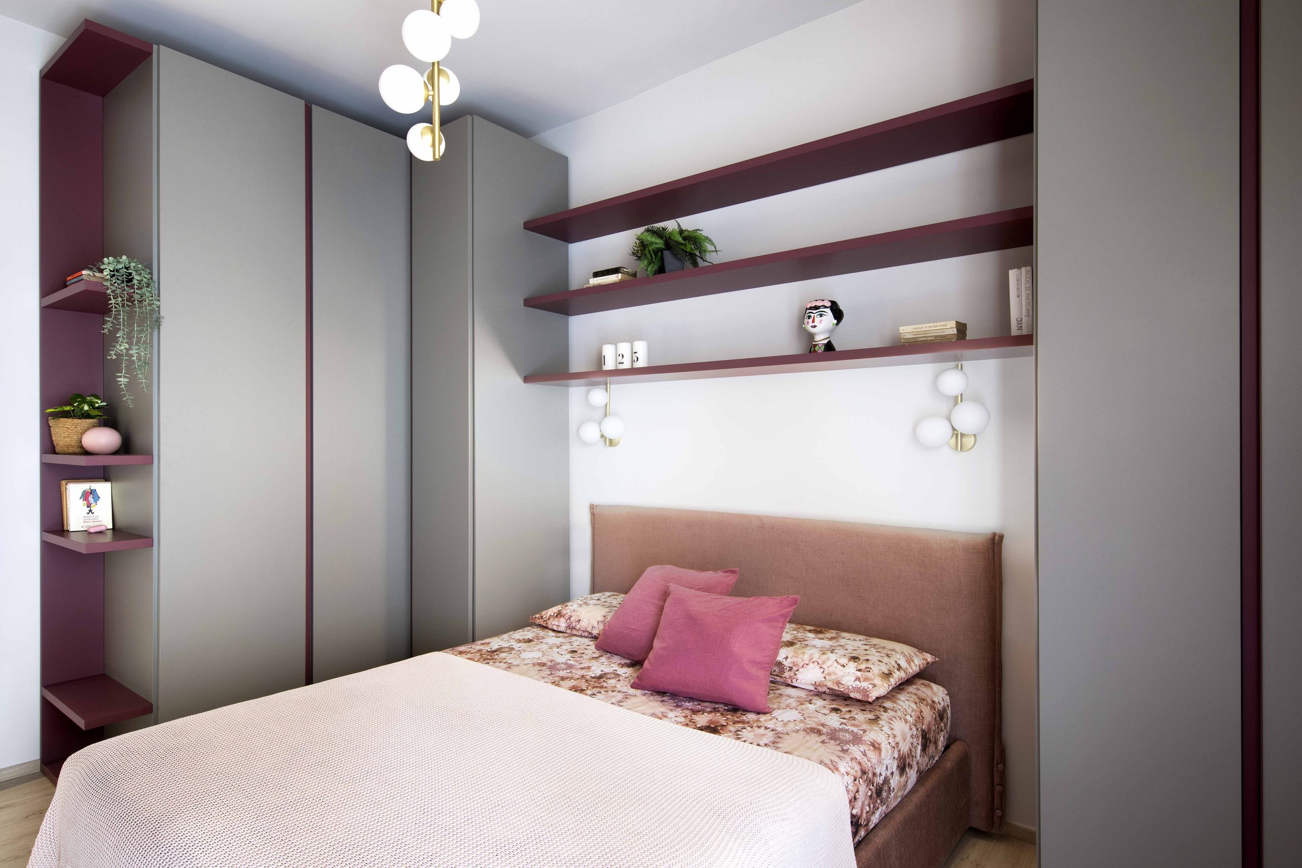 L’armadiatura, non essendo primaria la funzione contenitiva, si interrompe per lasciare spazio a mensole colorate che incorniciano il letto, rendendo la stanza giovane e personale.