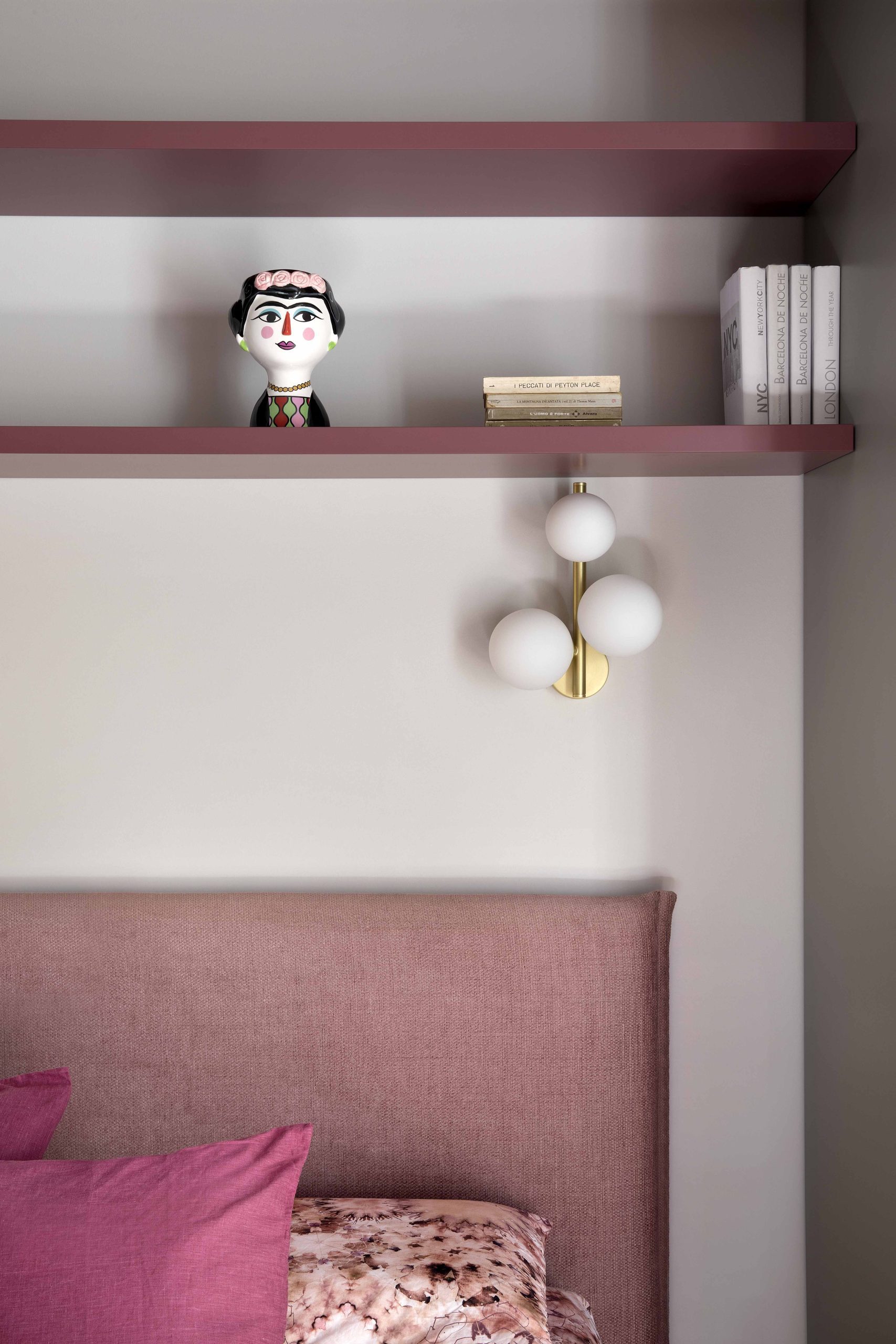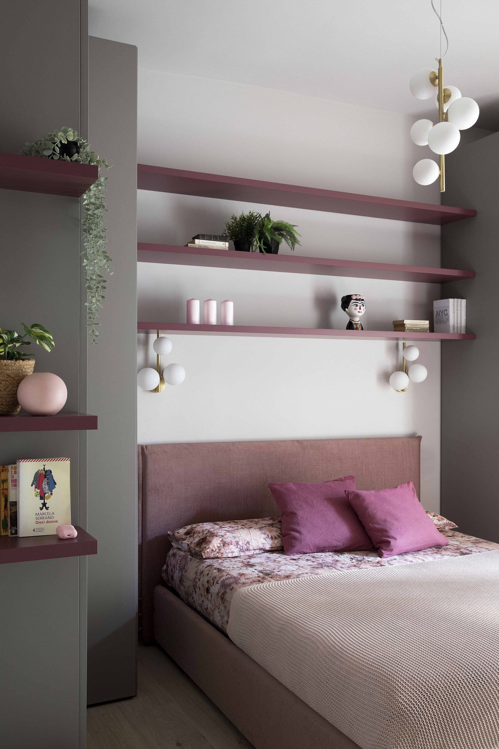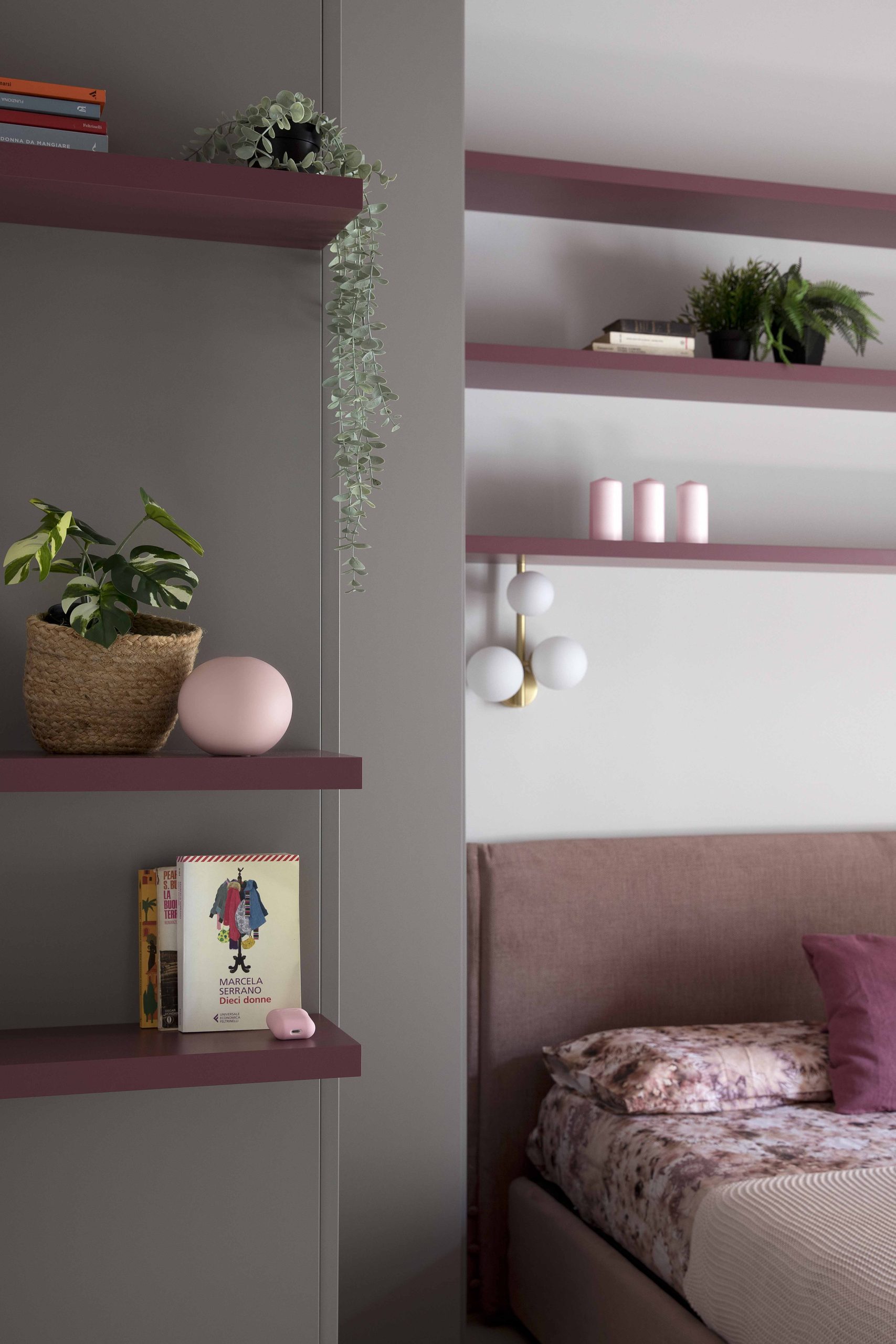 L’armadiatura, non essendo primaria la funzione contenitiva, si interrompe per lasciare spazio a mensole colorate che incorniciano il letto, rendendo la stanza giovane e personale.