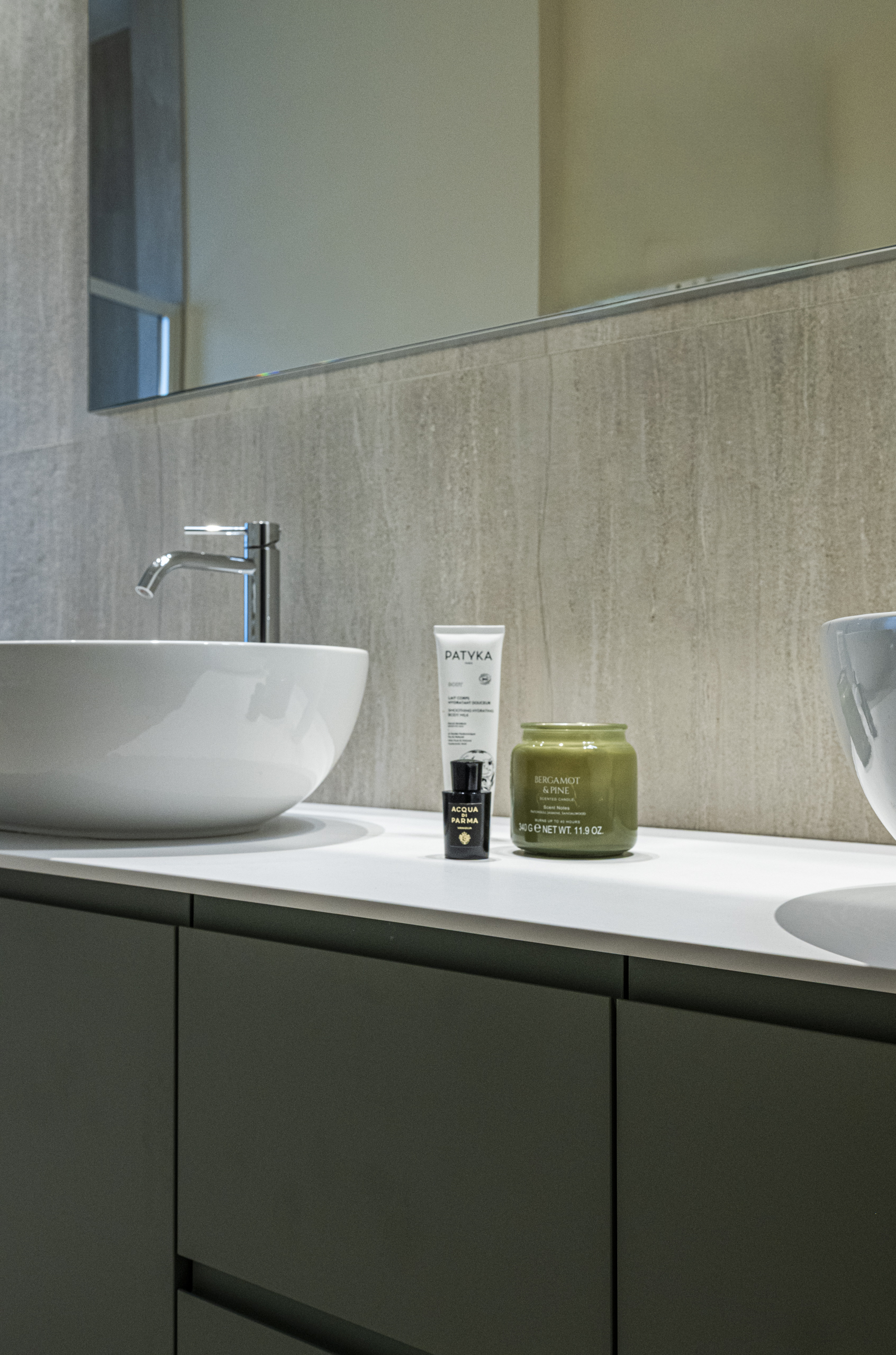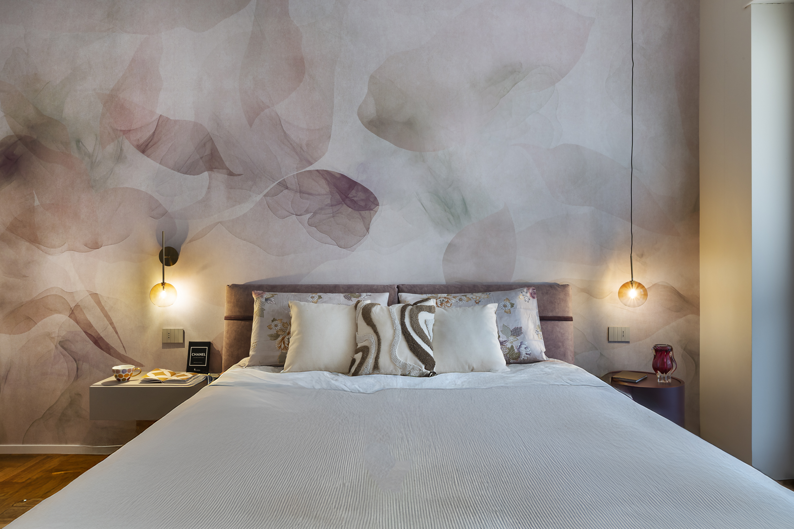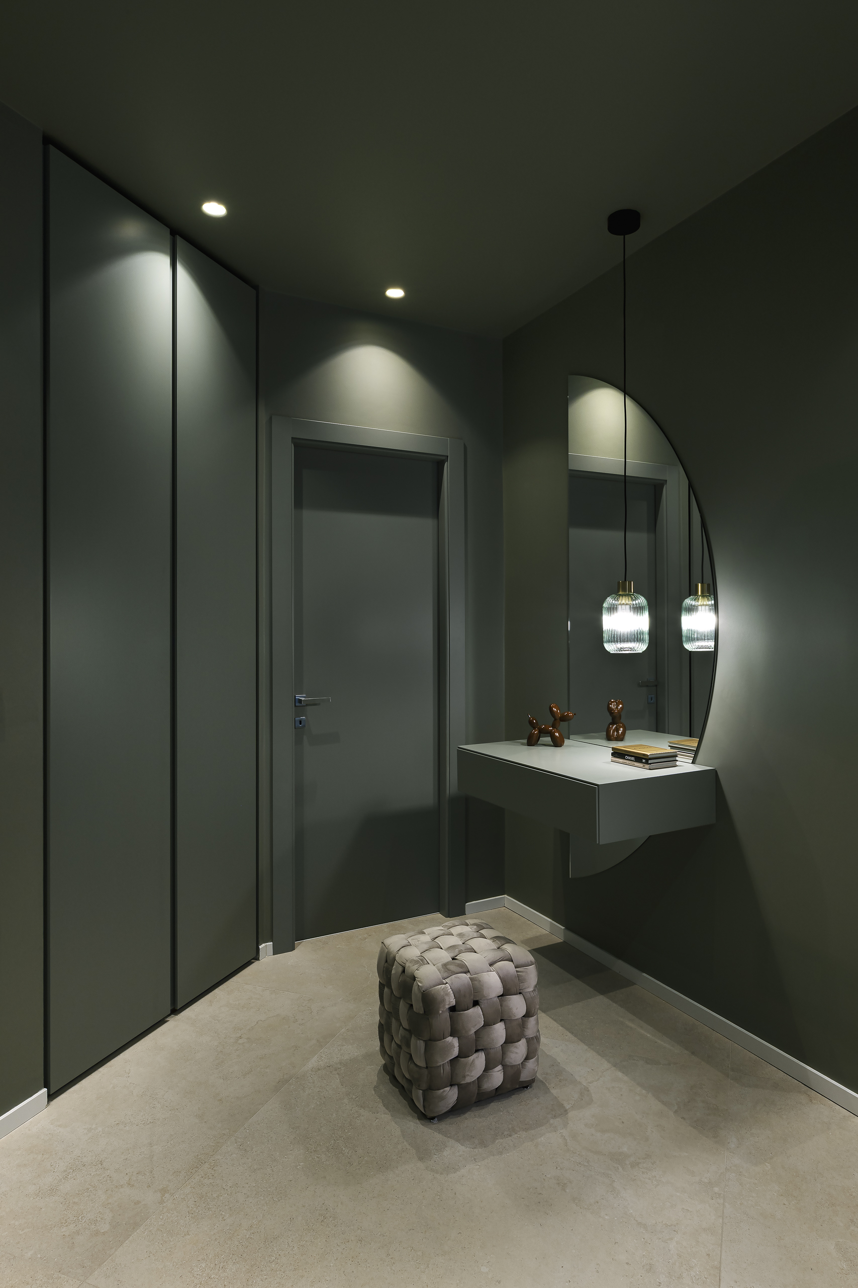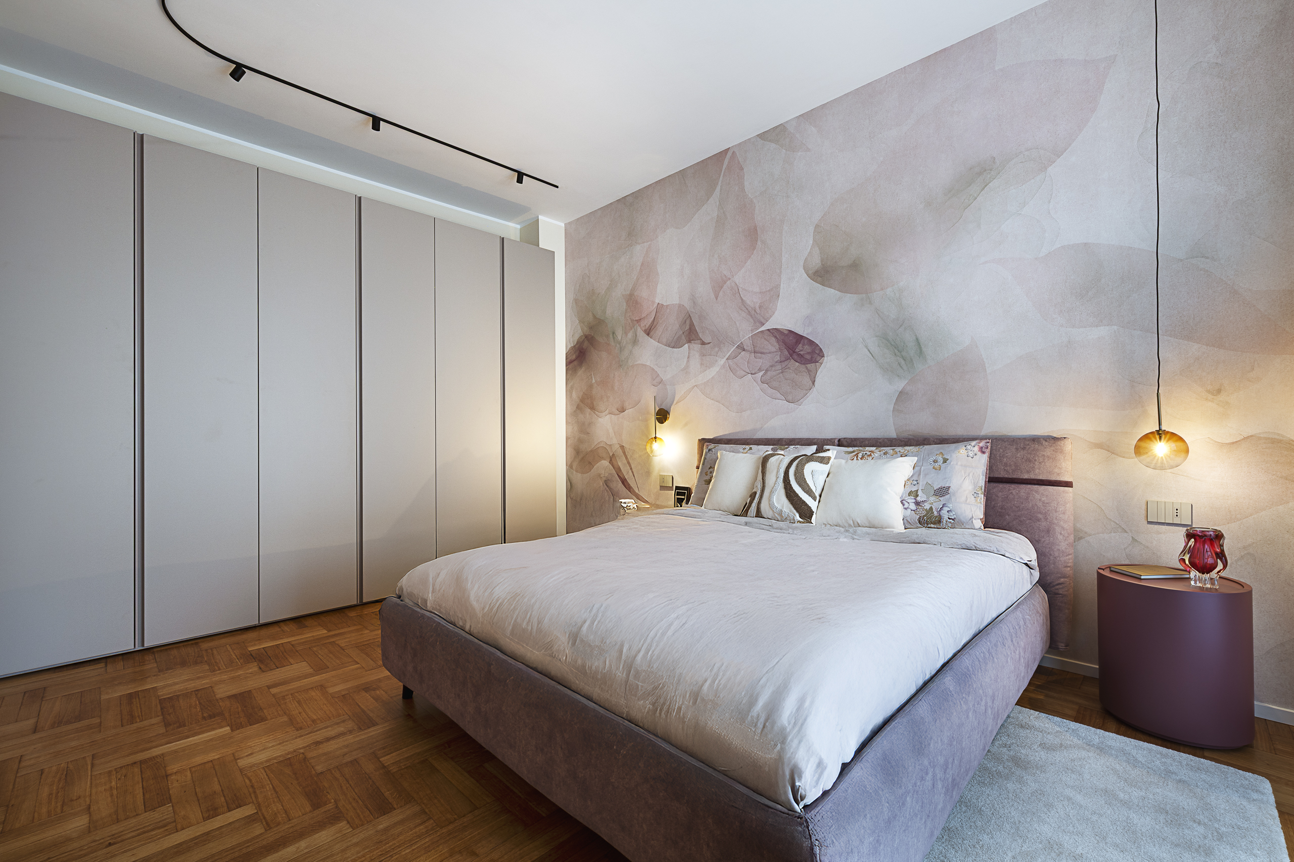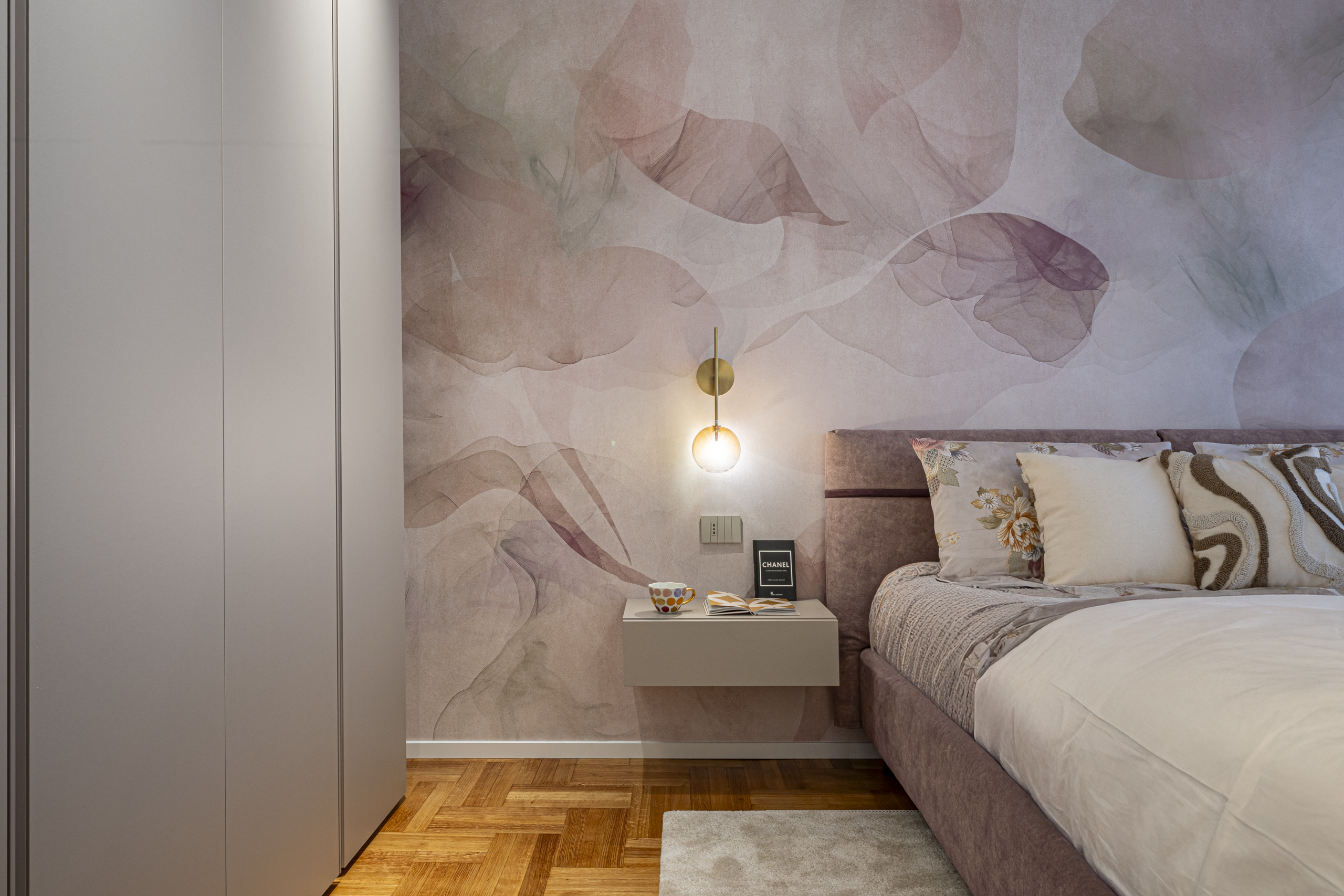Lo stile scelto per questo progetto di interior design è un contemporaneo chic, caratterizzato da boiserie leggere, carte da parati eleganti e una palette cromatica raffinata. Il verde salvia è il colore principale degli interni, affiancato da tonalità di rosa antico nella camera padronale, per creare un’atmosfera calda, equilibrata e accogliente.