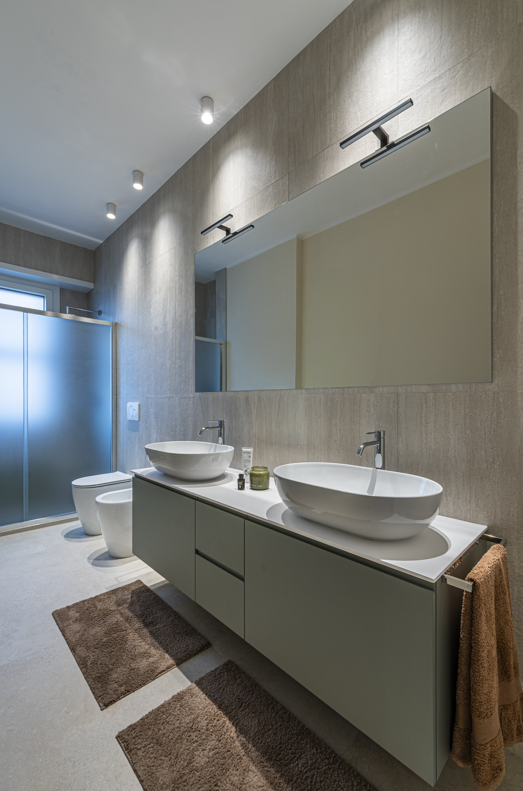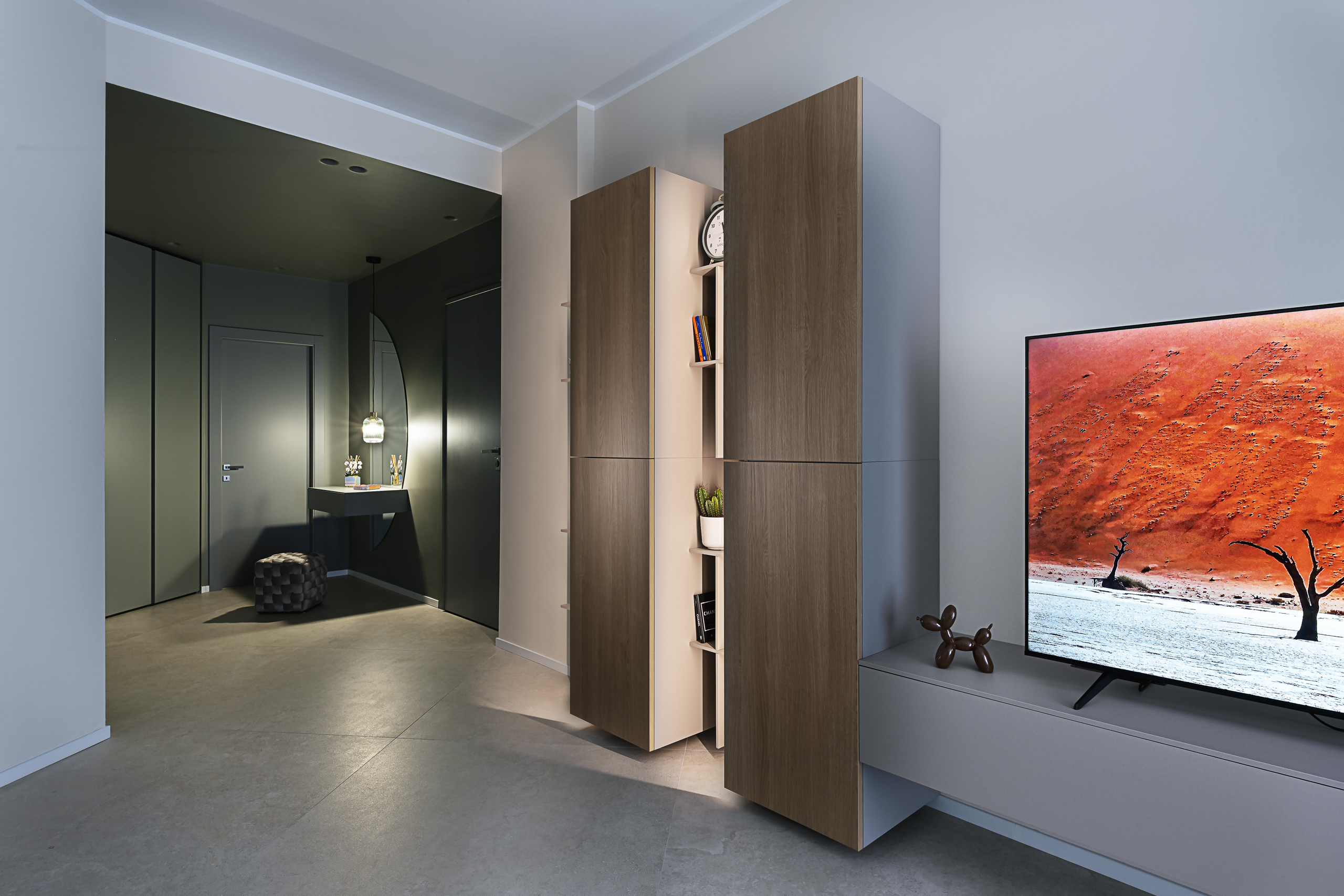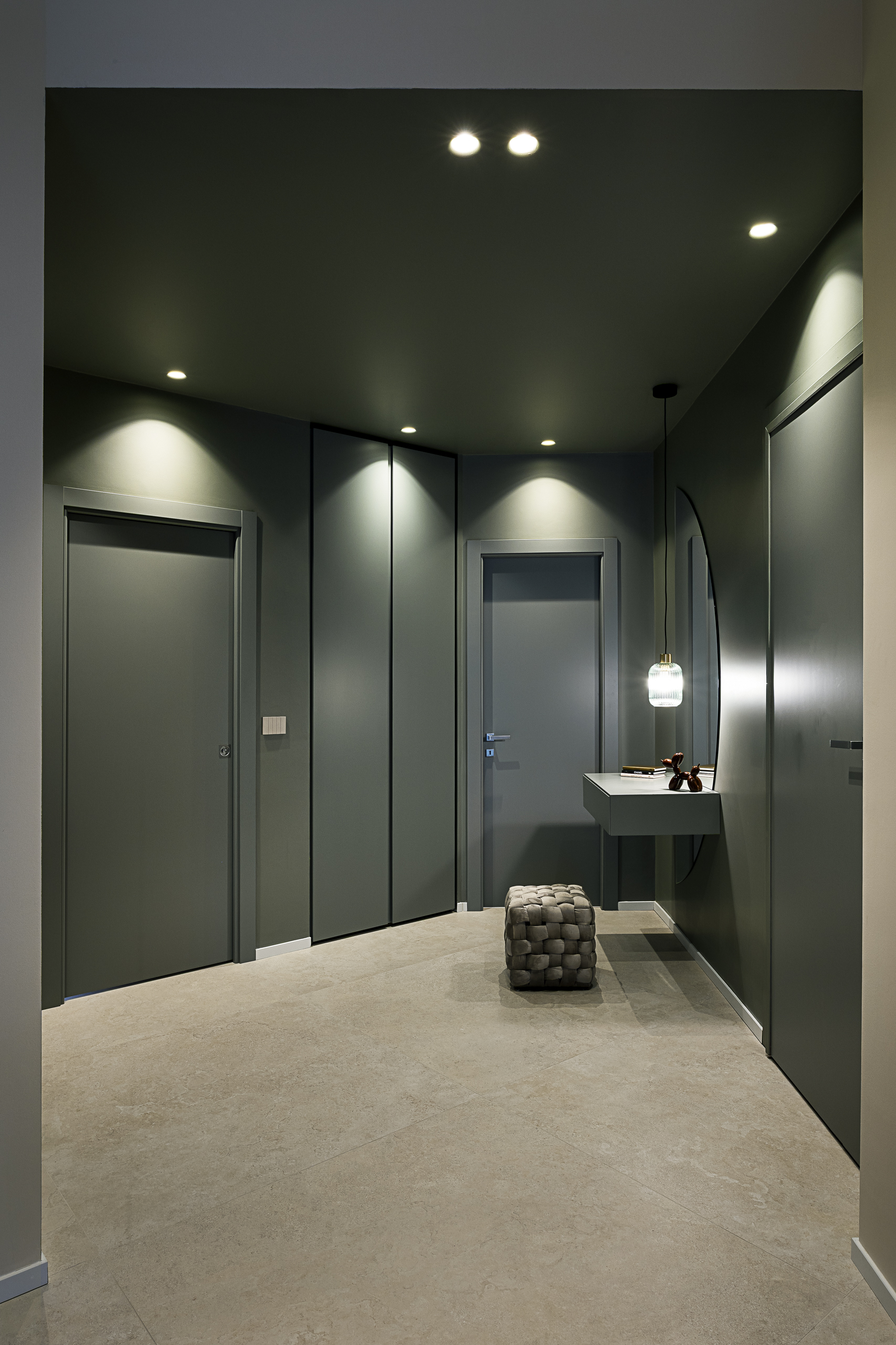La distribuzione originale degli spazi presentava una pianta poco fluida e diverse aree difficili da sfruttare. L’intervento progettuale si è quindi concentrato sull’ottimizzazione degli ambienti, mantenendo l’impianto strutturale esistente e lavorando su soluzioni su misura, in particolare armadiature integrate, nicchie contenitive e arredi personalizzati.